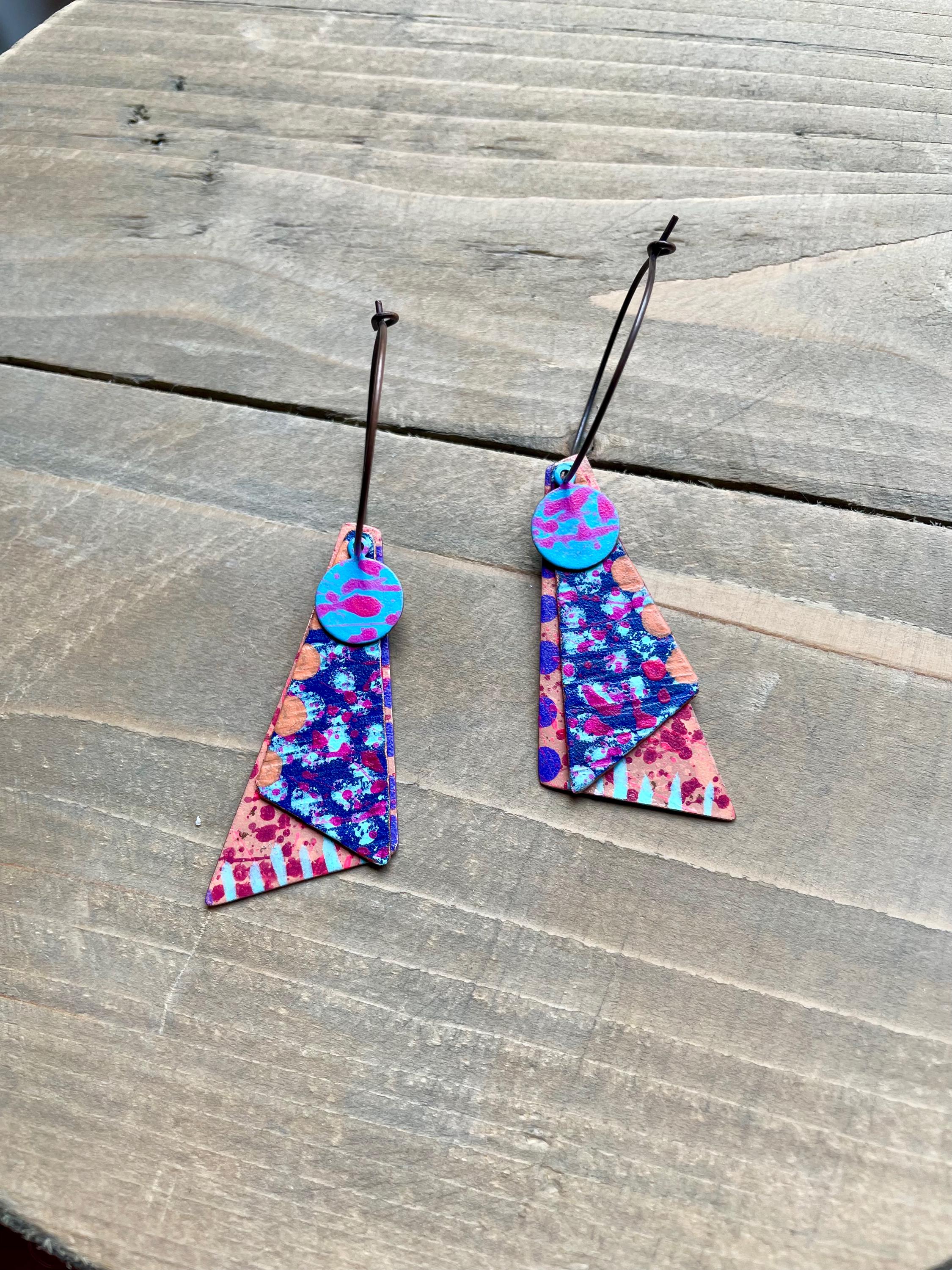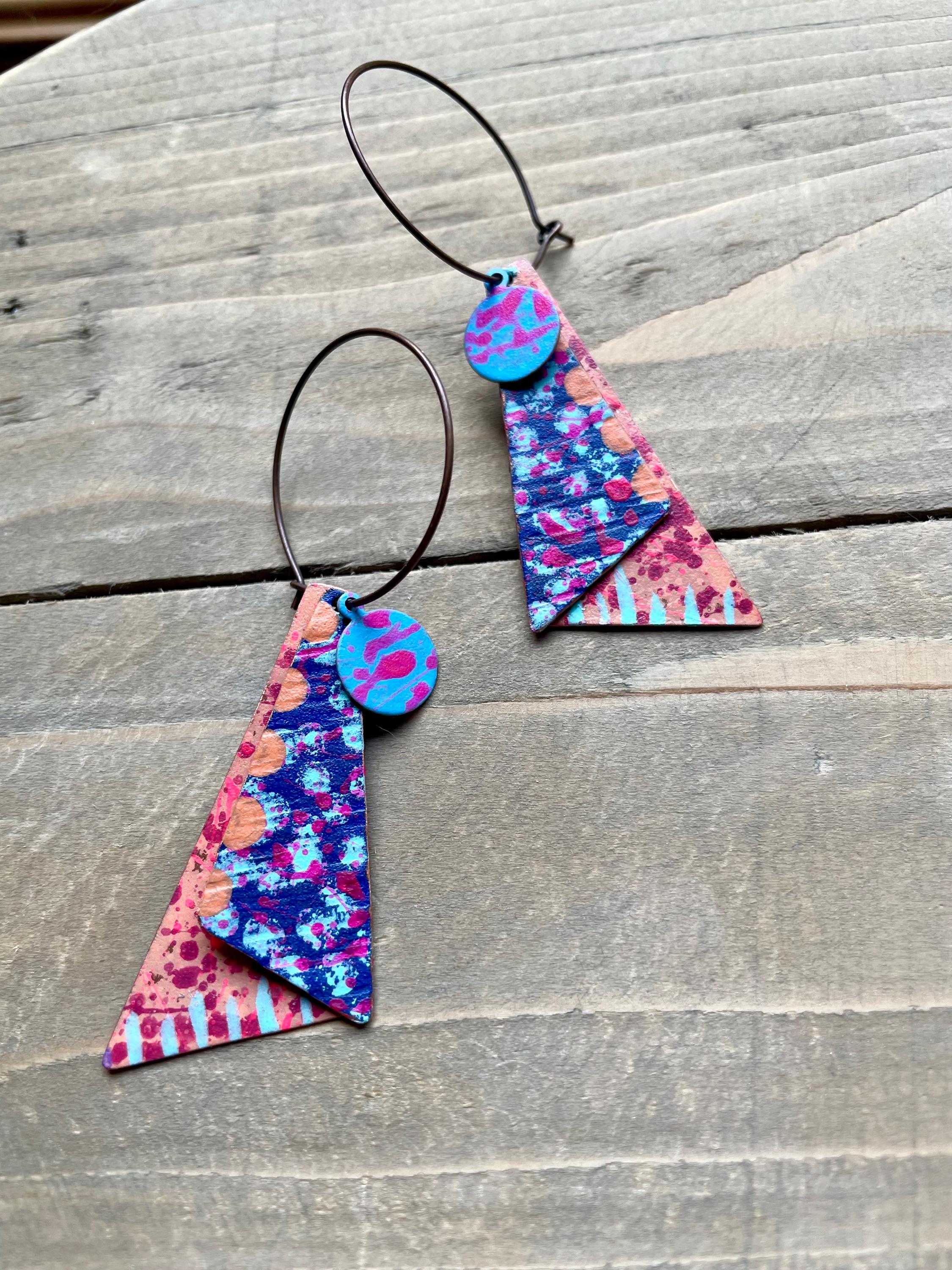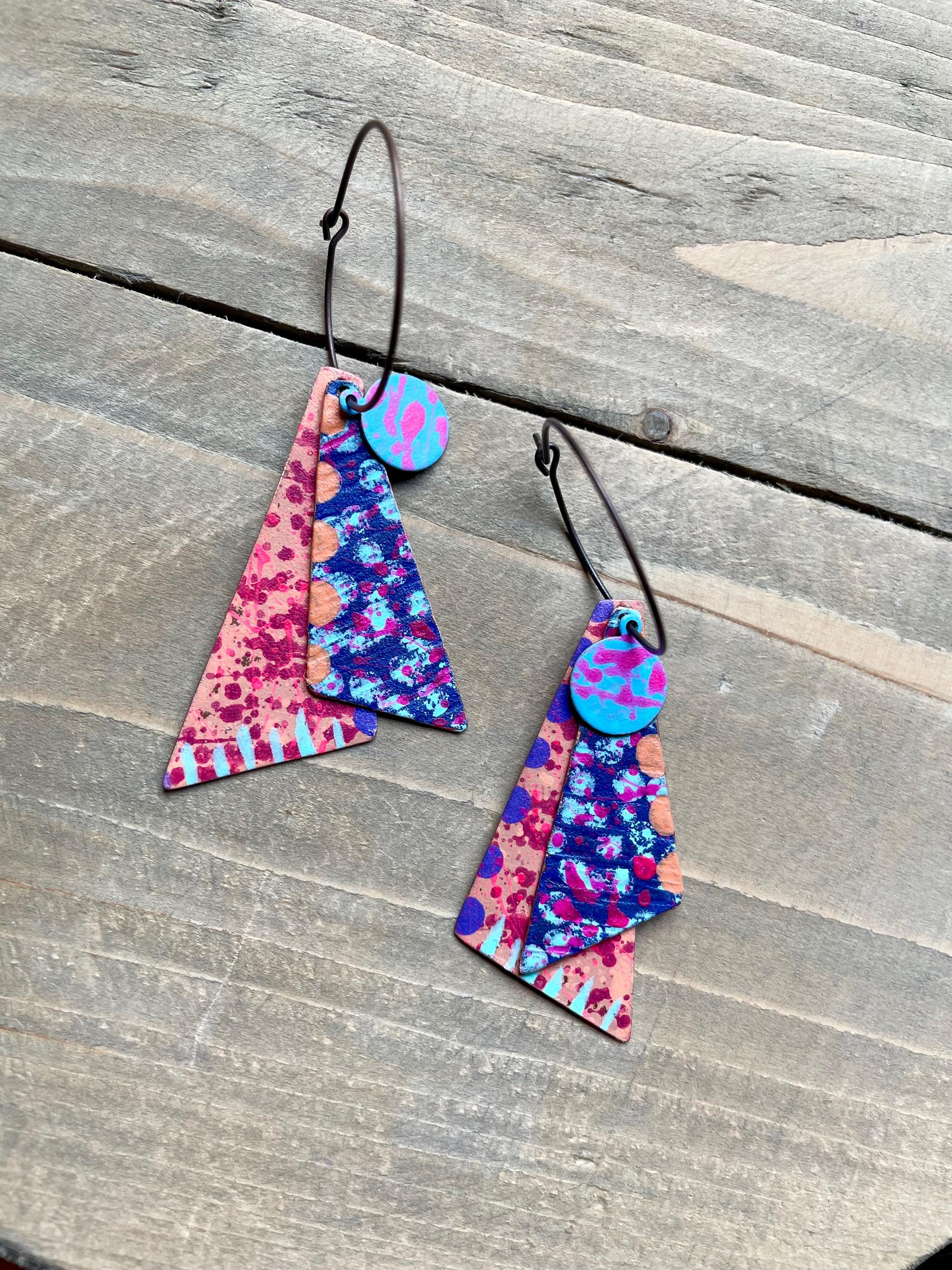 Handcrafted copper earrings. These earrings are formed from three pieces of solid copper and then each hand painted to achieve a multi-color patina. Finished with a matte protective sealant. Each pair of earrings are one of a kind, please allow some slight variances in design and color.
