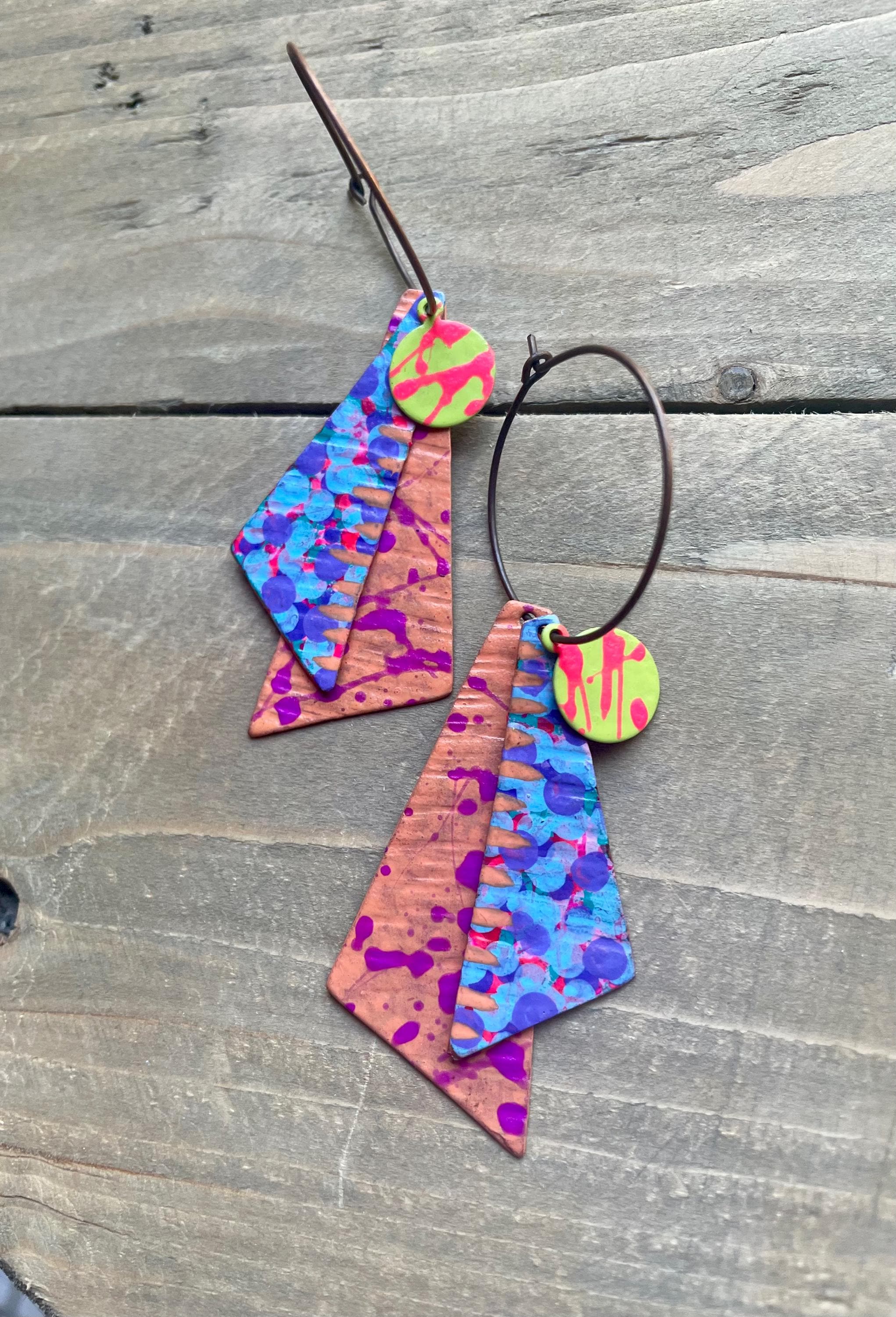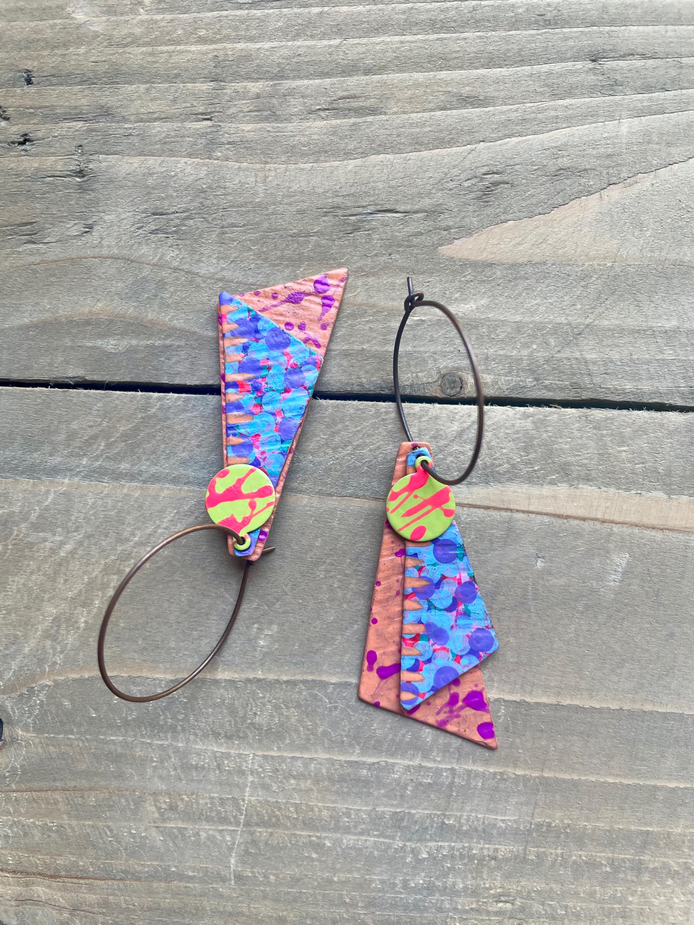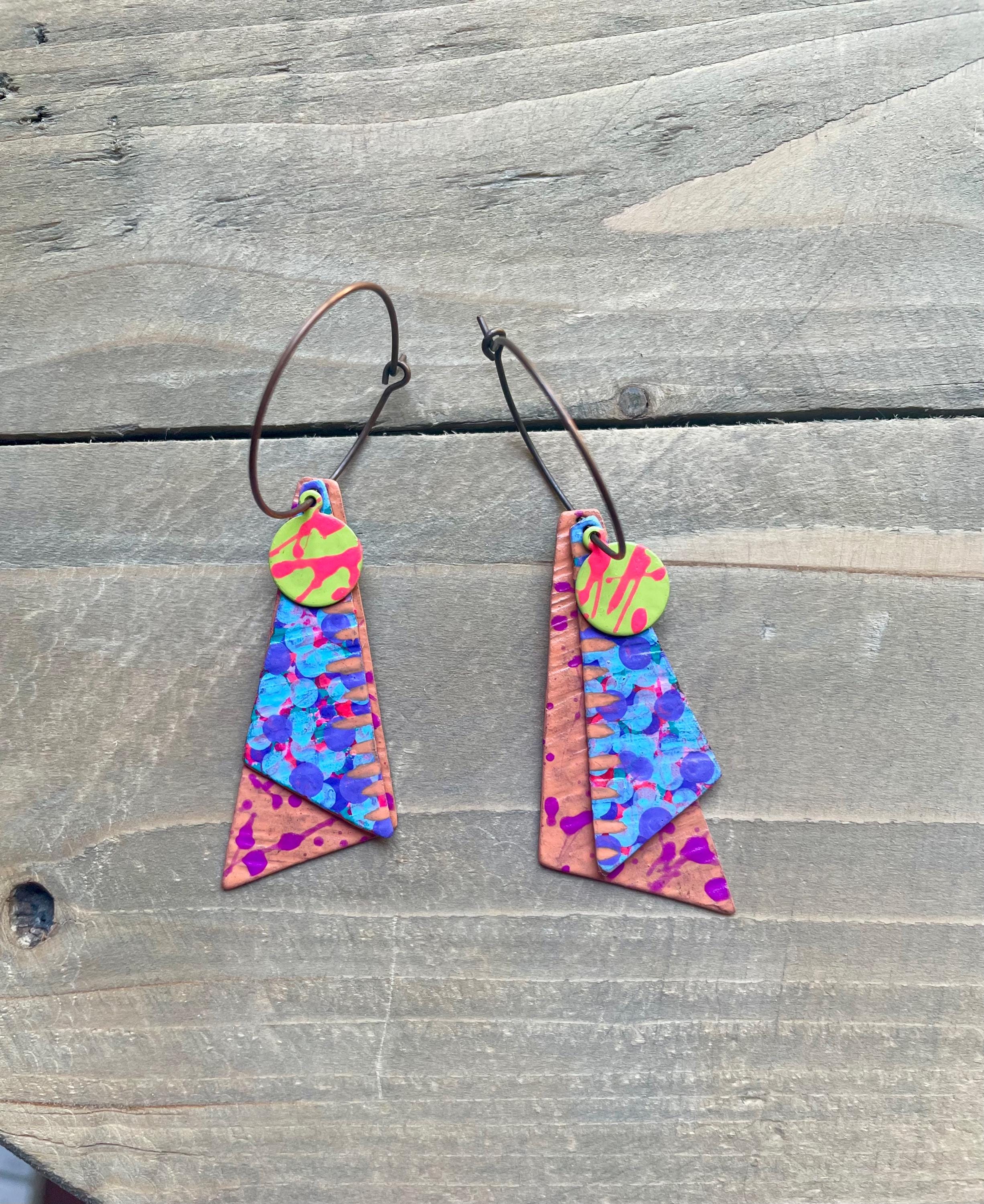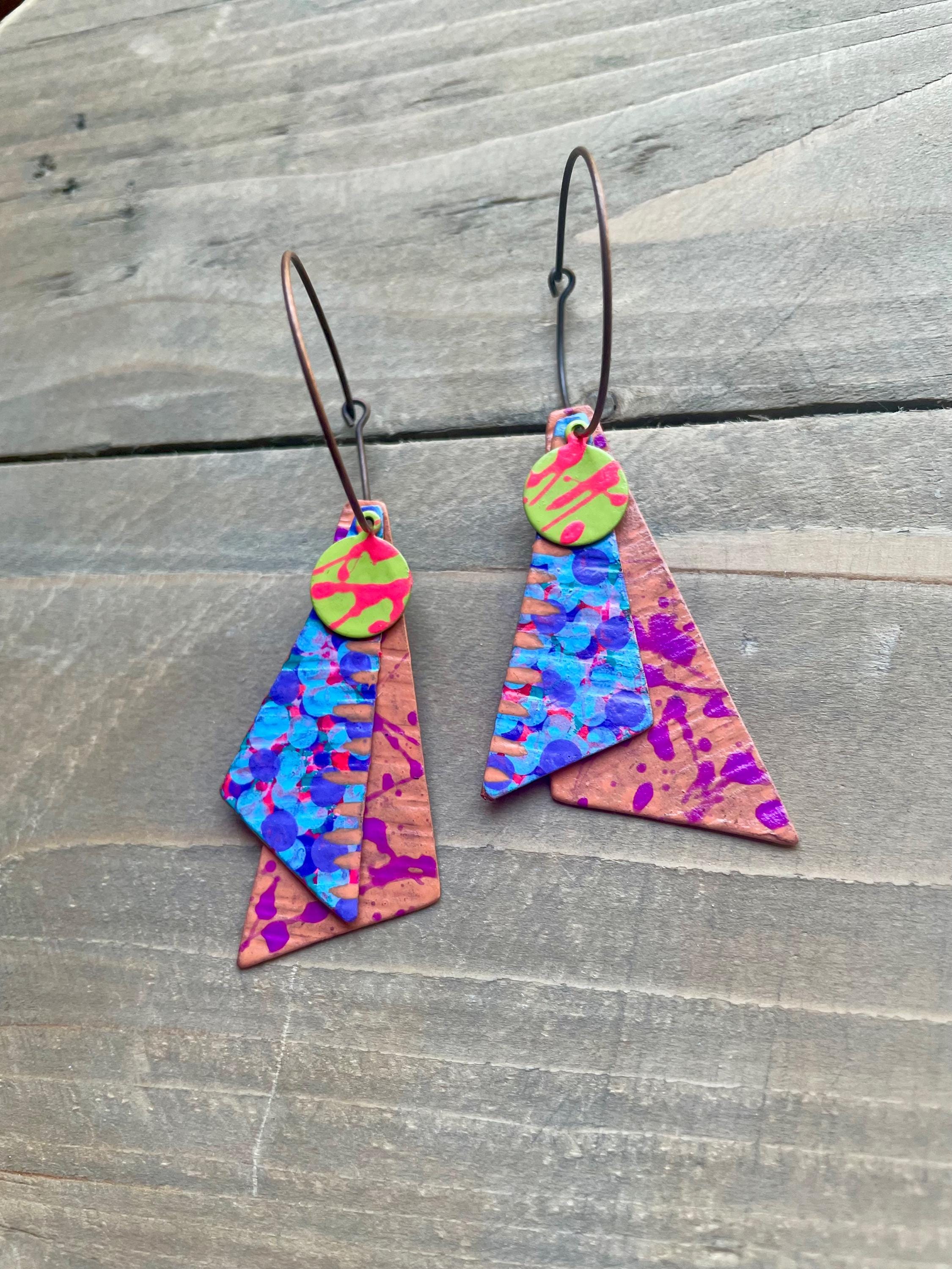 Handcrafted copper earrings. These earrings are formed from three pieces of solid copper and then each hand painted to achieve a multi-color patina. Finished with a matte protective sealant. Each pair of earrings are one of a kind, please allow some slight variances in design and color.