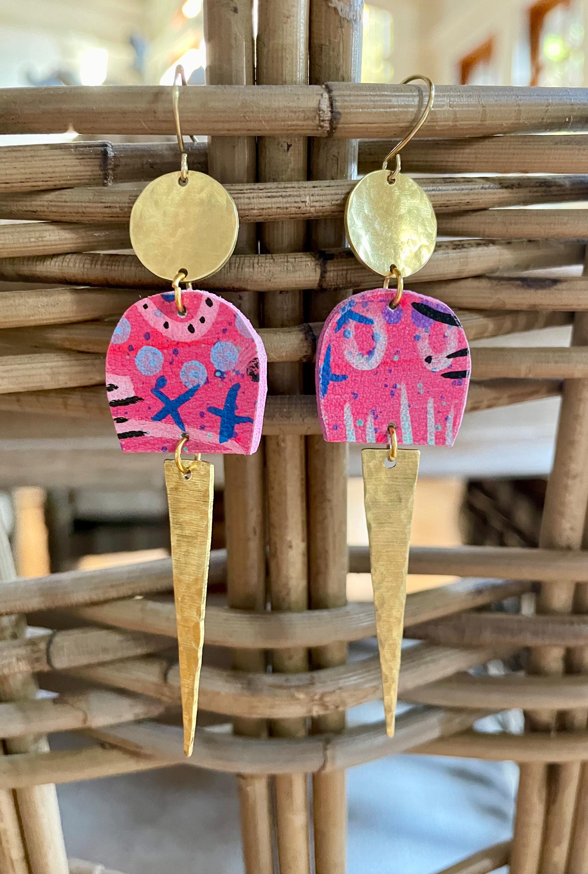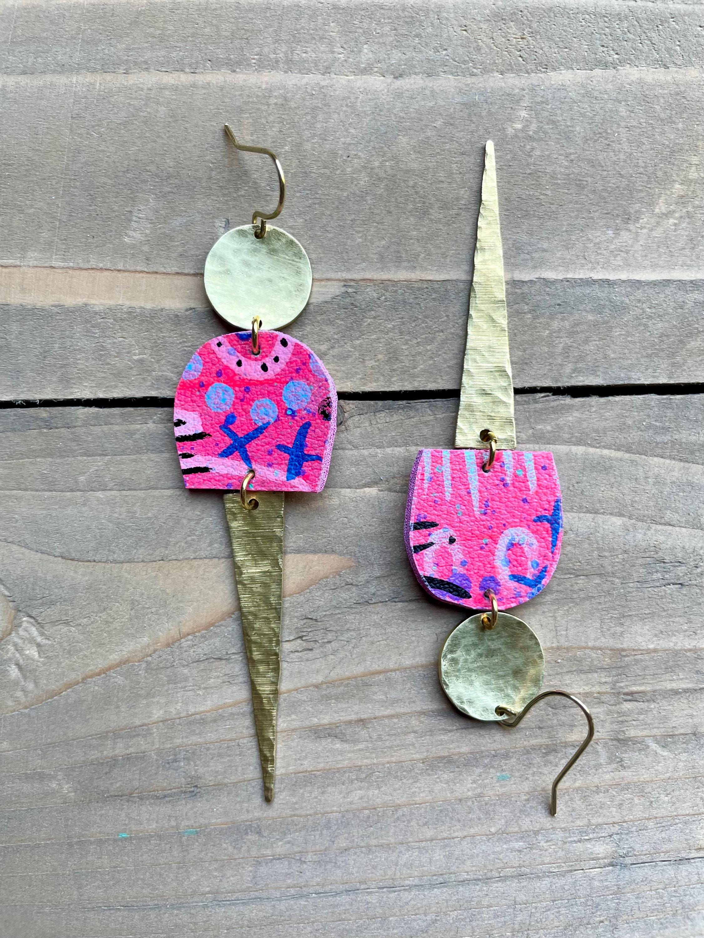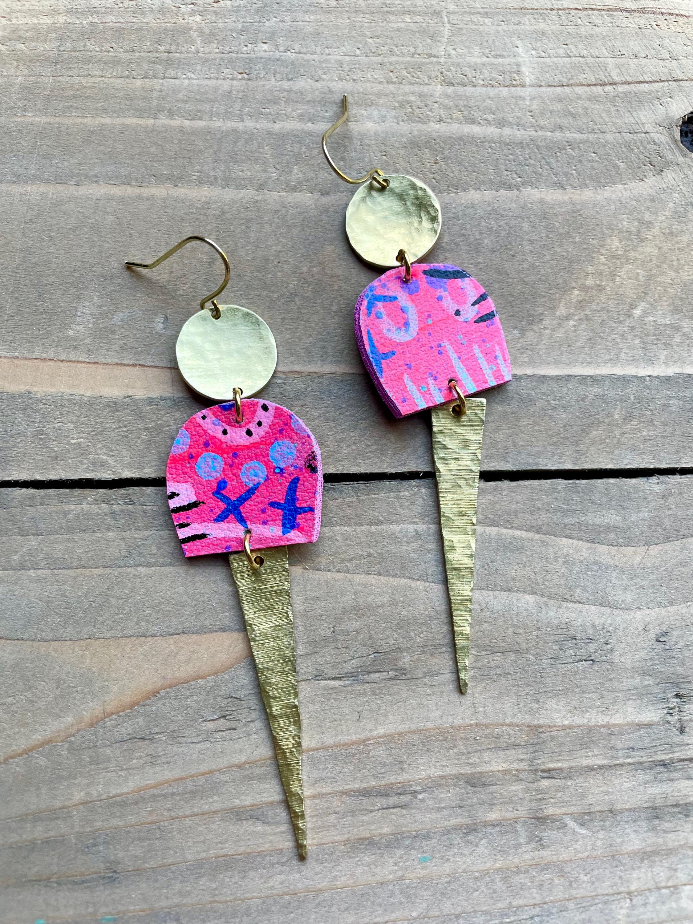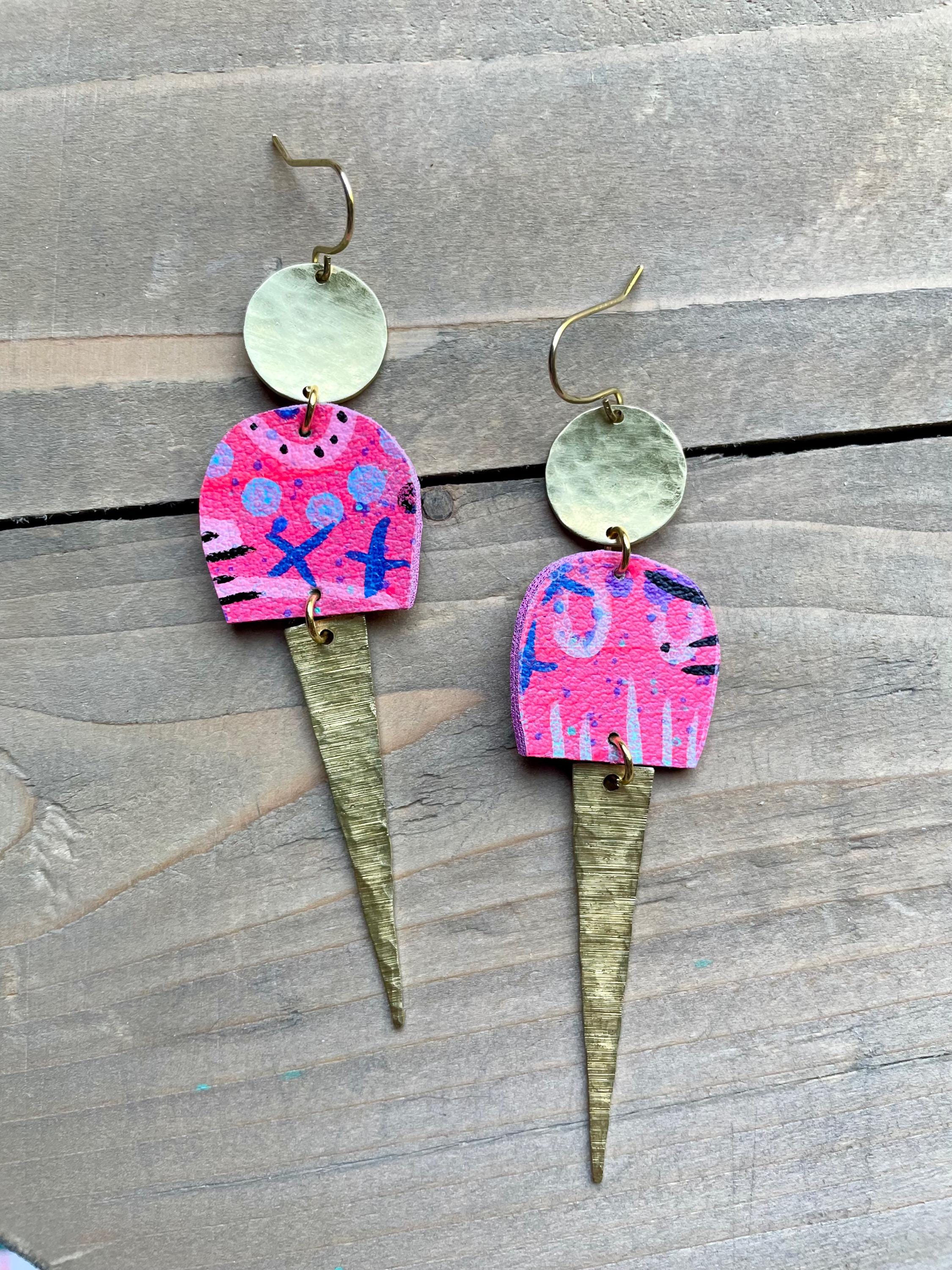 Mix Media Dangle Earrings are formed from hammered solid brass and hand painted vegan leather. Finished with a matte protective sealant. Each pair of earrings are one of a kind, please allow some slight variances in design and color.