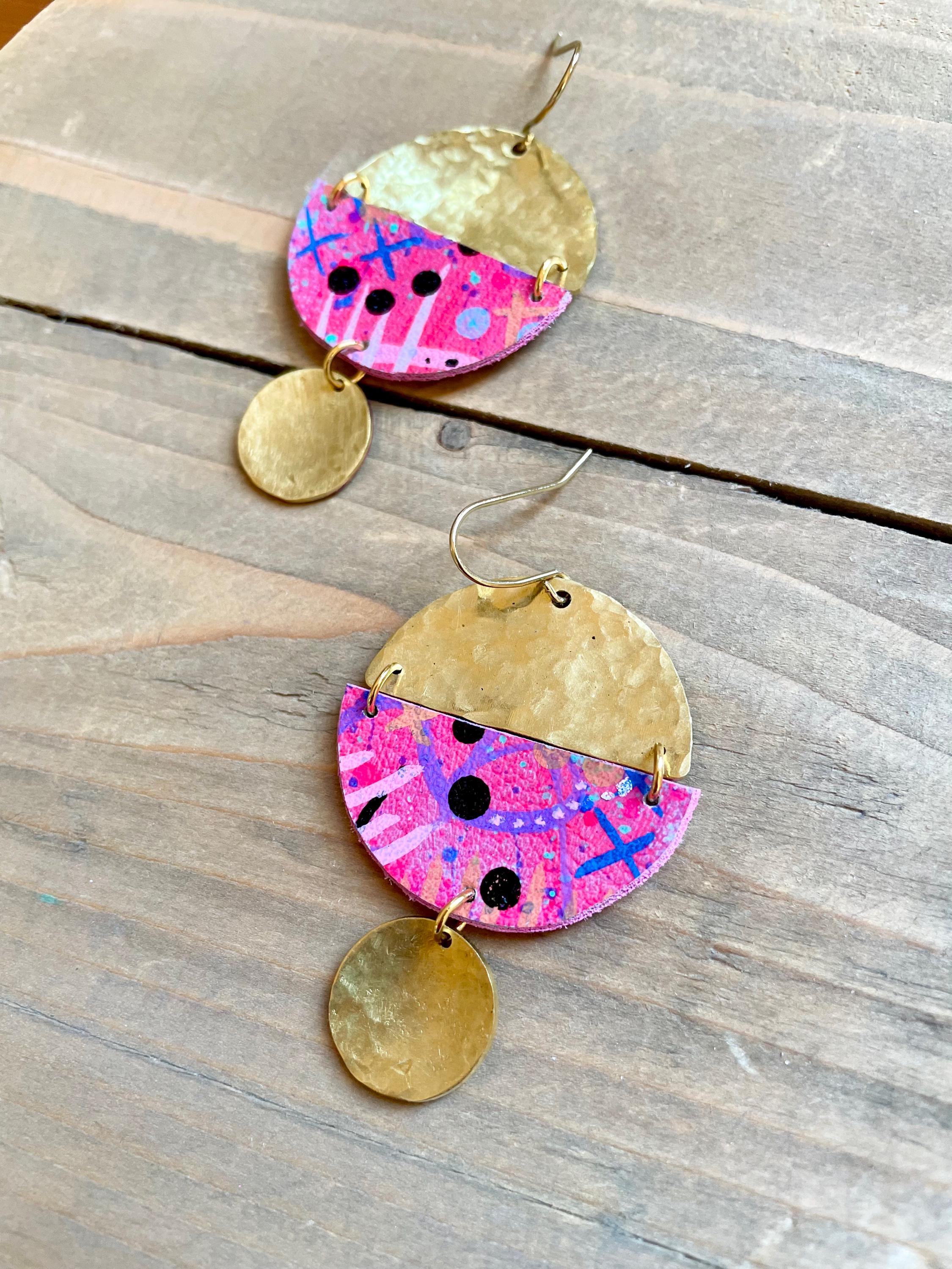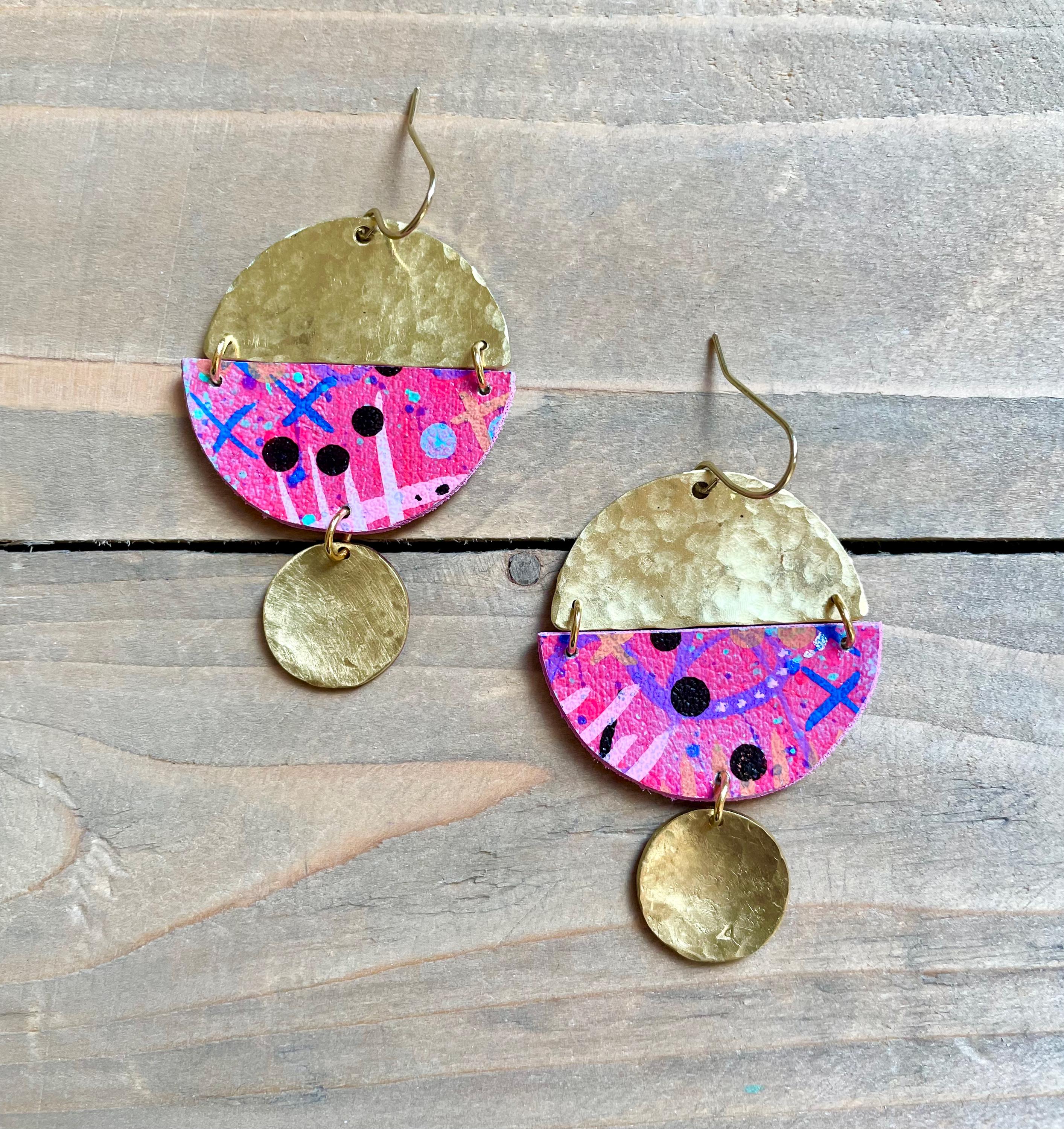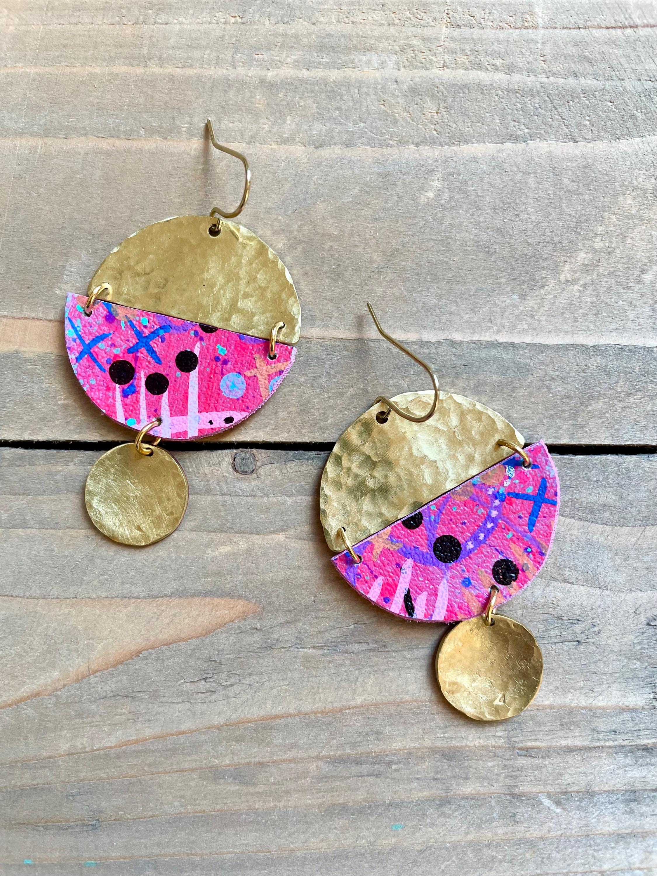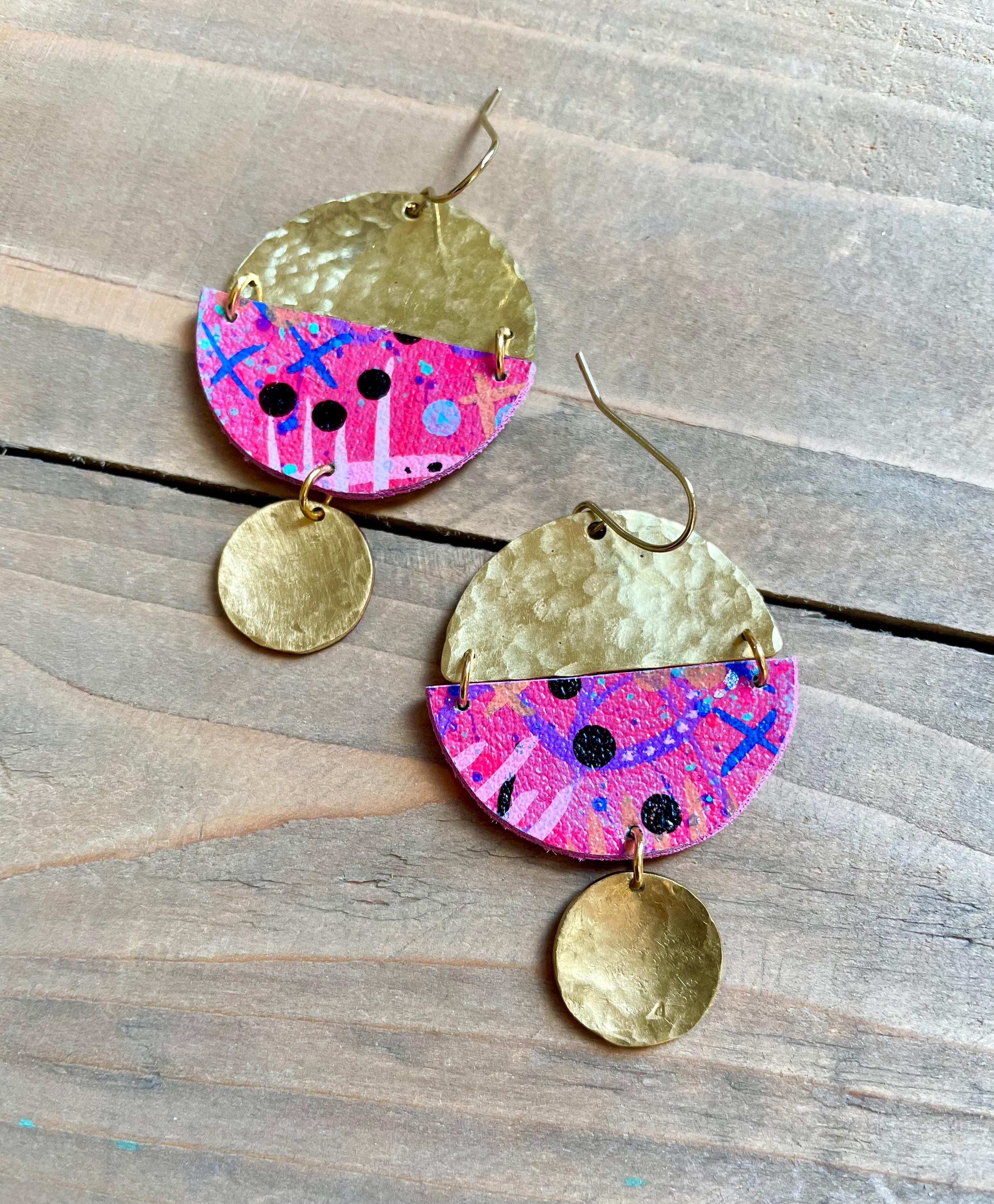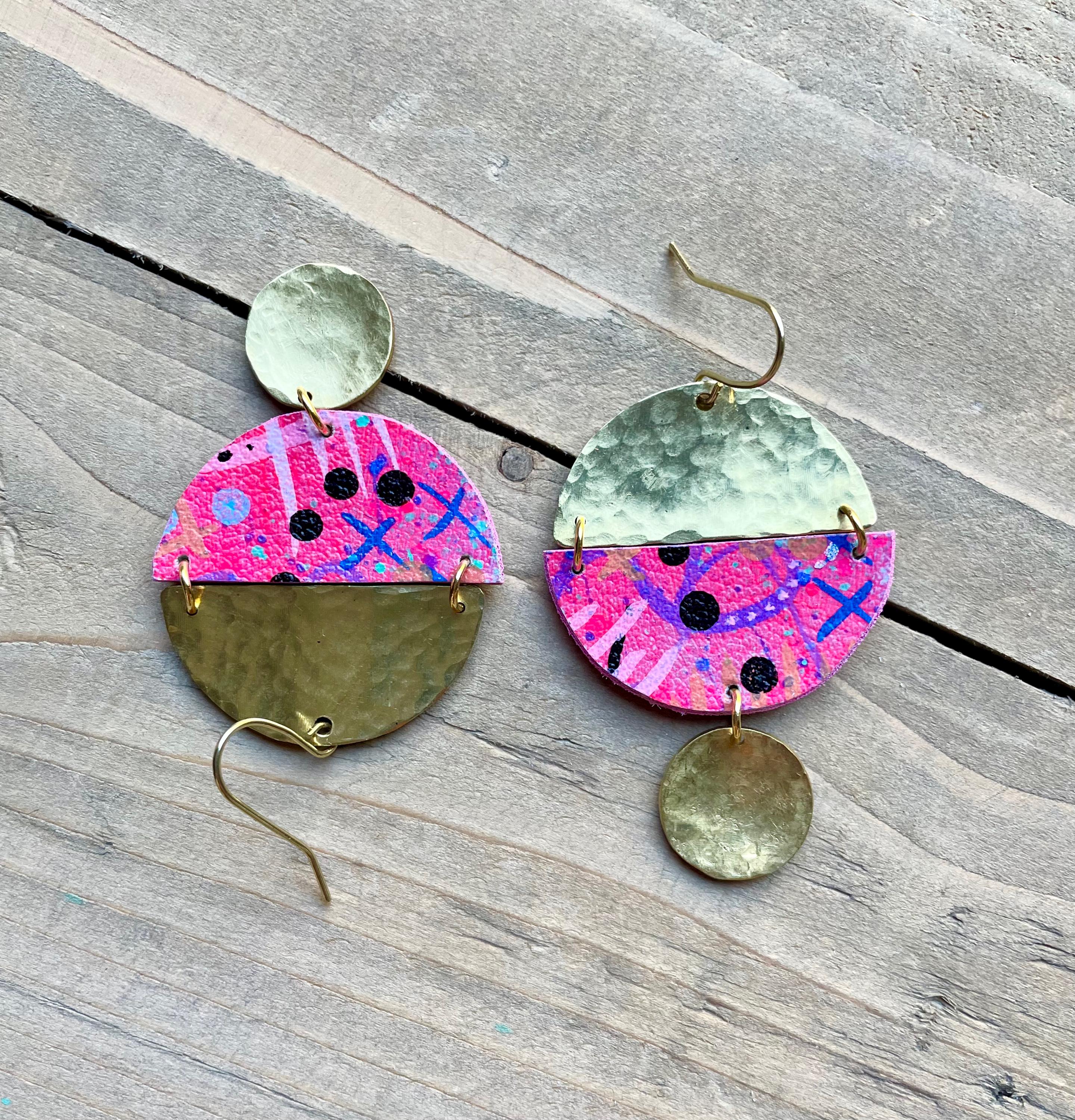 Mix Media Dangle Earrings are formed from hammered solid brass and hand painted vegan leather. Finished with a matte protective sealant. Each pair of earrings are one of a kind, please allow some slight variances in design and color.