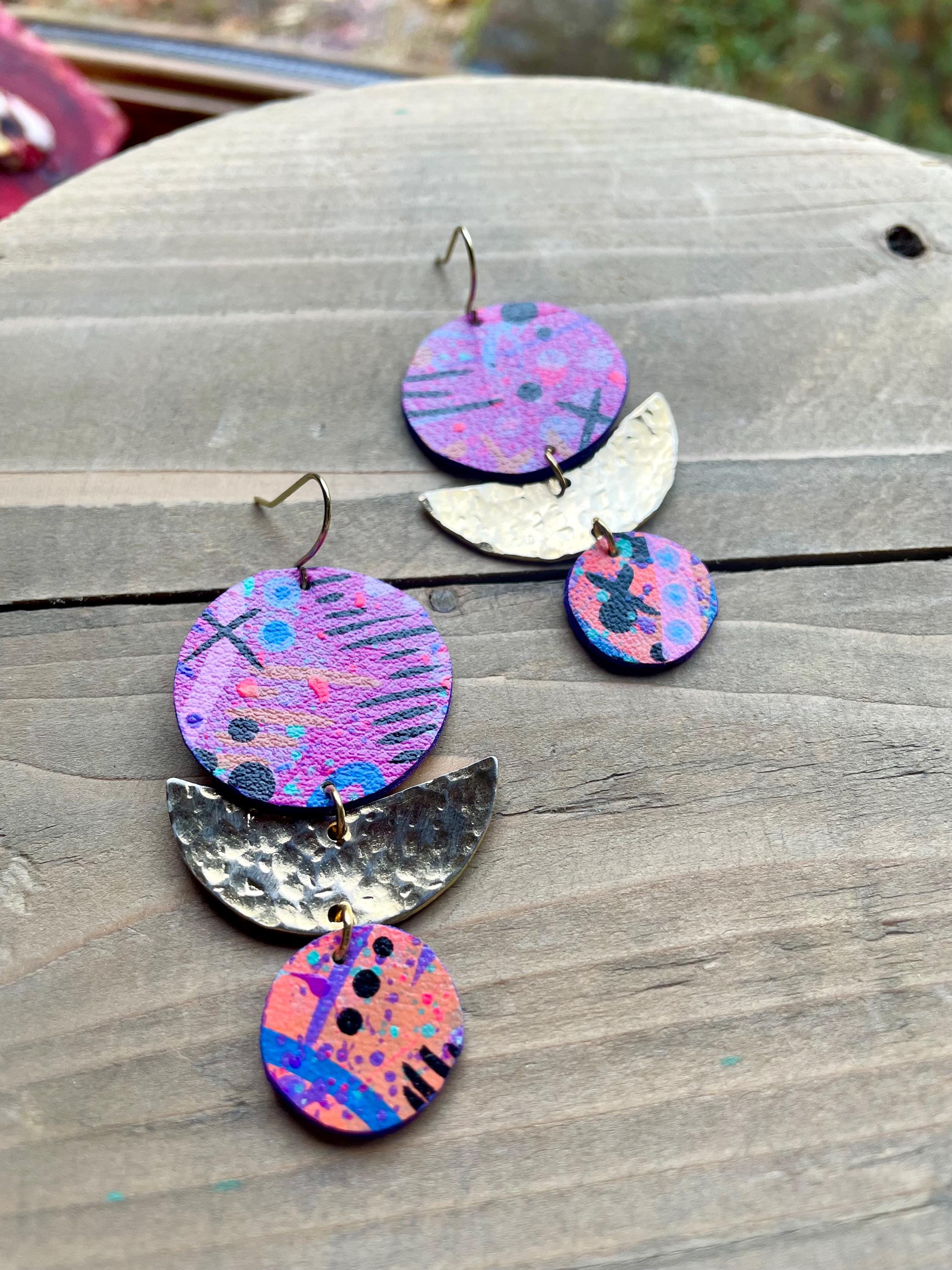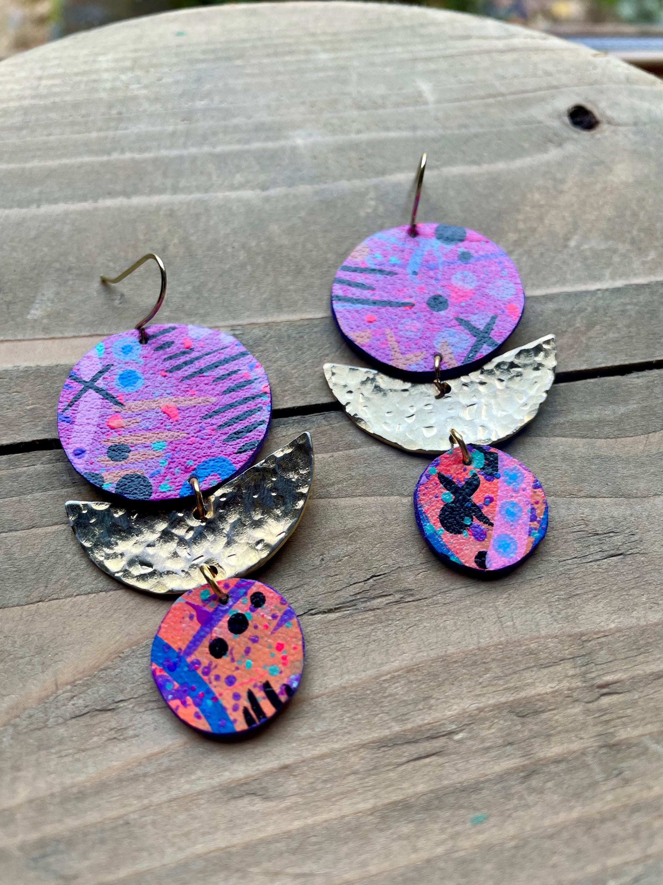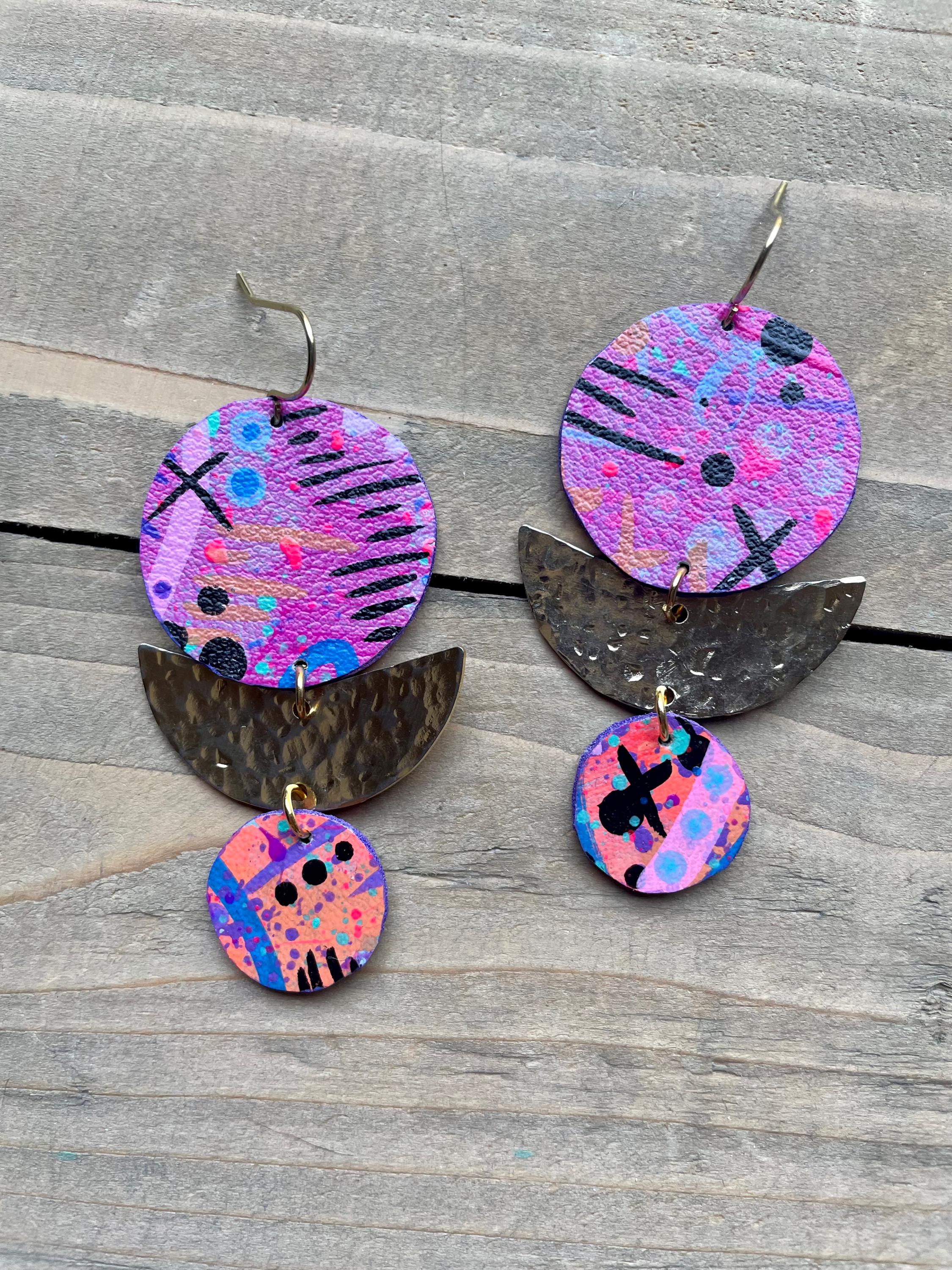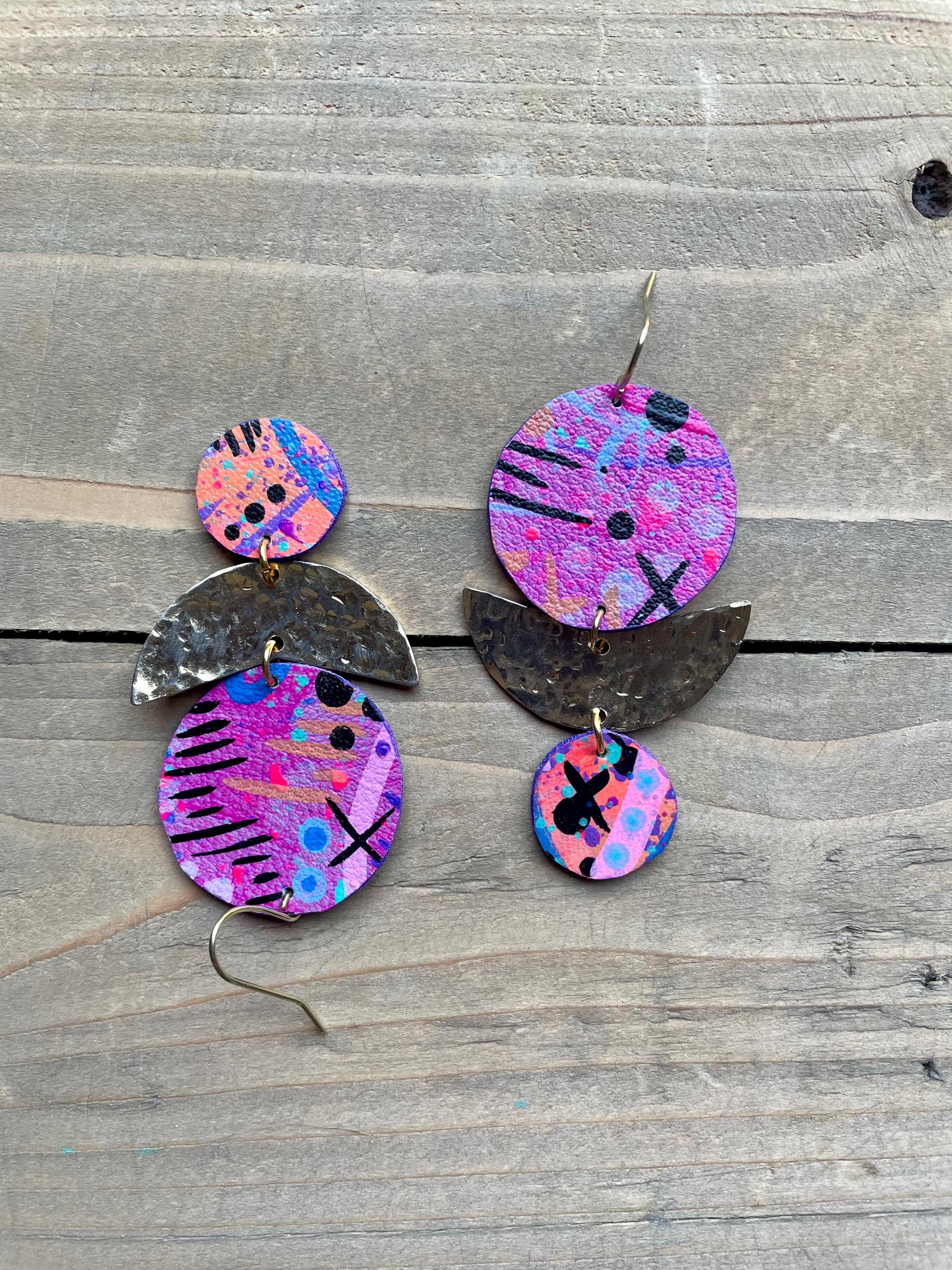 Mix Media Dangle Earrings are formed from hammered solid brass and hand painted vegan leather. Finished with a matte protective sealant. Each pair of earrings are one of a kind, please allow some slight variances in design and color.