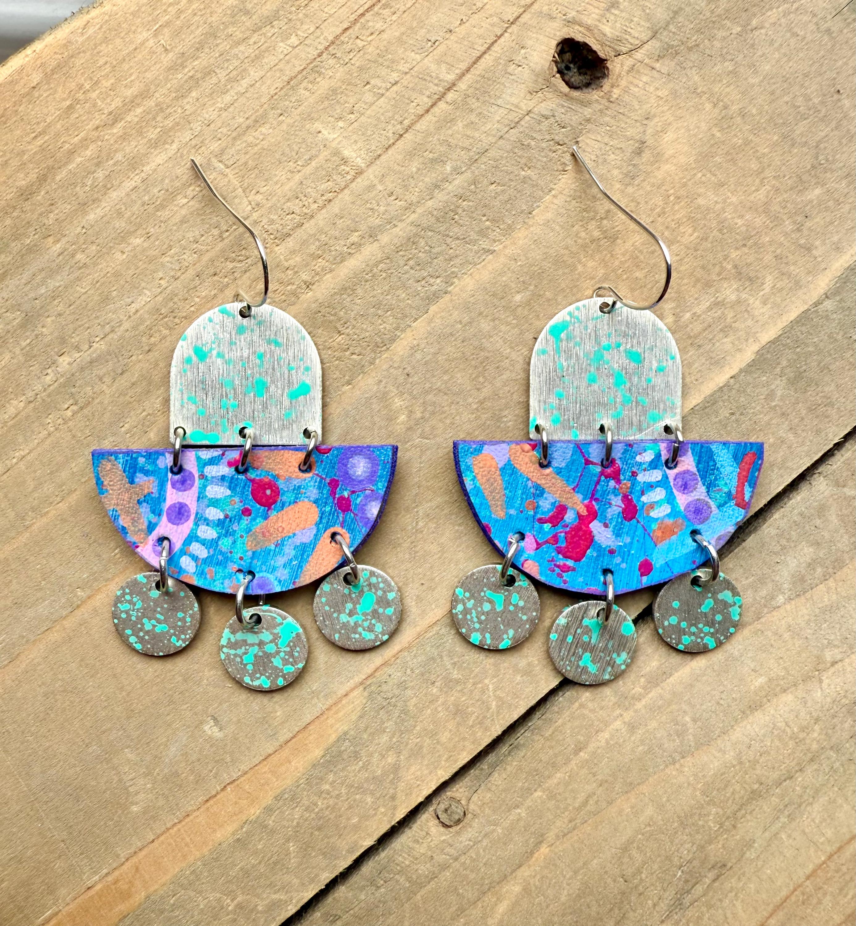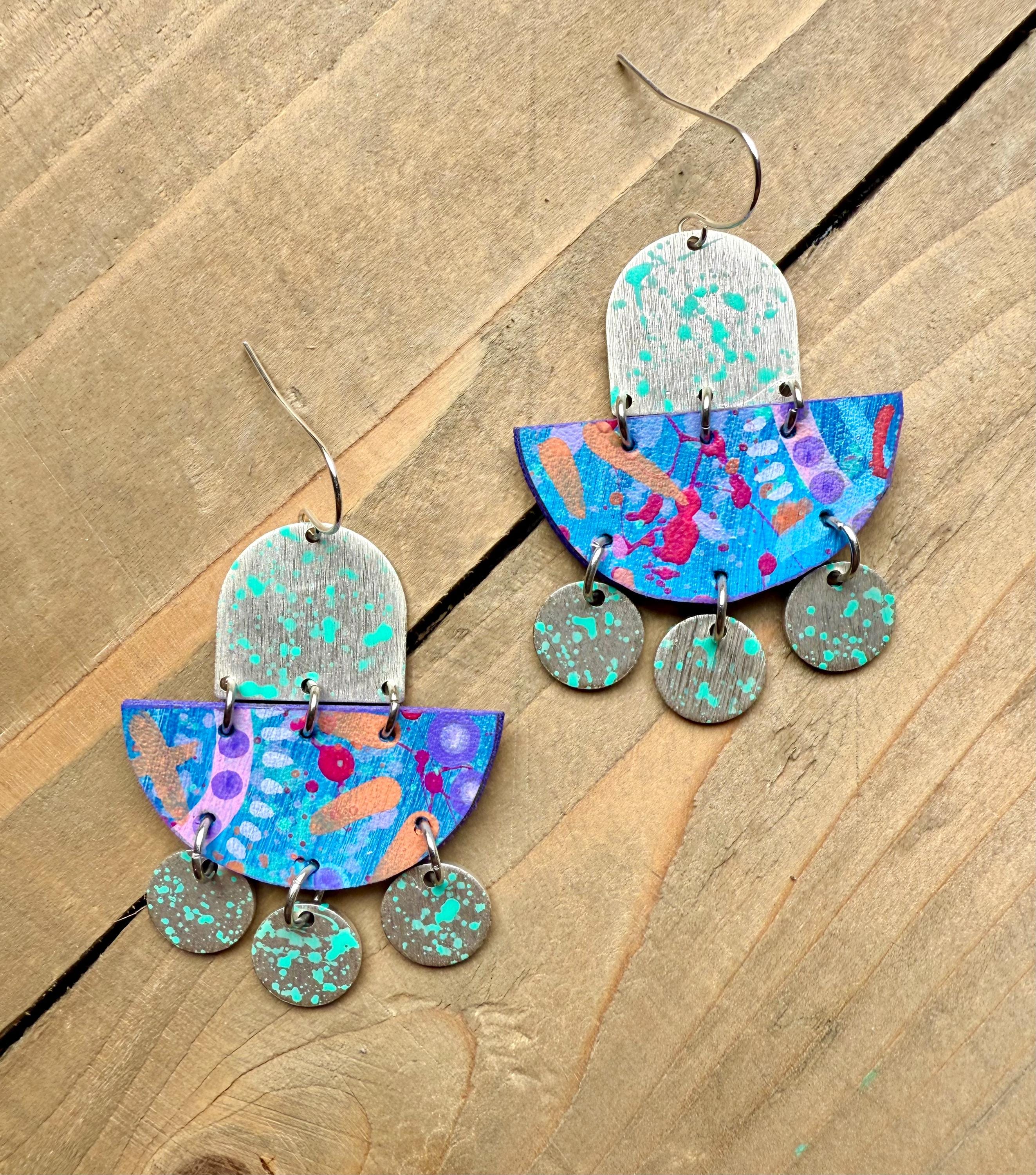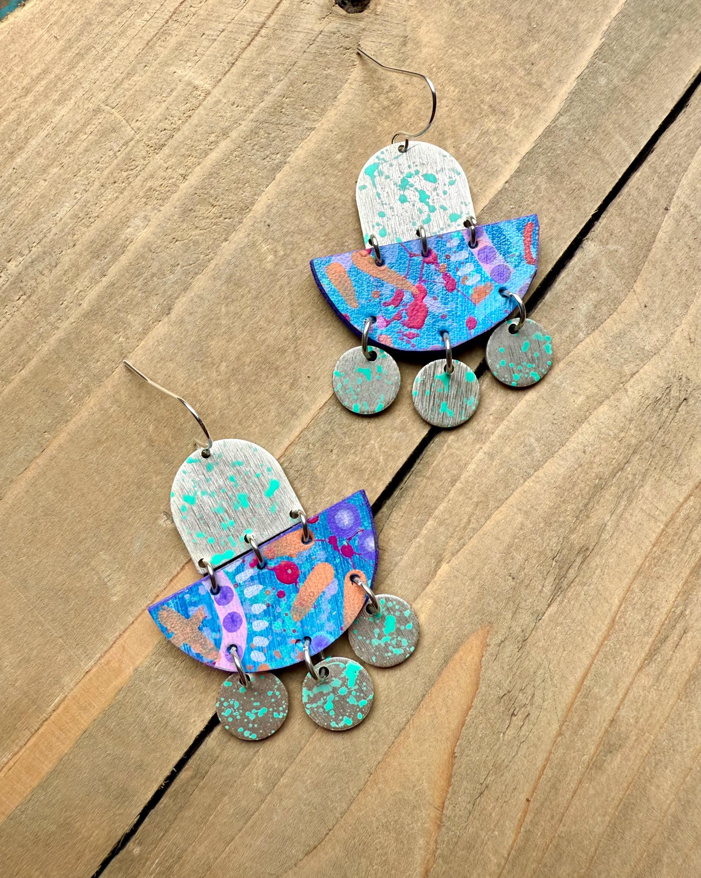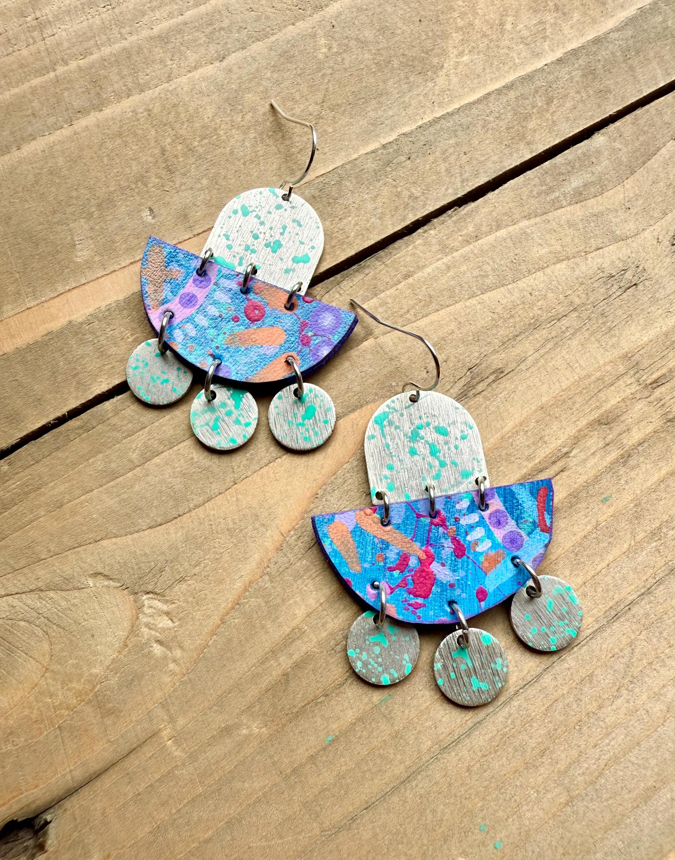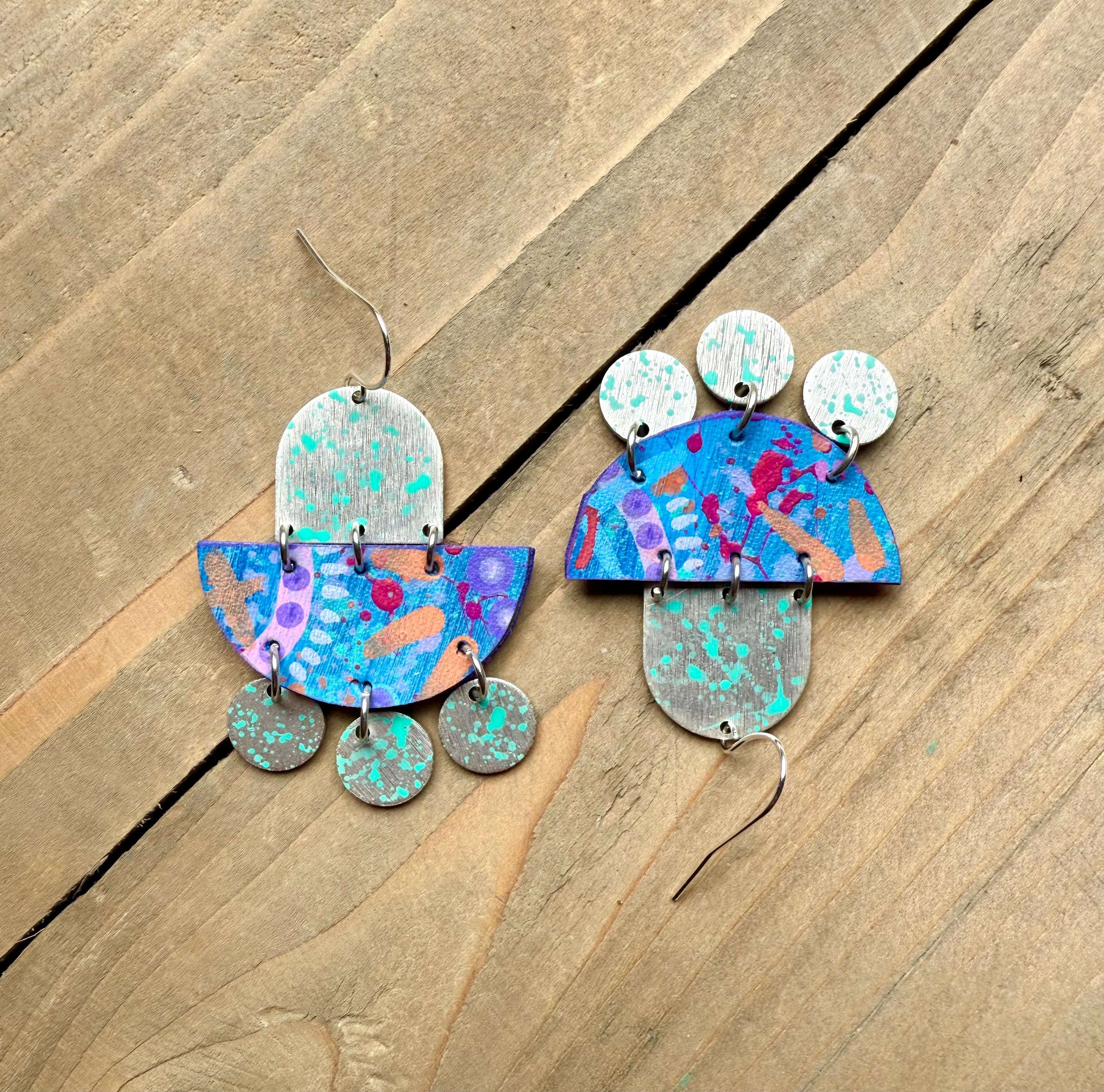 Silver Handpainted Drop Earrings. Formed from hammered silver-filled solid brass and hand painted vegan leather. Finished with a matte protective sealant. Each pair of earrings are one of a kind, please allow some slight variances in design and color. Dimensions 2.25" L, 1.25" W