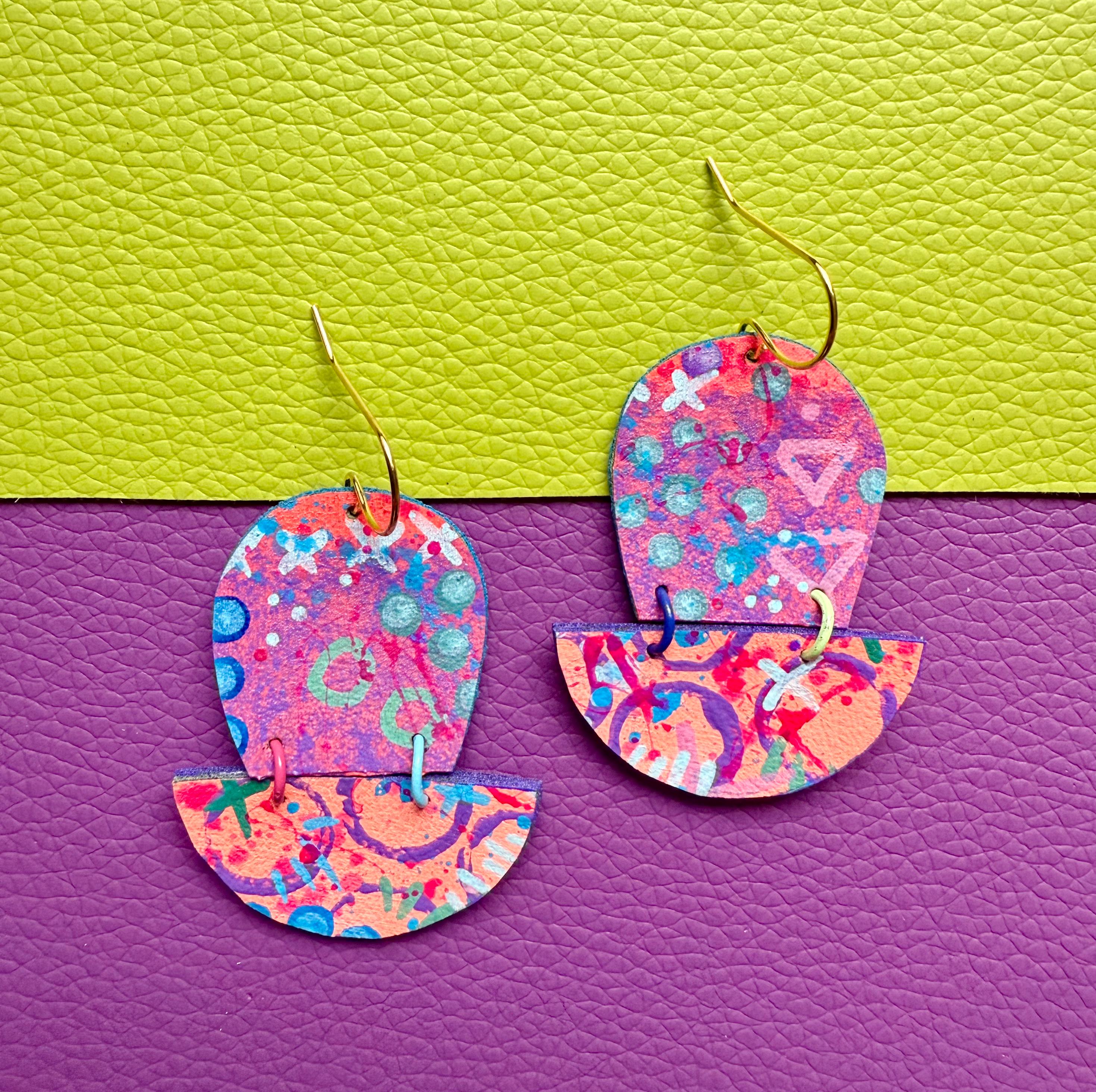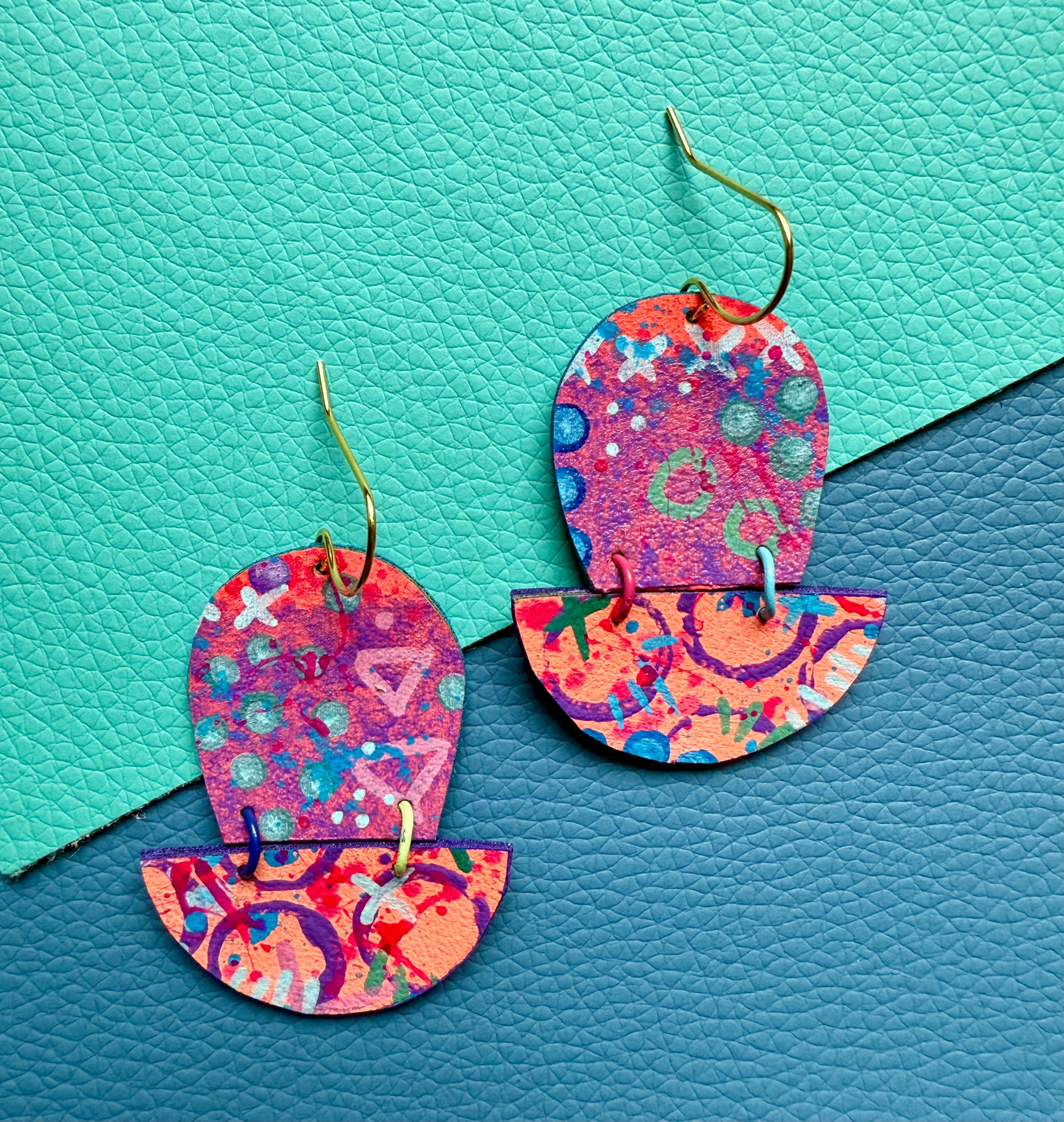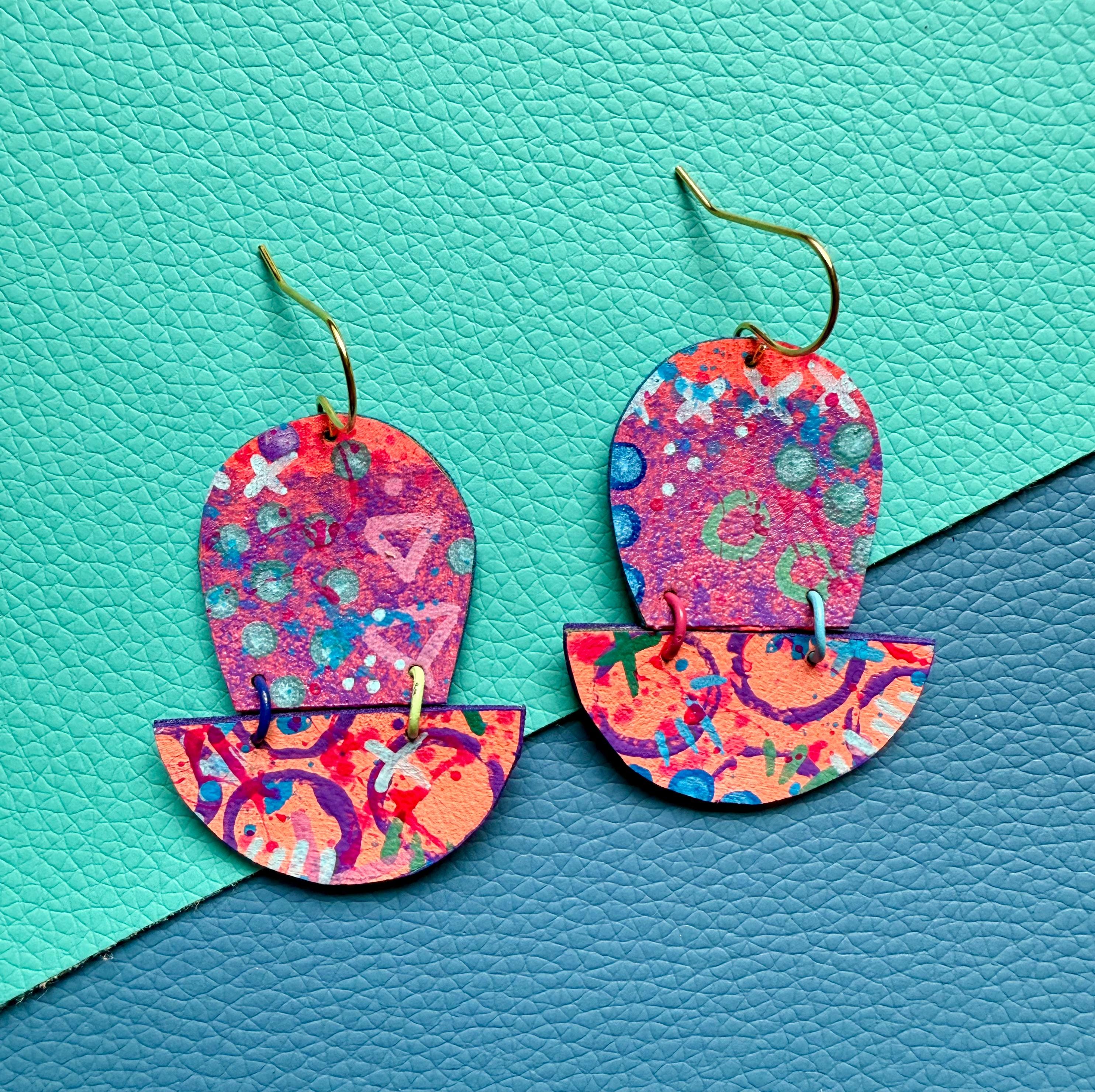 Vegan Leather Chandelier Earrings. Made from vegan leather and finished with layers of hand painted detail. Each pair of earrings are one of a kind, please allow some slight variances in design and color.