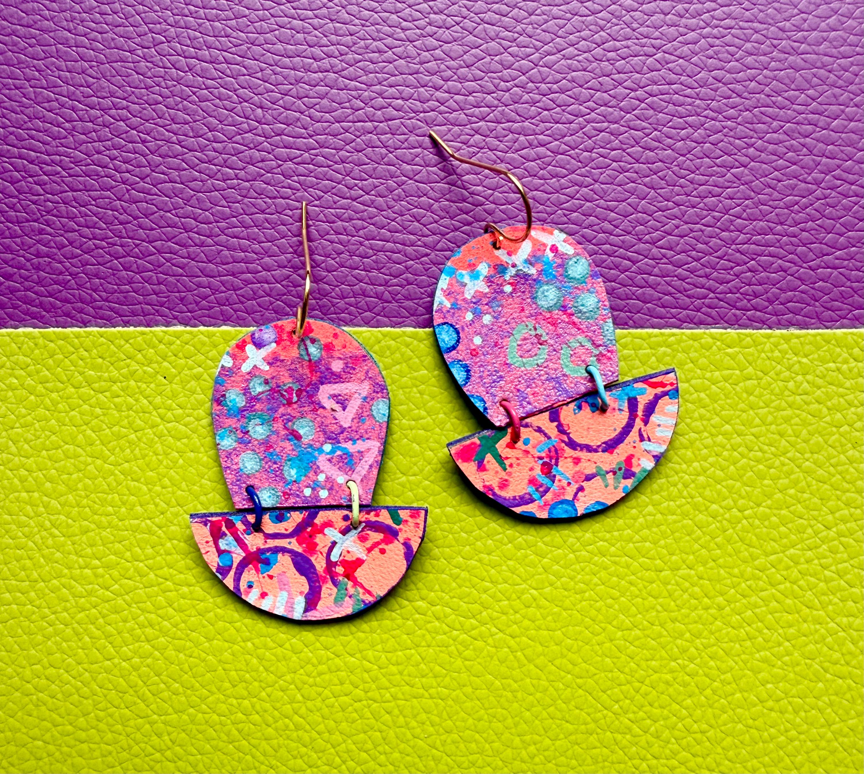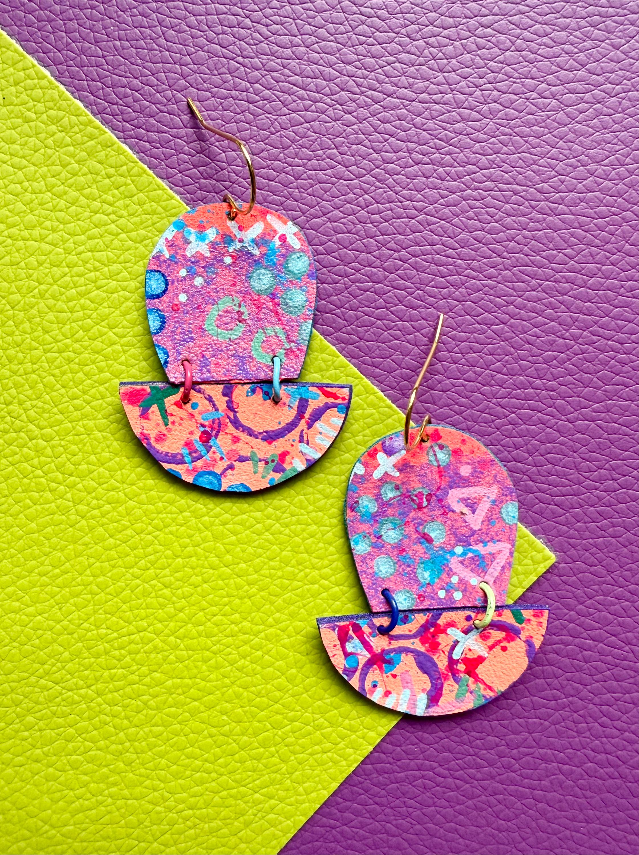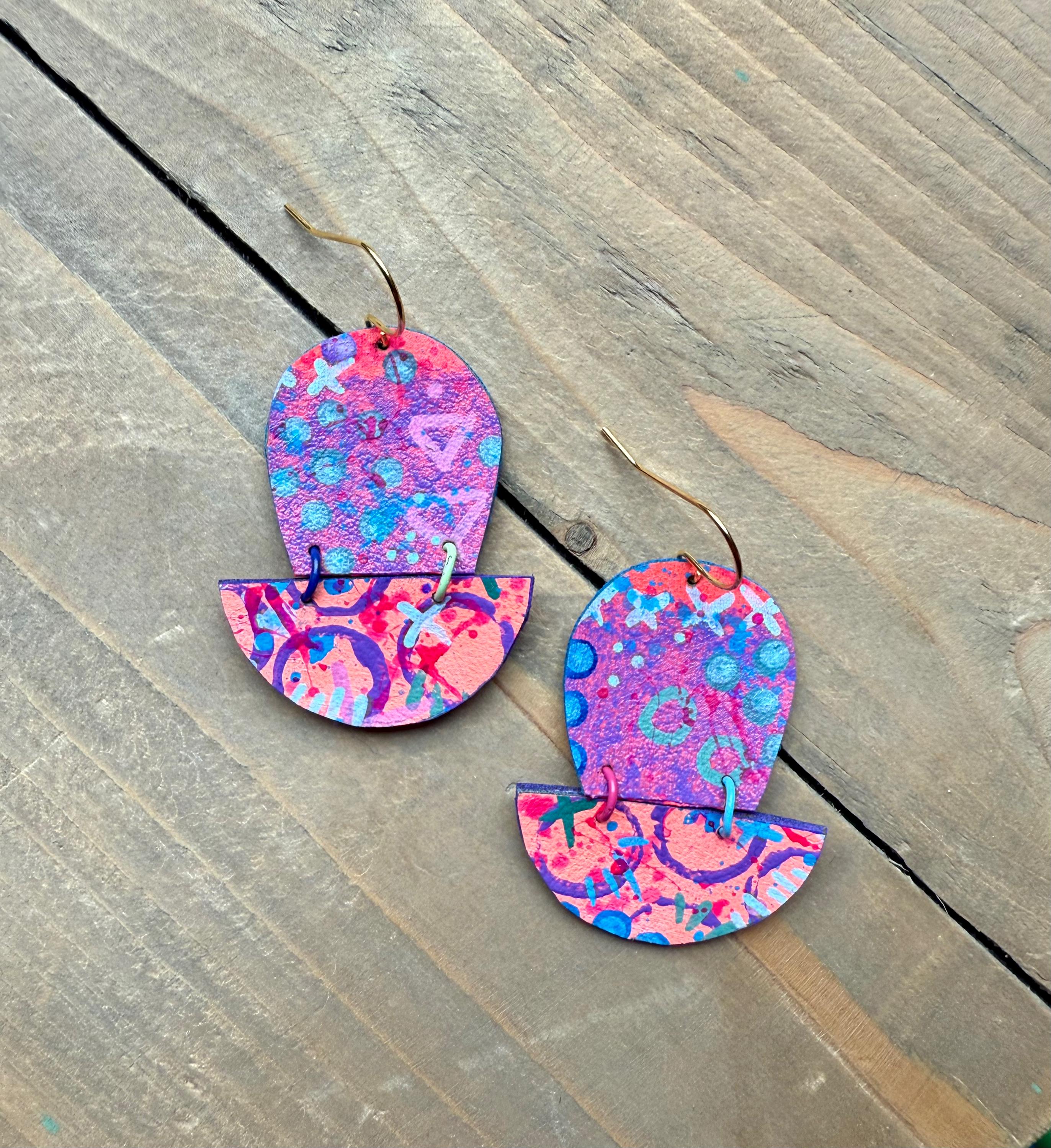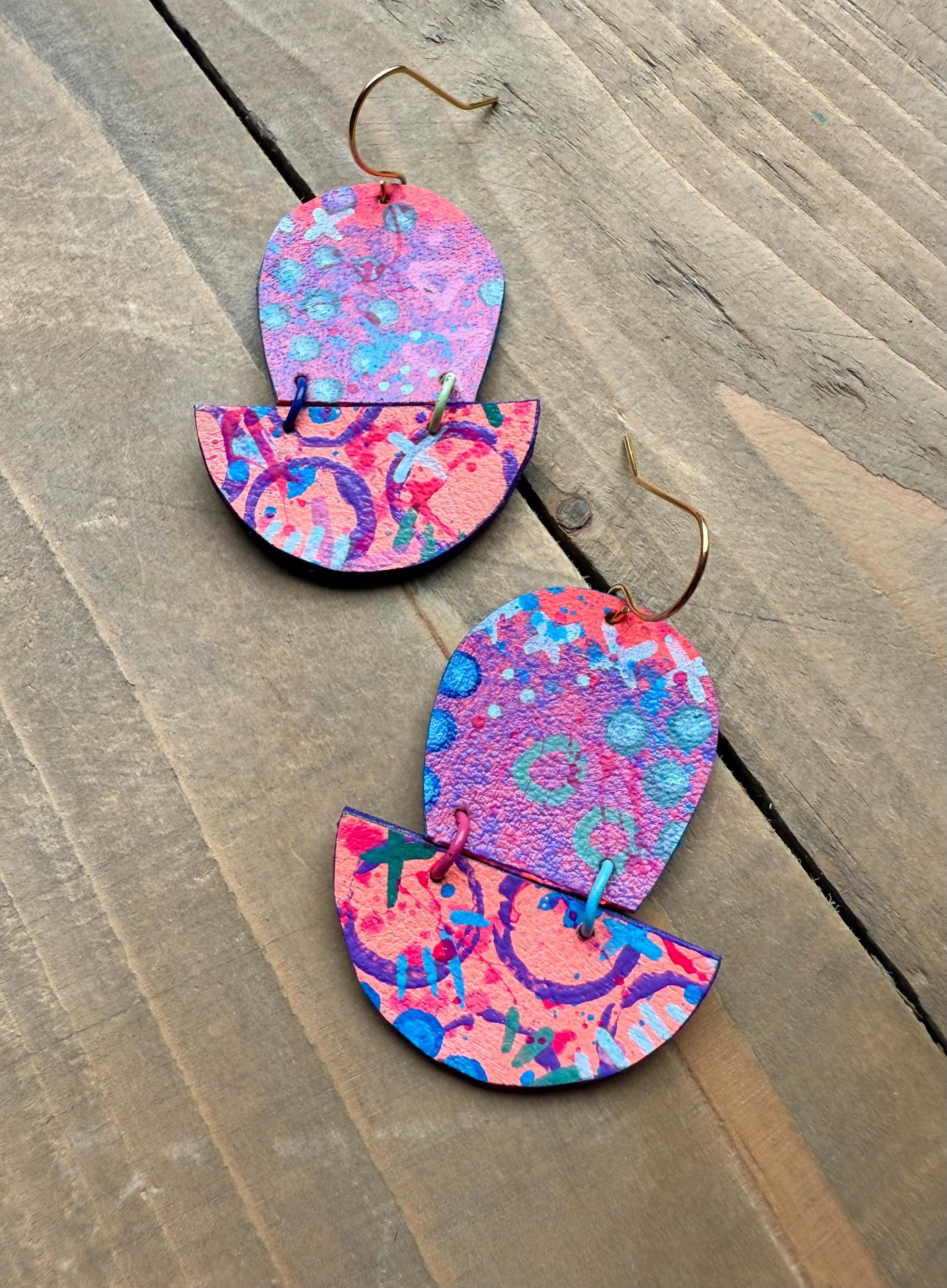 Vegan Leather Chandelier Earrings. Made from vegan leather and finished with layers of hand painted detail. Each pair of earrings are one of a kind, please allow some slight variances in design and color.