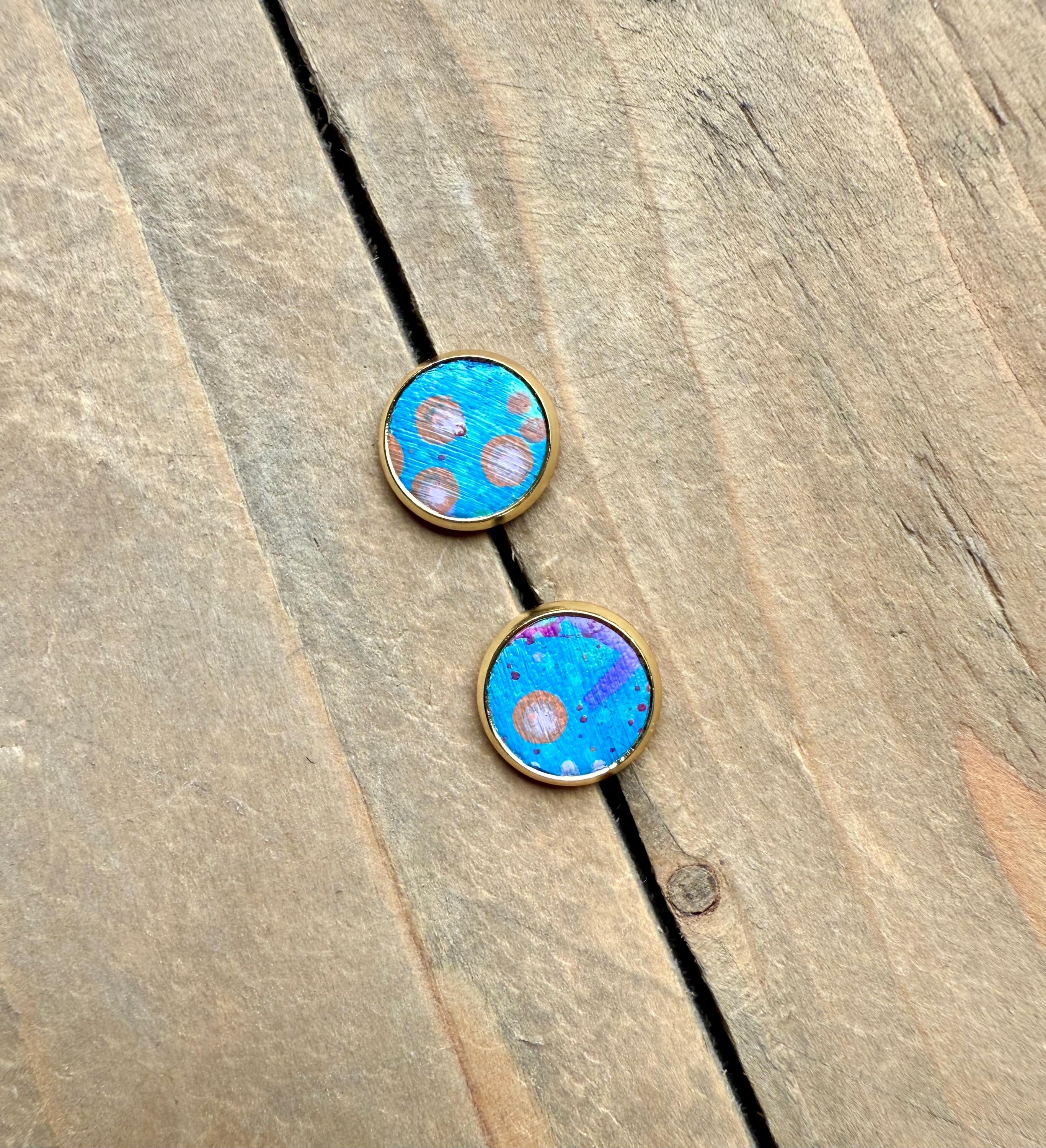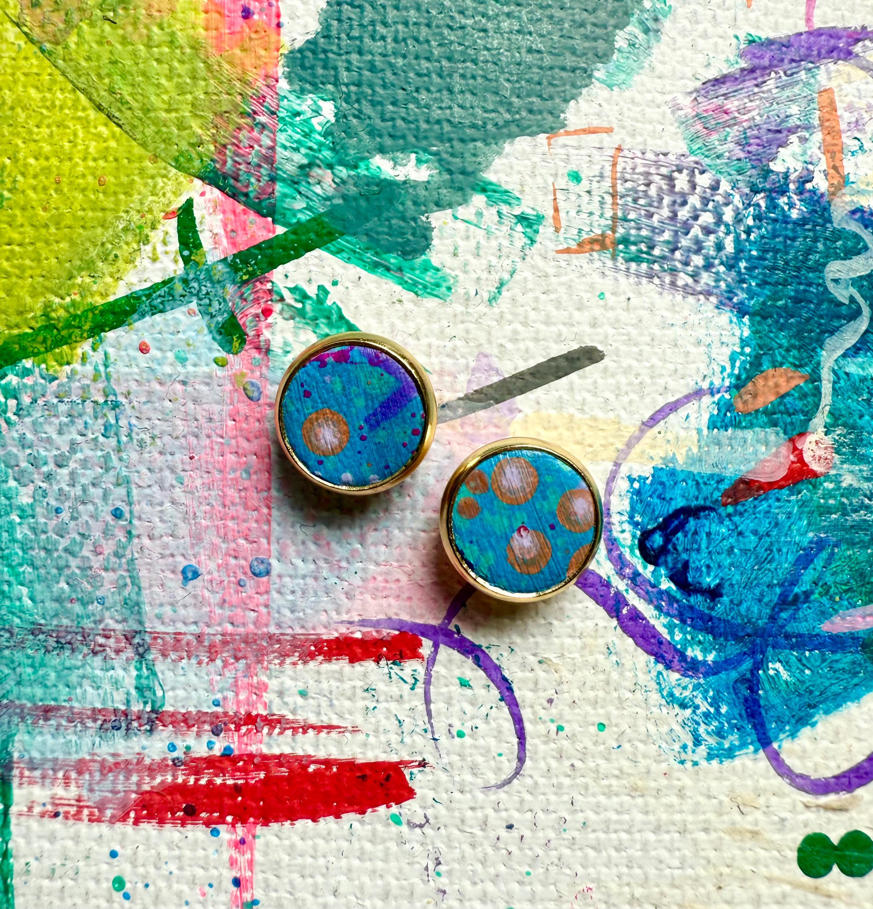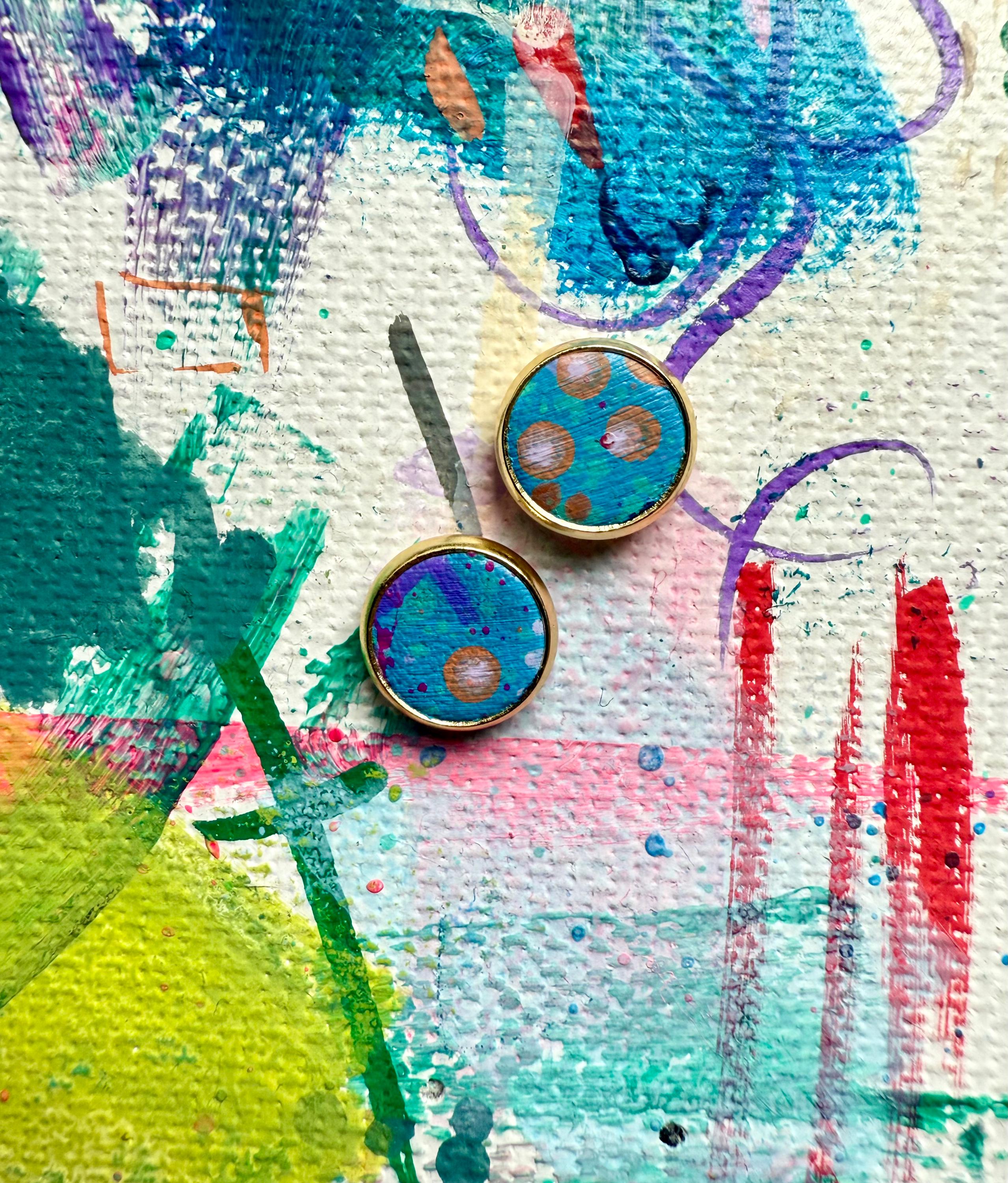 Vegan Leather Stud Earrings. Made from vegan leather and finished with layers of hand painted detail. Set in brass bezel studs. Each pair of earrings are one of a kind, please allow some slight variances in design and color. Perfect for gifting-earrings are packaged on hand painted canvas tags.