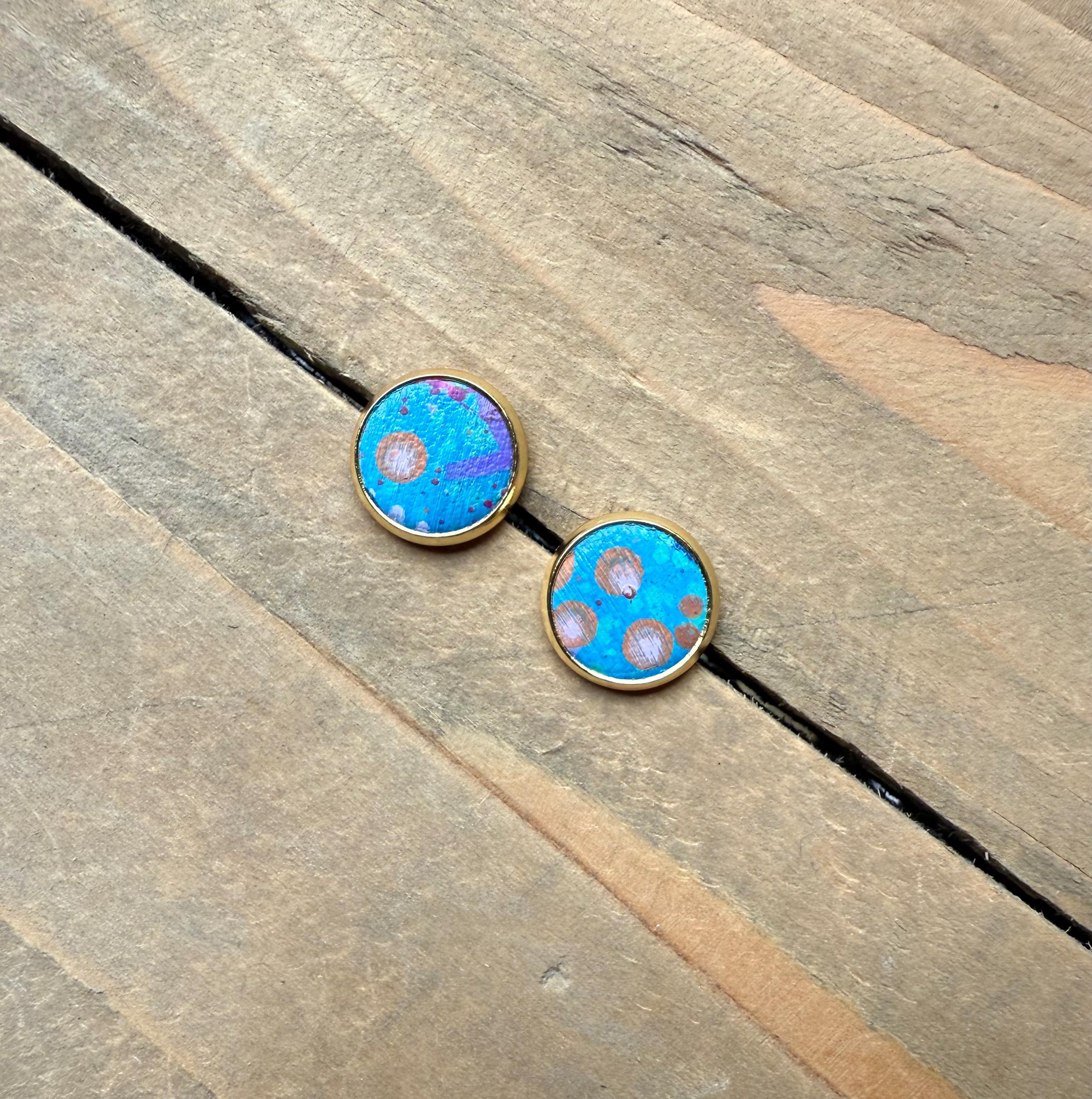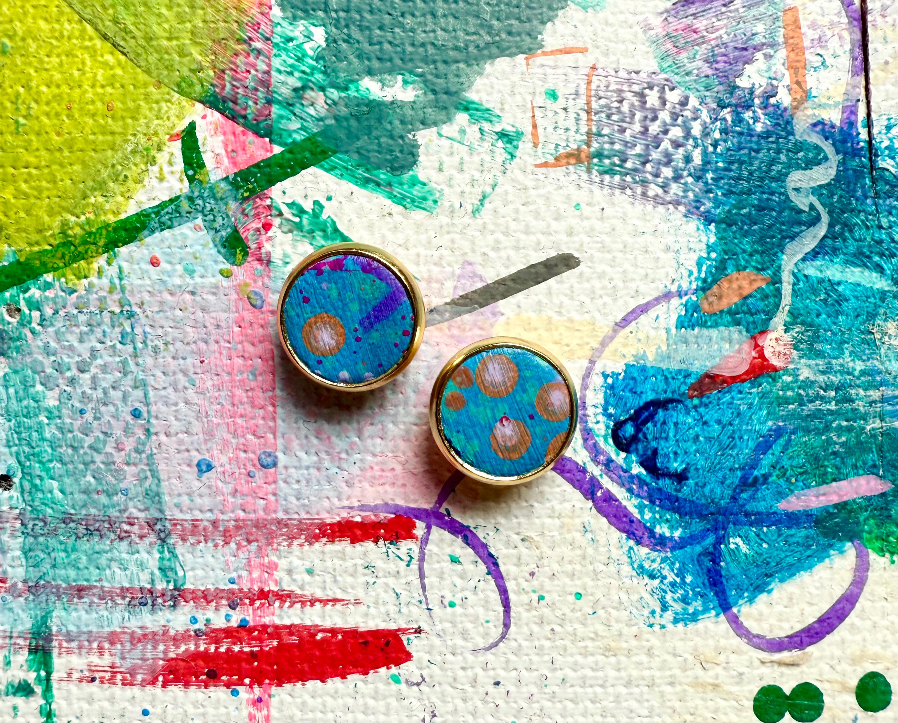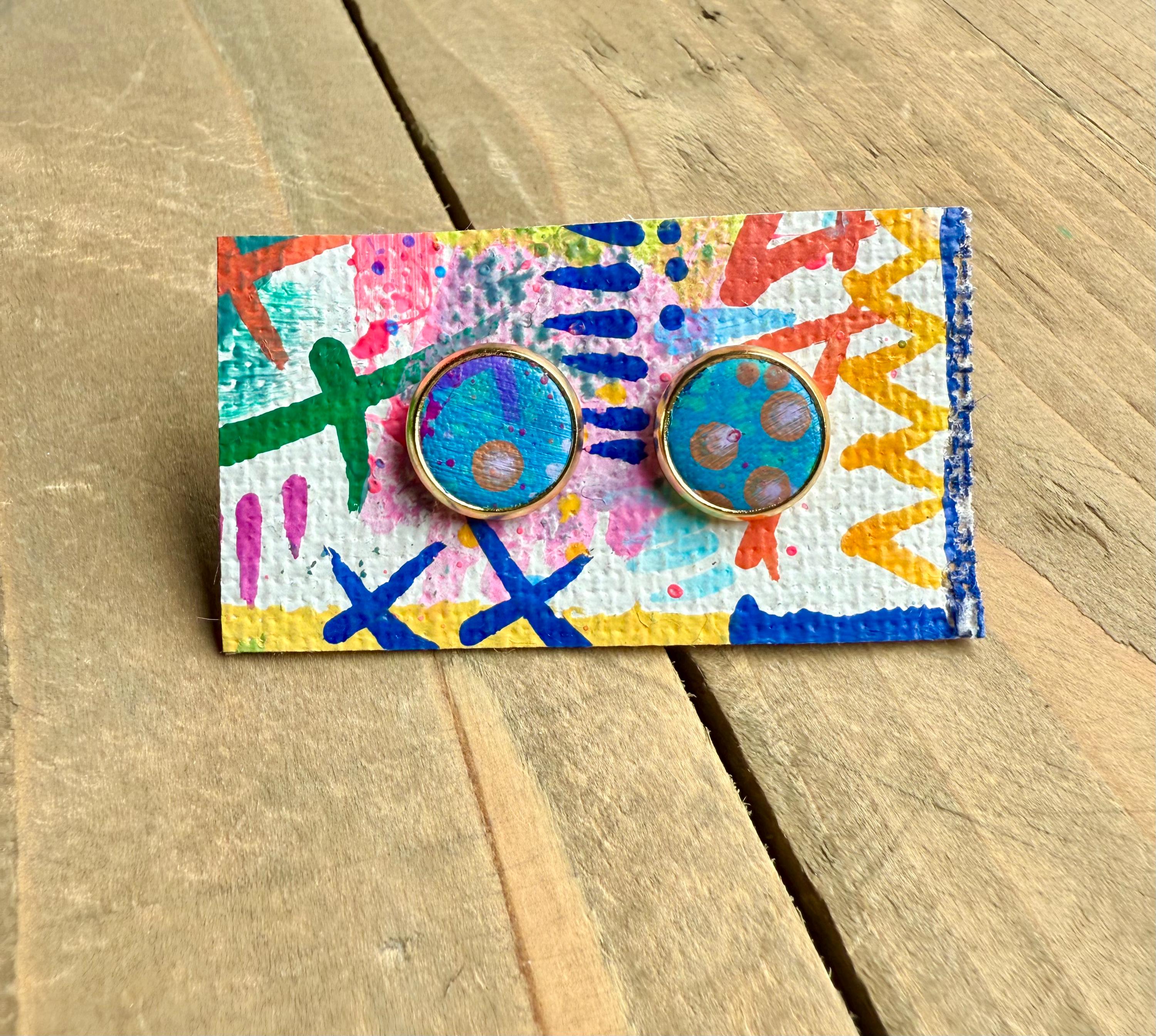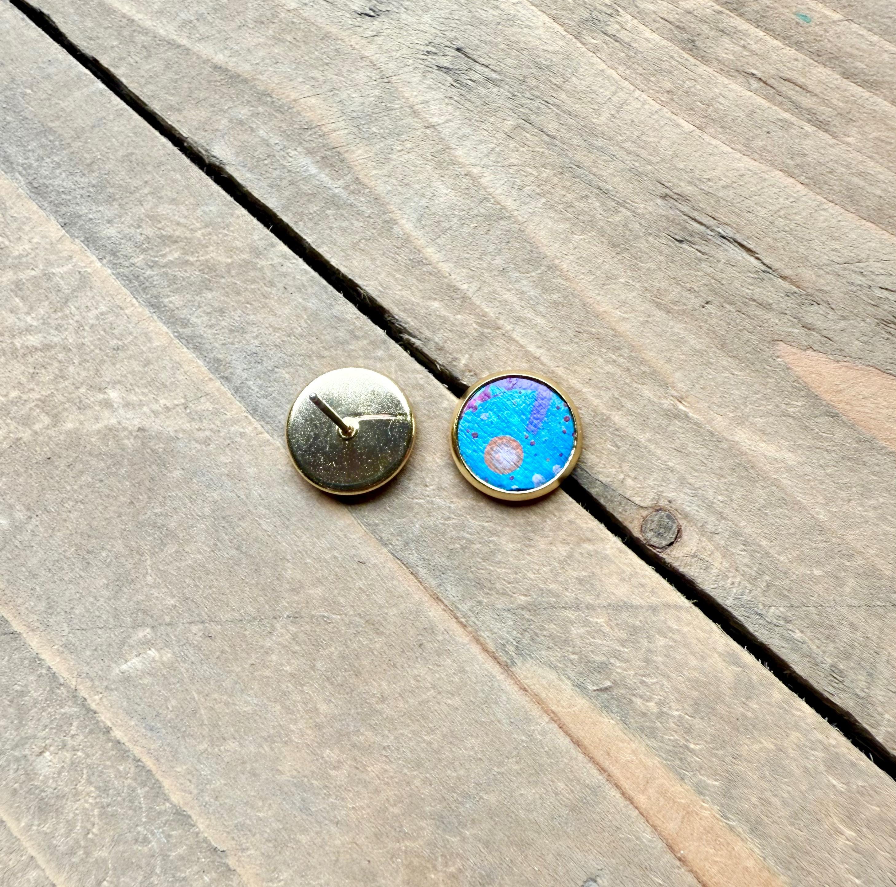 Vegan Leather Stud Earrings. Made from vegan leather and finished with layers of hand painted detail. Set in brass bezel studs. Each pair of earrings are one of a kind, please allow some slight variances in design and color. Perfect for gifting-earrings are packaged on hand painted canvas tags.