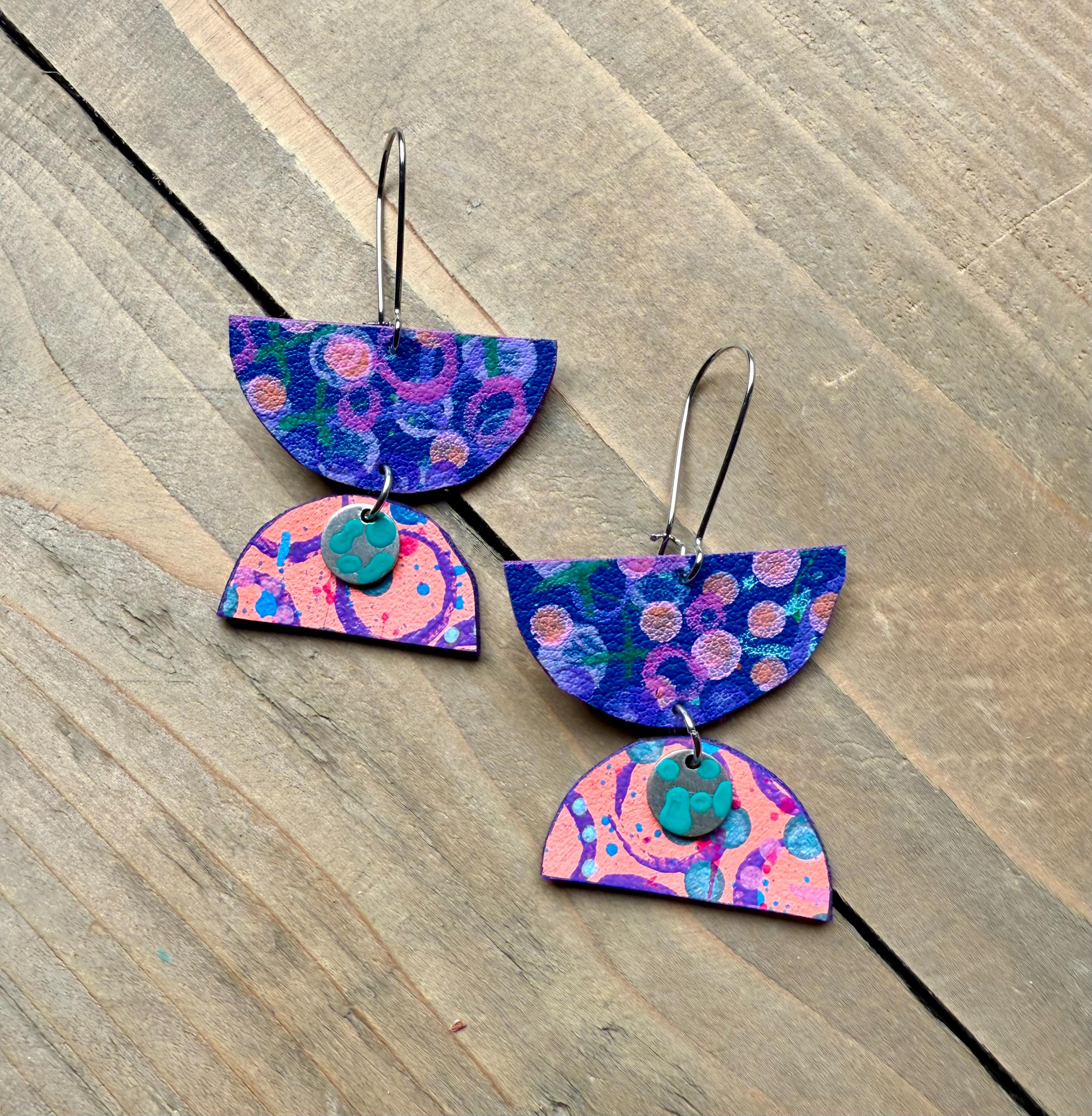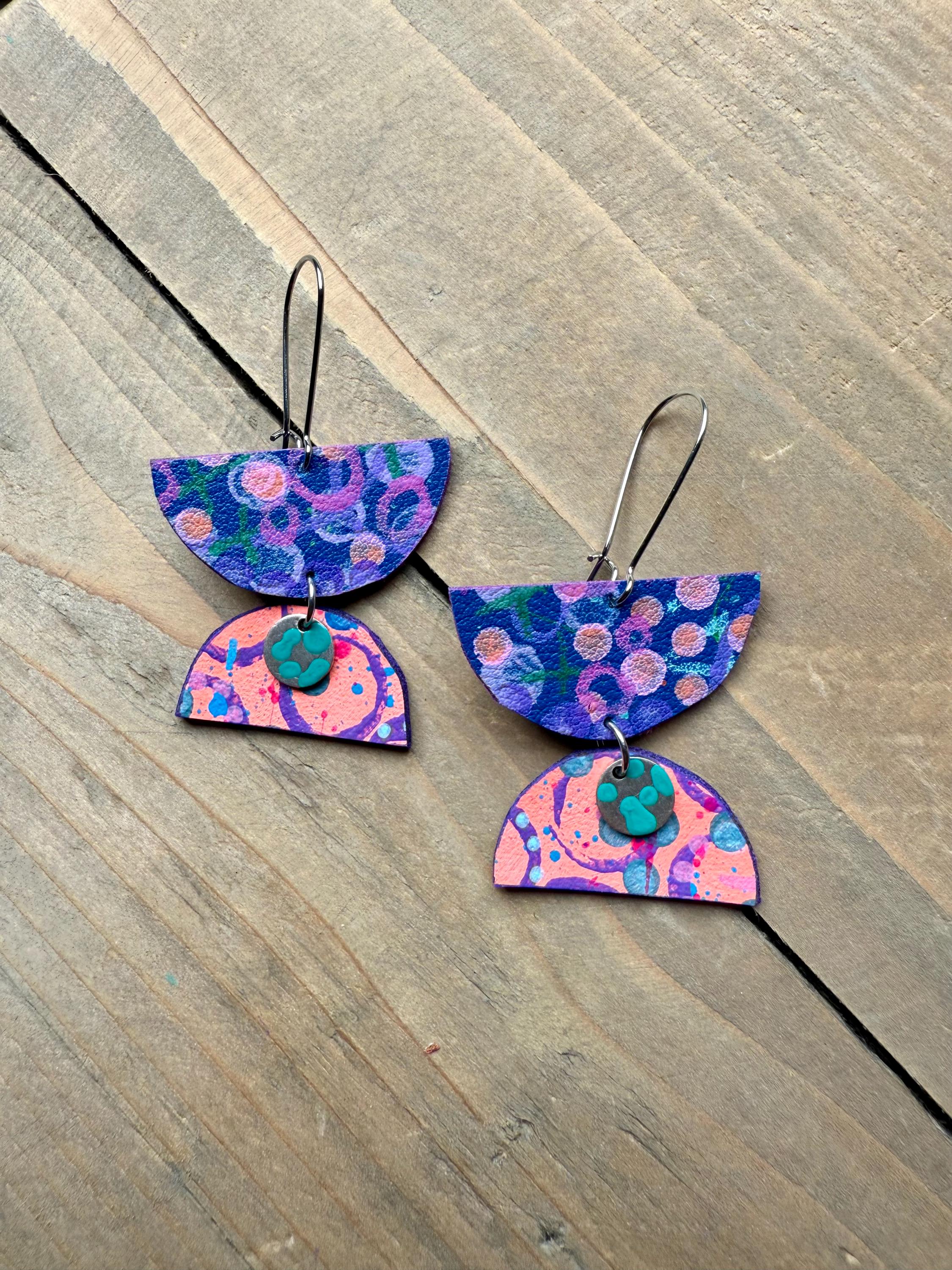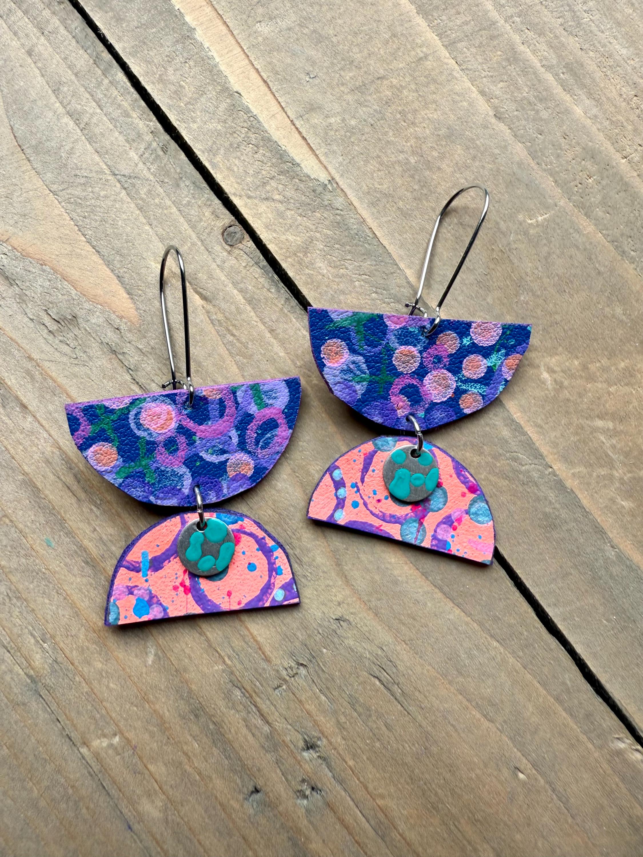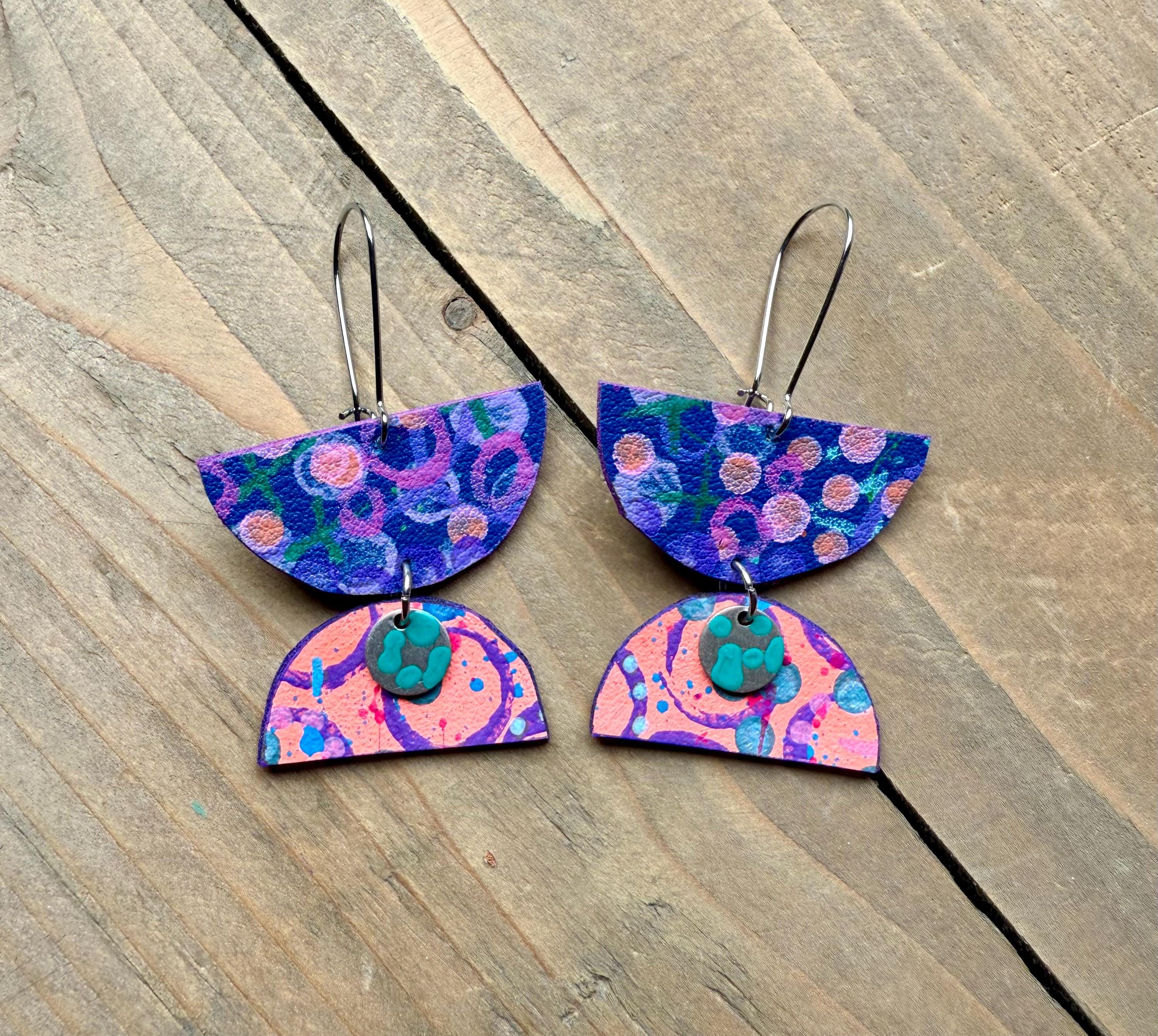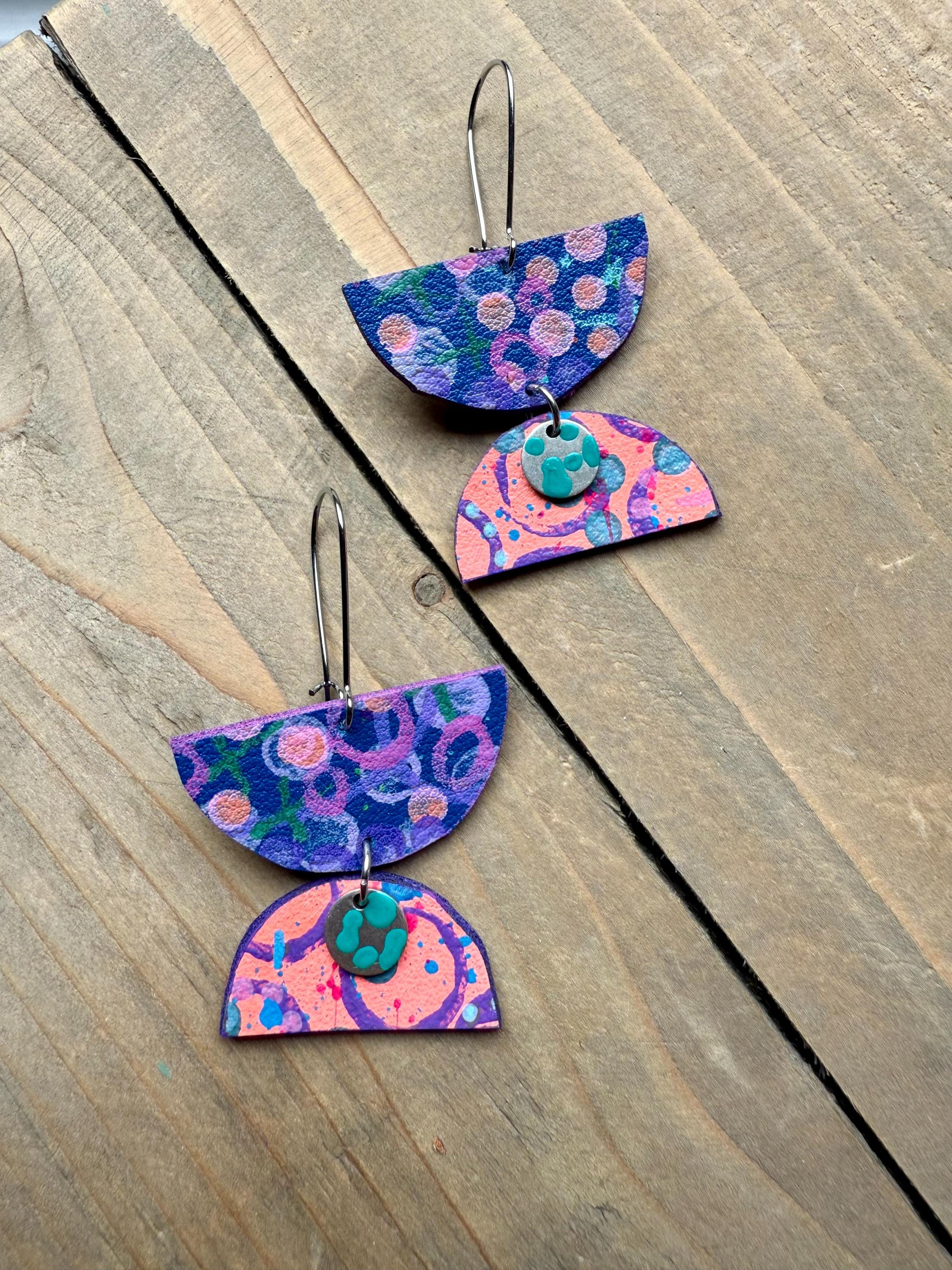 Vegan Leather Chandelier Earrings. Made from vegan leather and silver-filled brass. Finished with layers of hand painted detail. Each pair of earrings are one of a kind, please allow some slight variances in design and color.