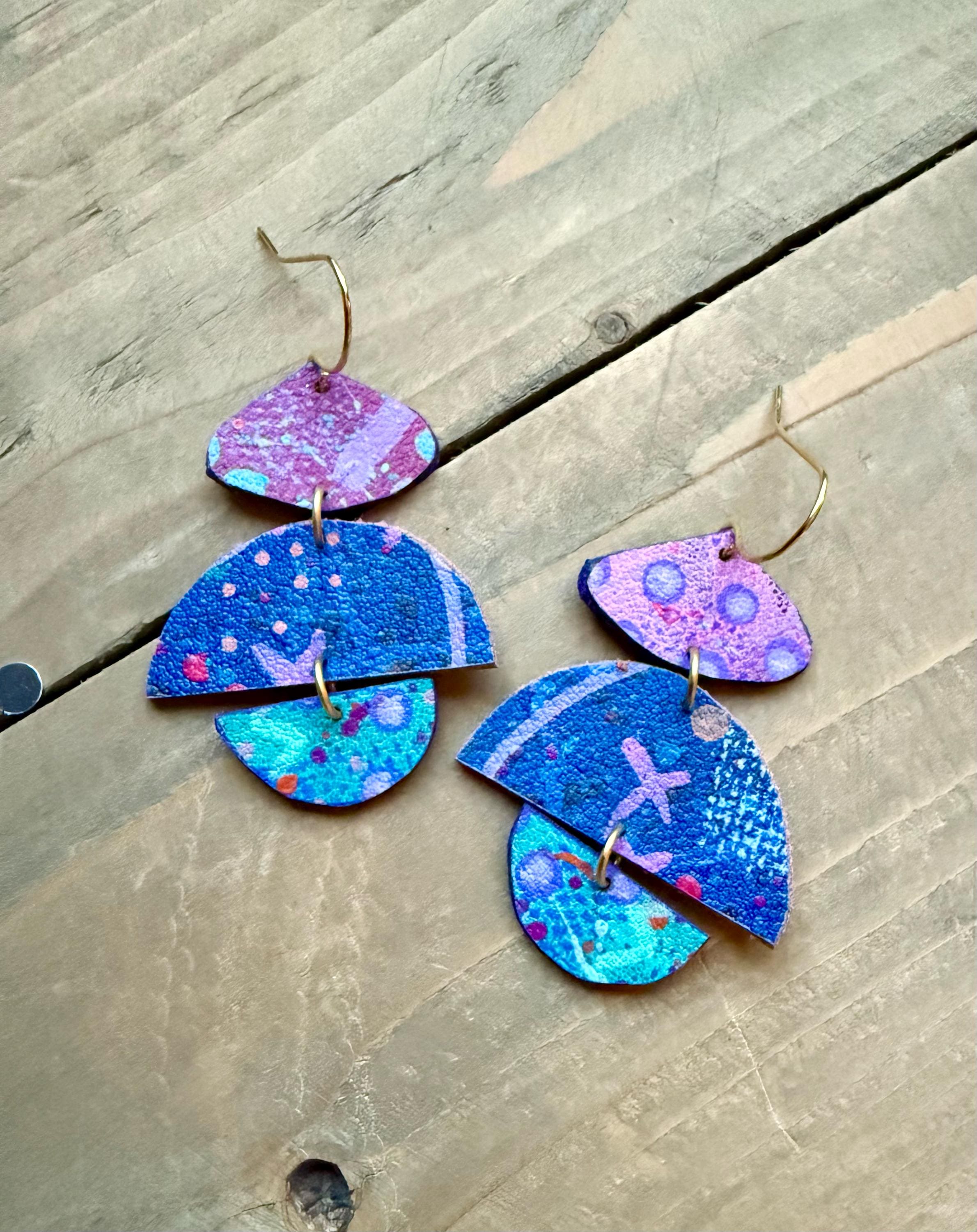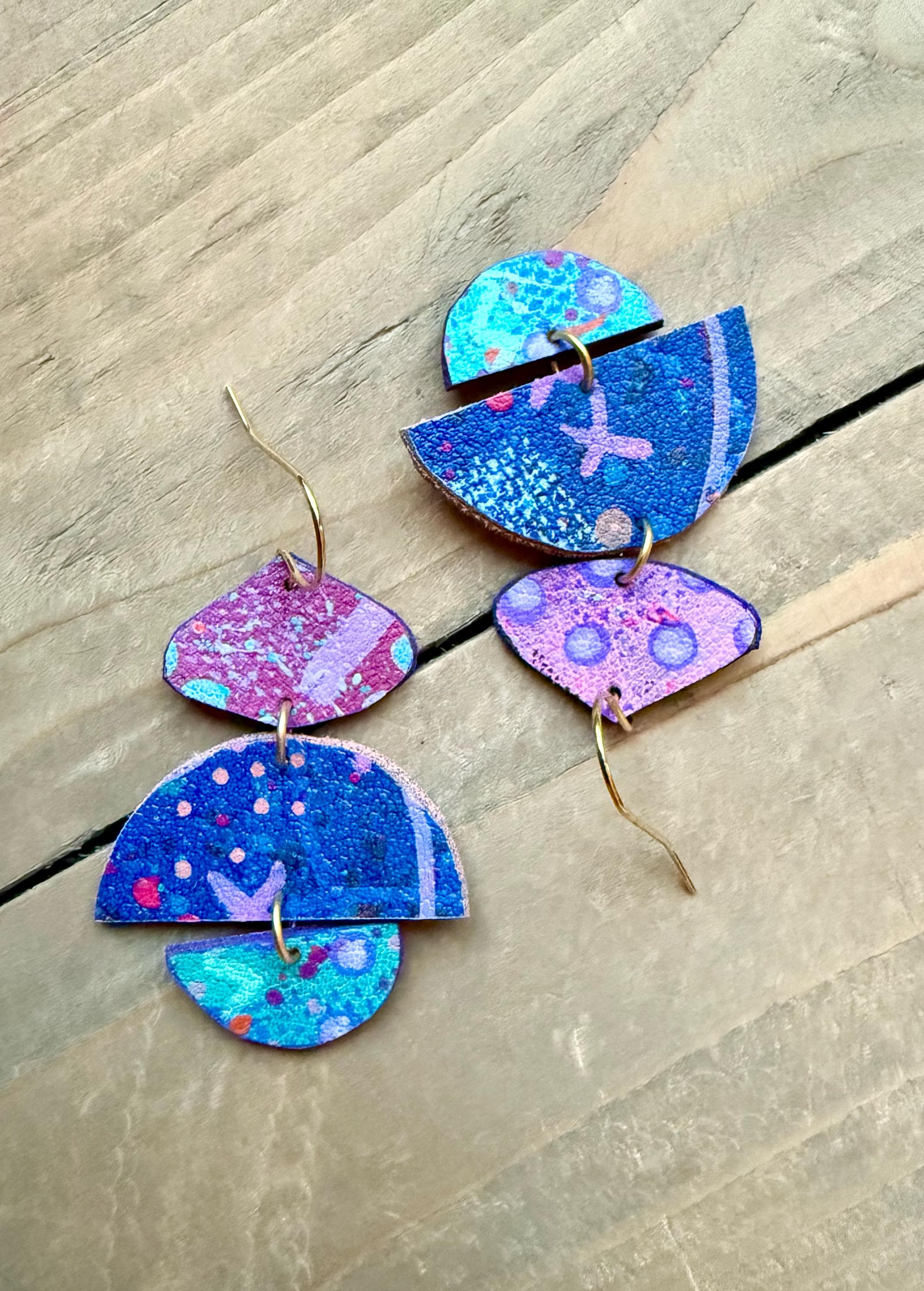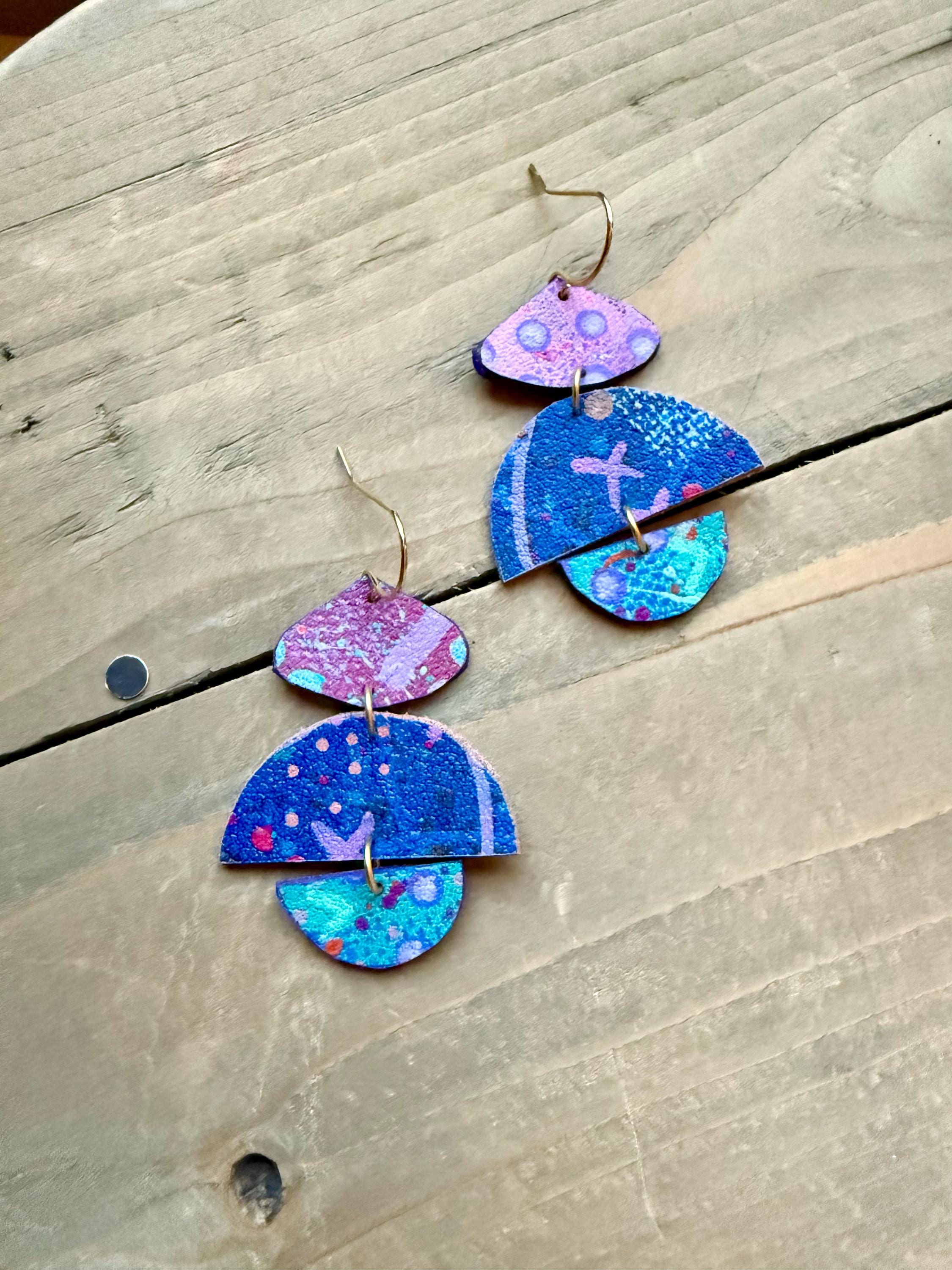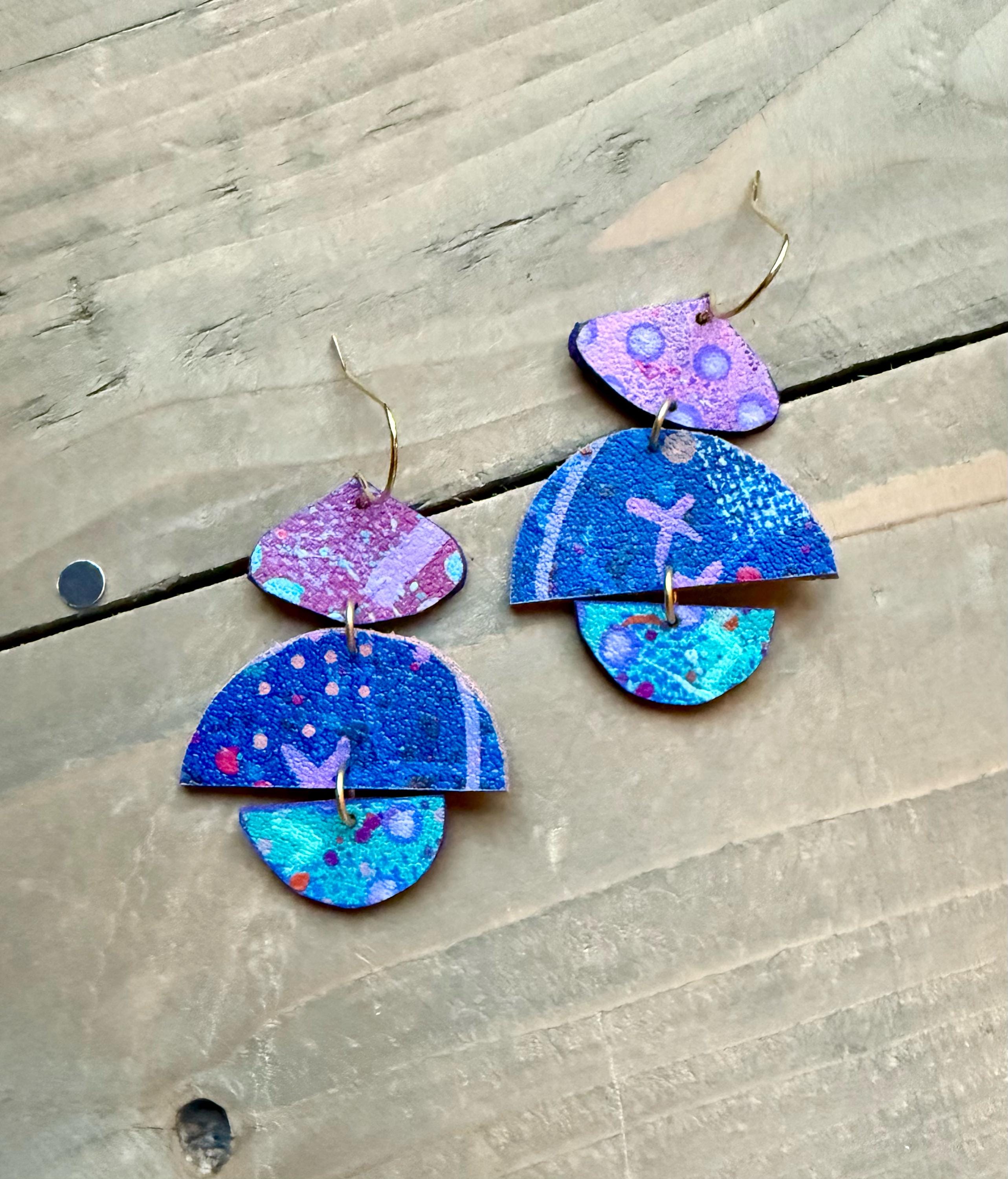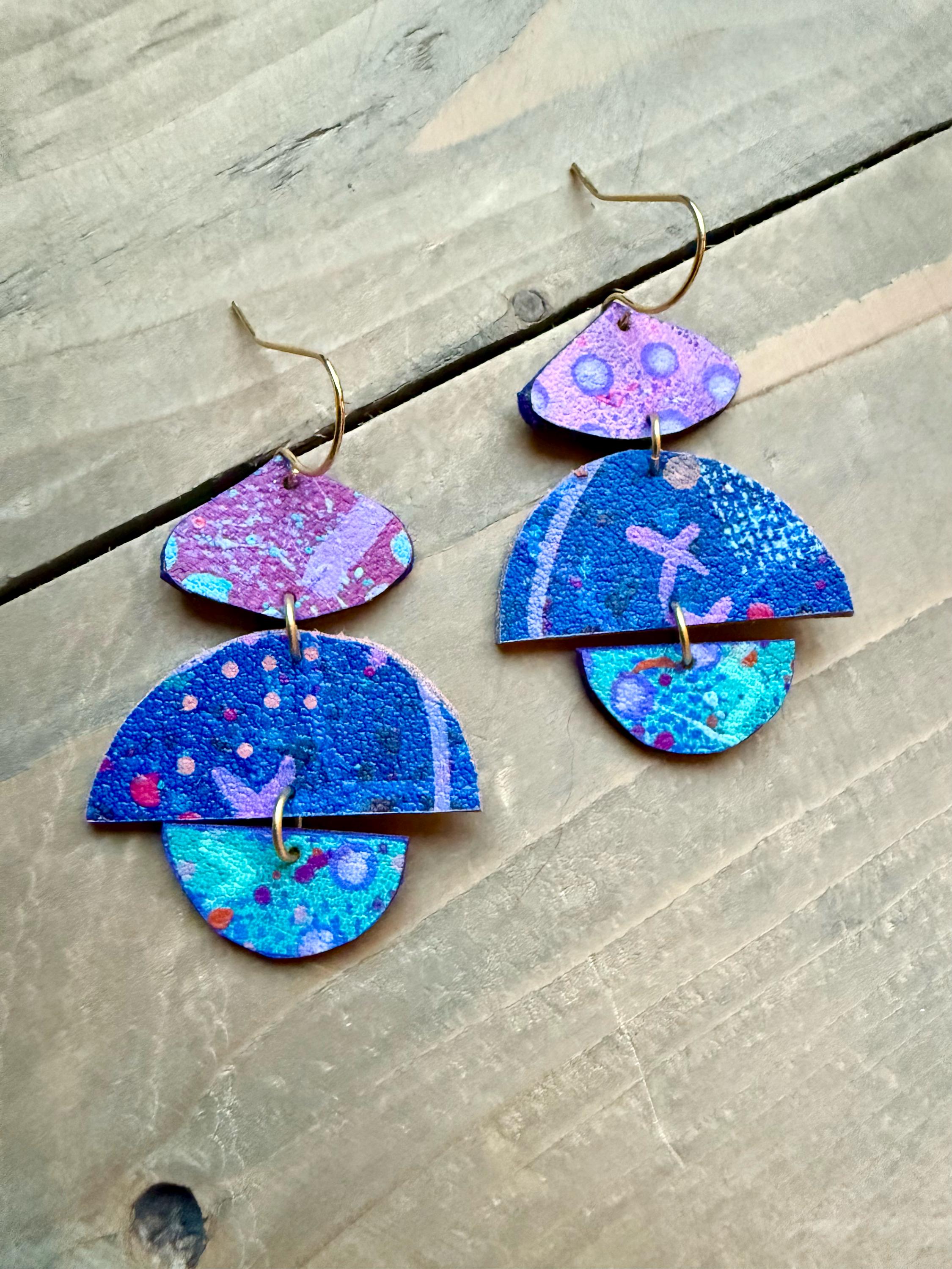 Faux Leather Handpainted Drop Earrings. Each pair is layered with hand painted details and finished with a matte protective sealant. Each pair of earrings are one of a kind, please allow some slight variances in design and color.