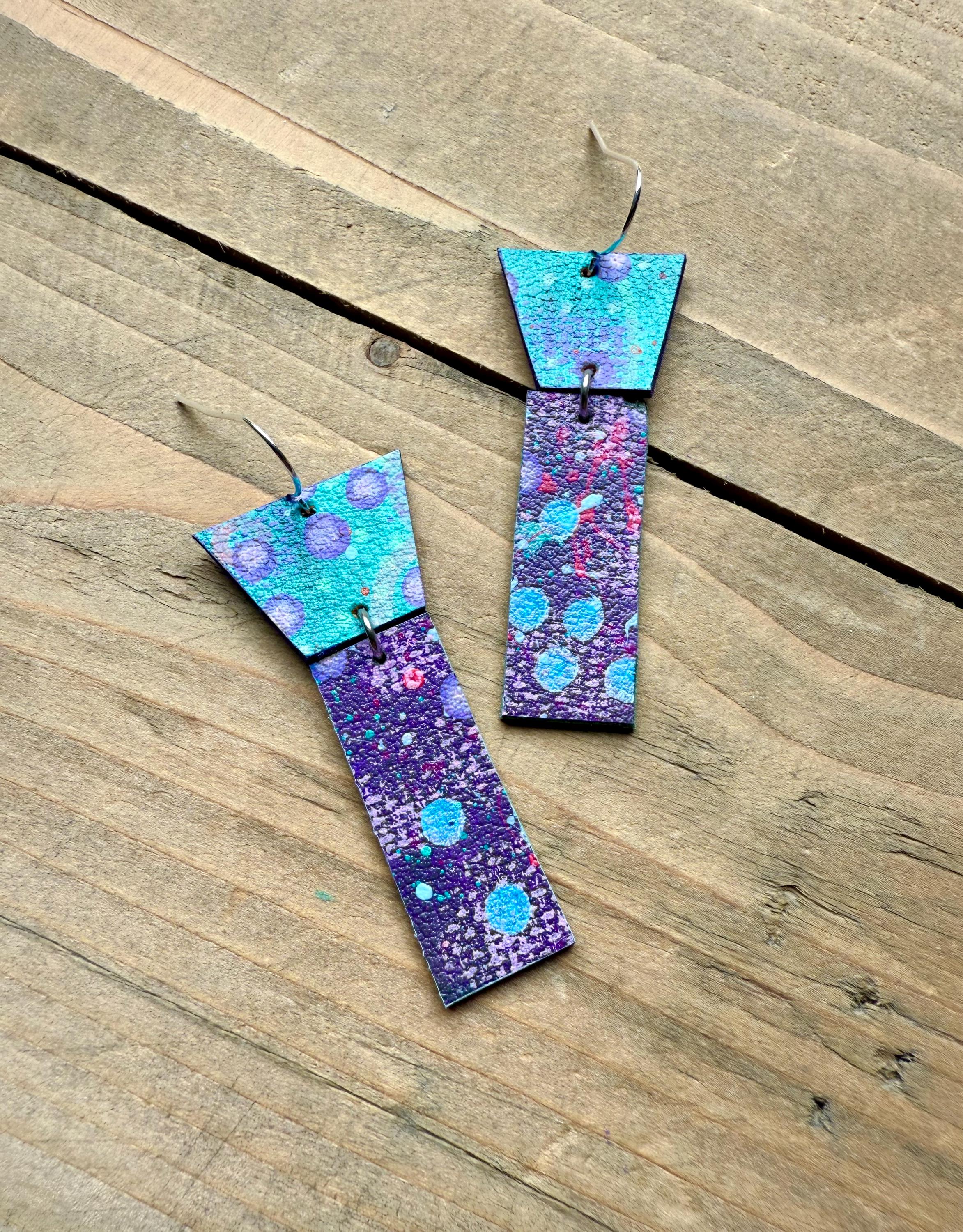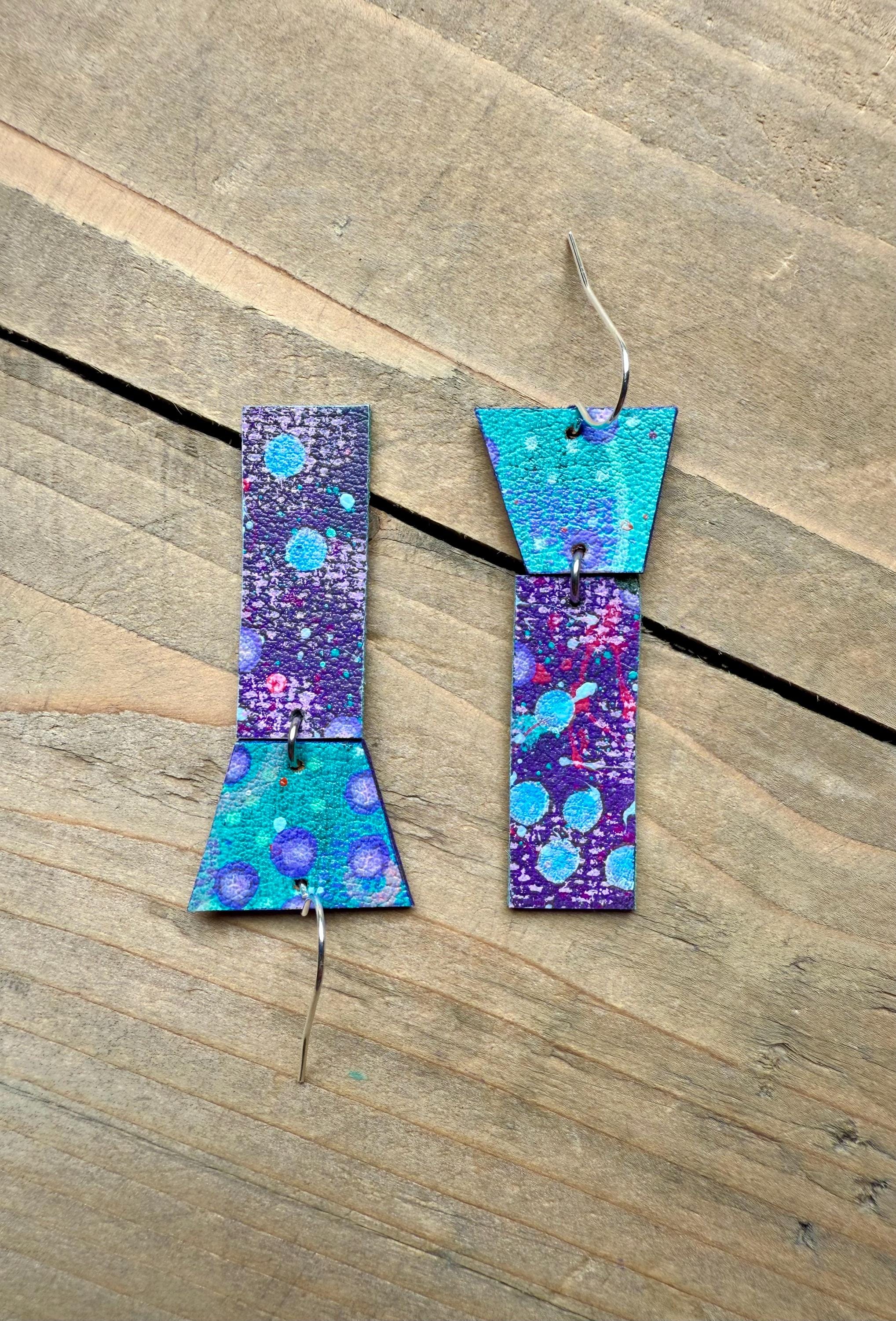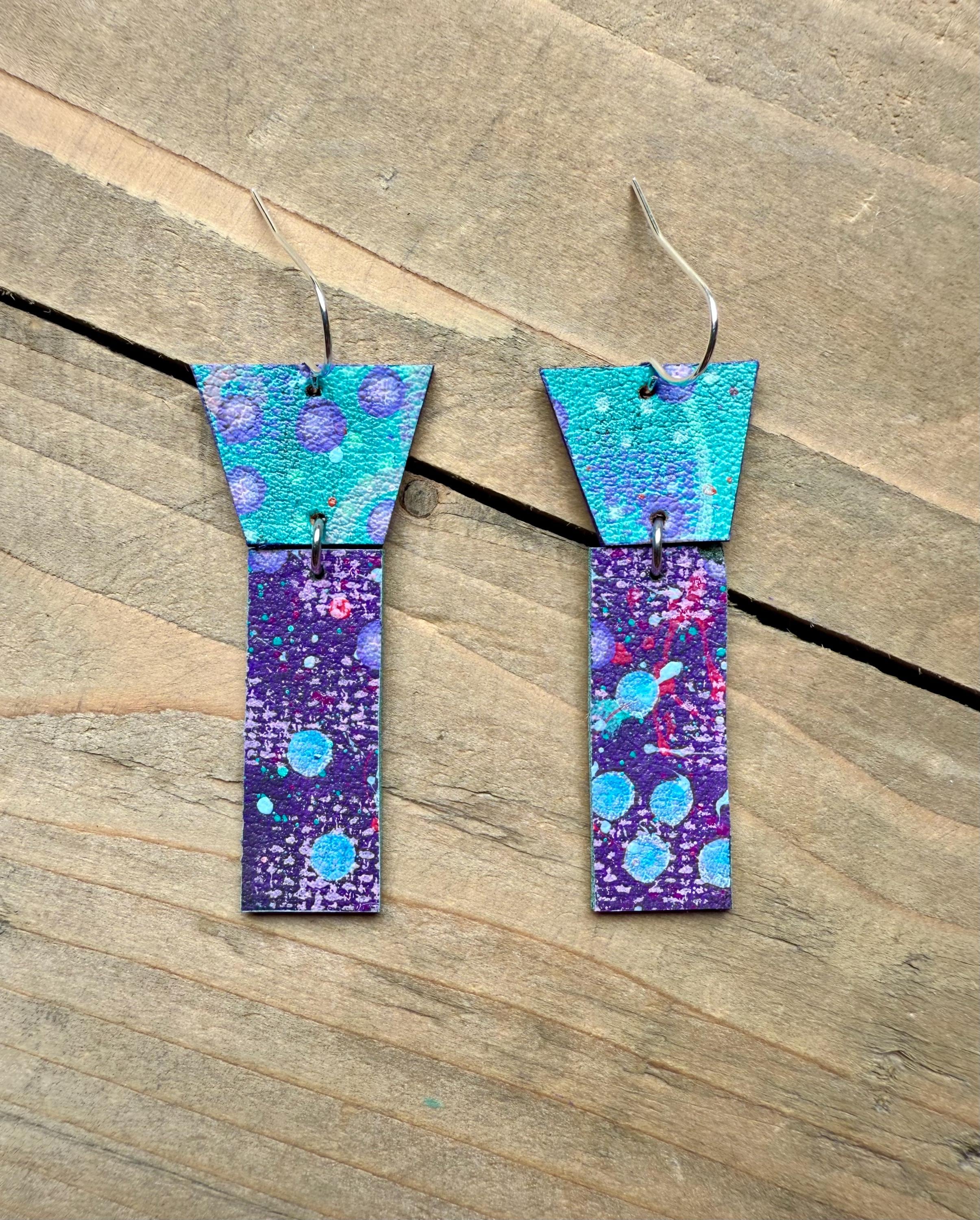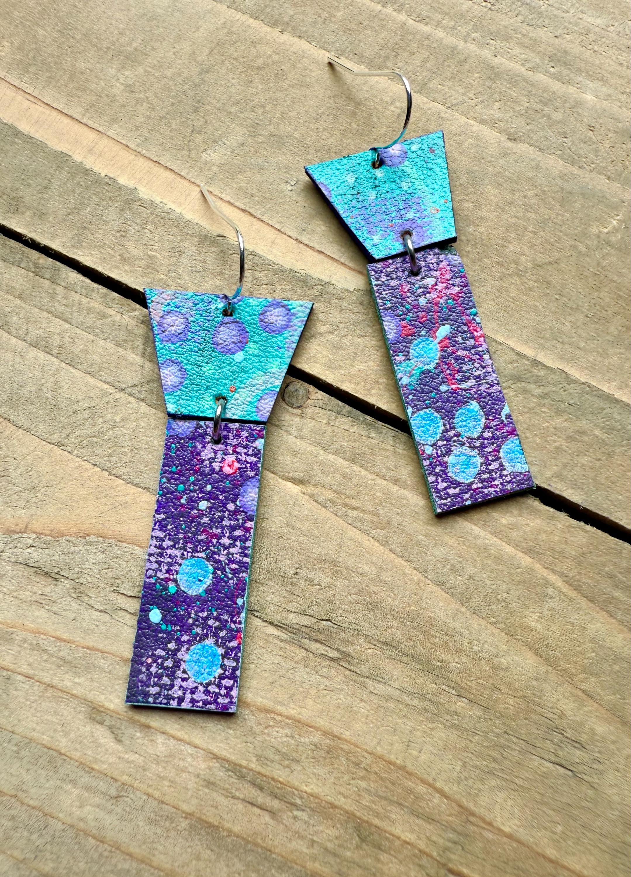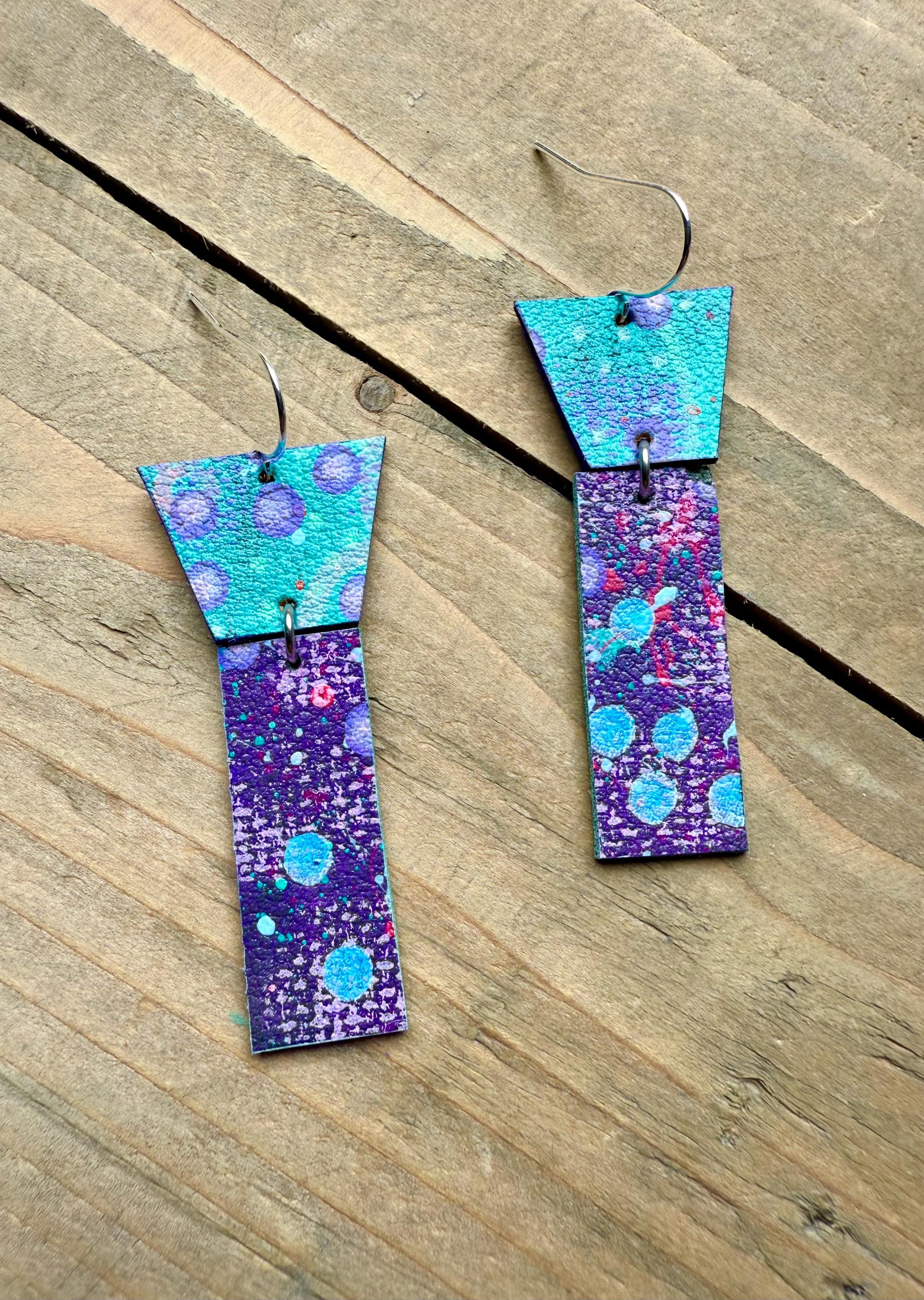 Mix Media Dangle Earrings made from hand painted vegan leather. Finished with a matte protective sealant. Each pair of earrings are one of a kind, please allow some slight variances in design and color.