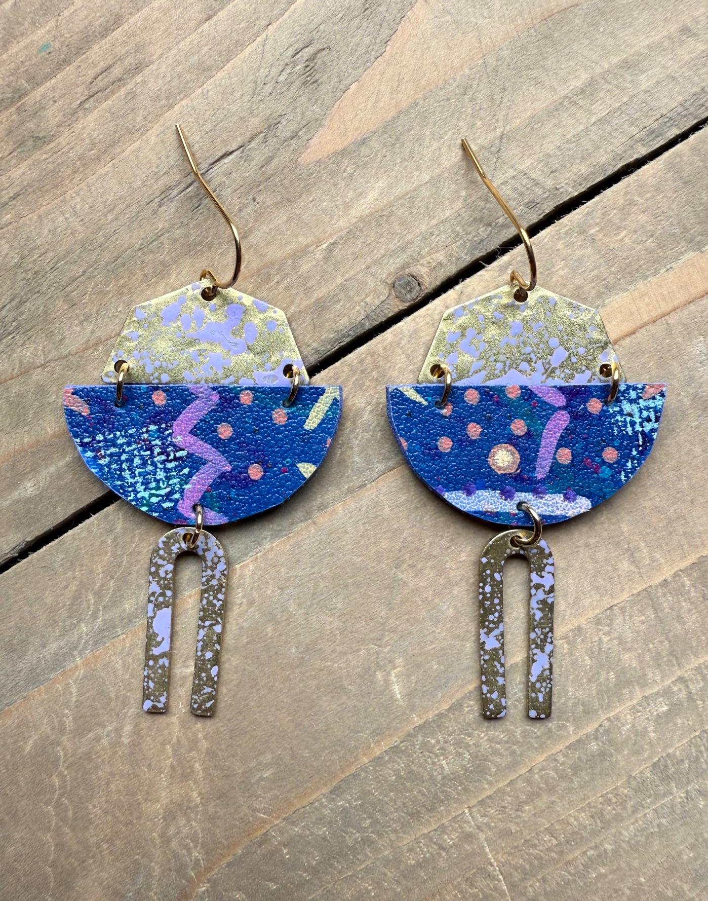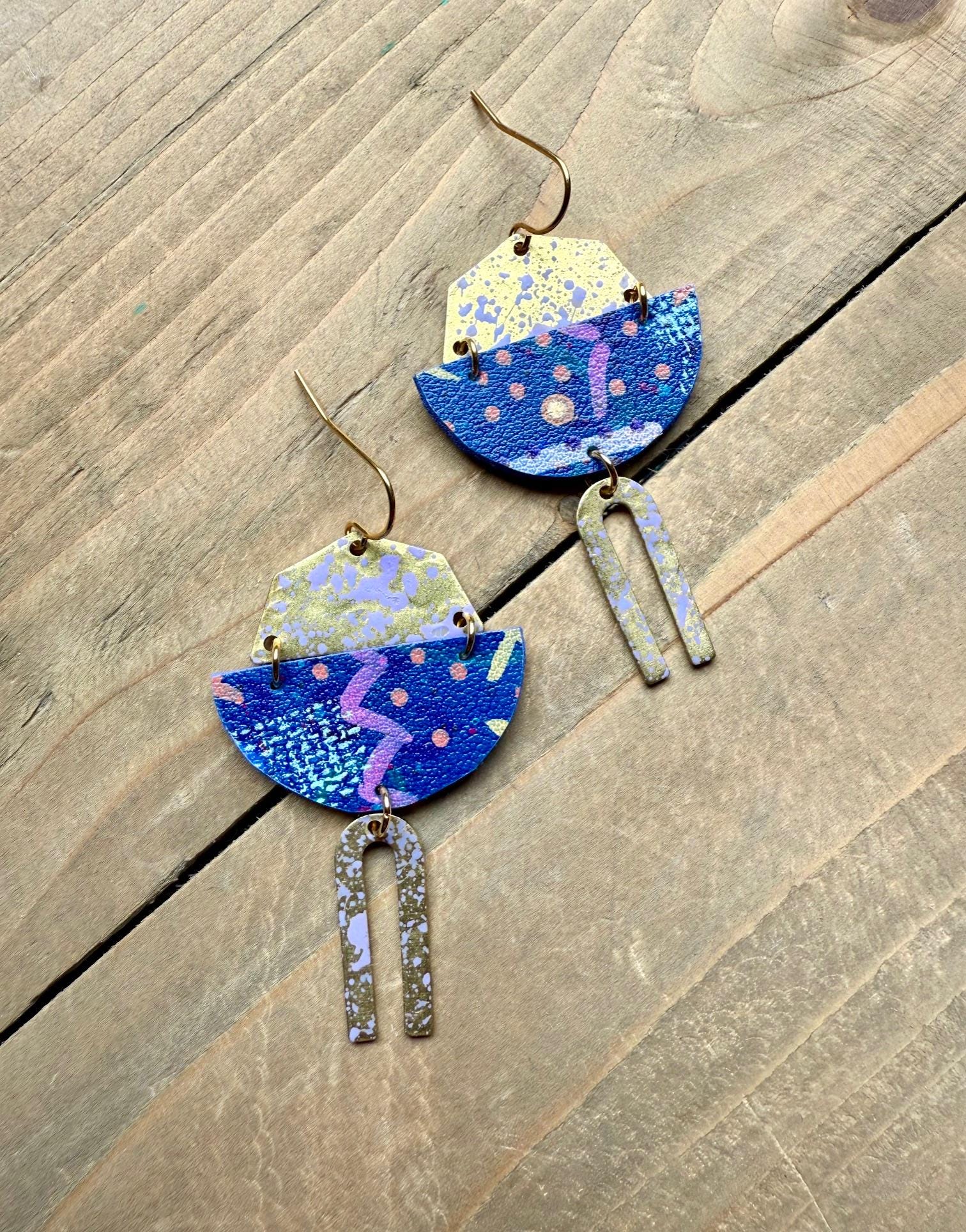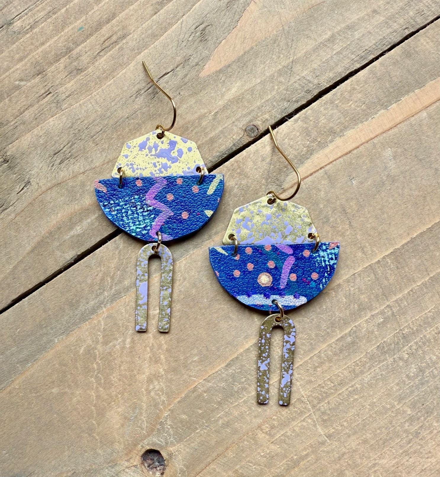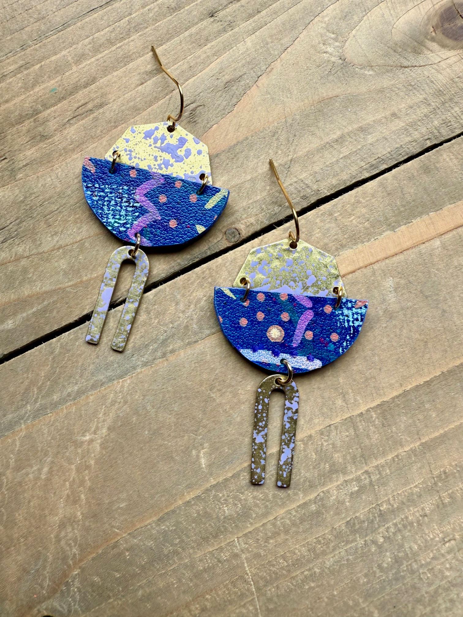 Mix Media Dangle Earrings are formed from solid brass and hand painted vegan leather. Finished with a matte protective sealant. Each pair of earrings are one of a kind, please allow some slight variances in design and color.