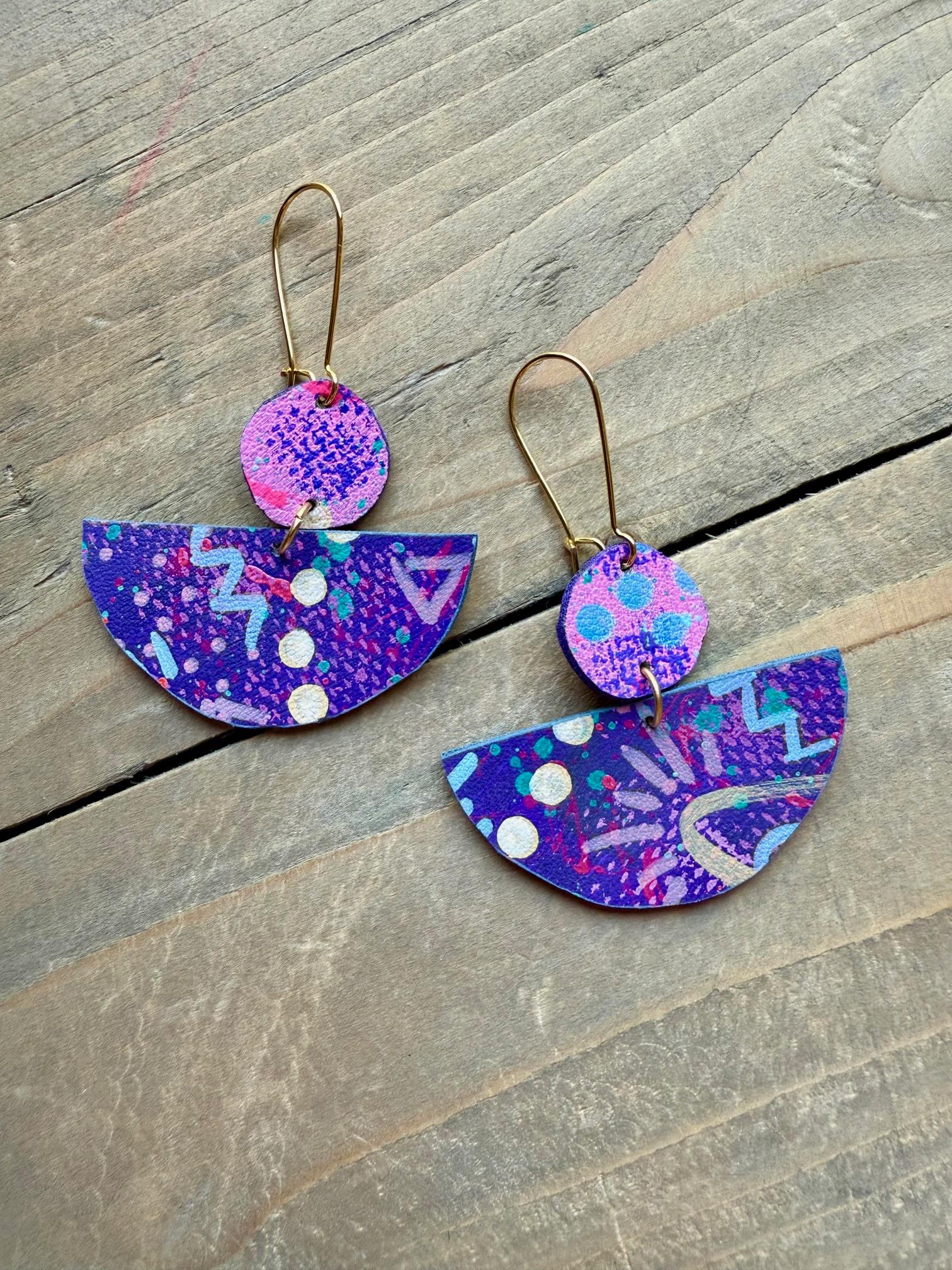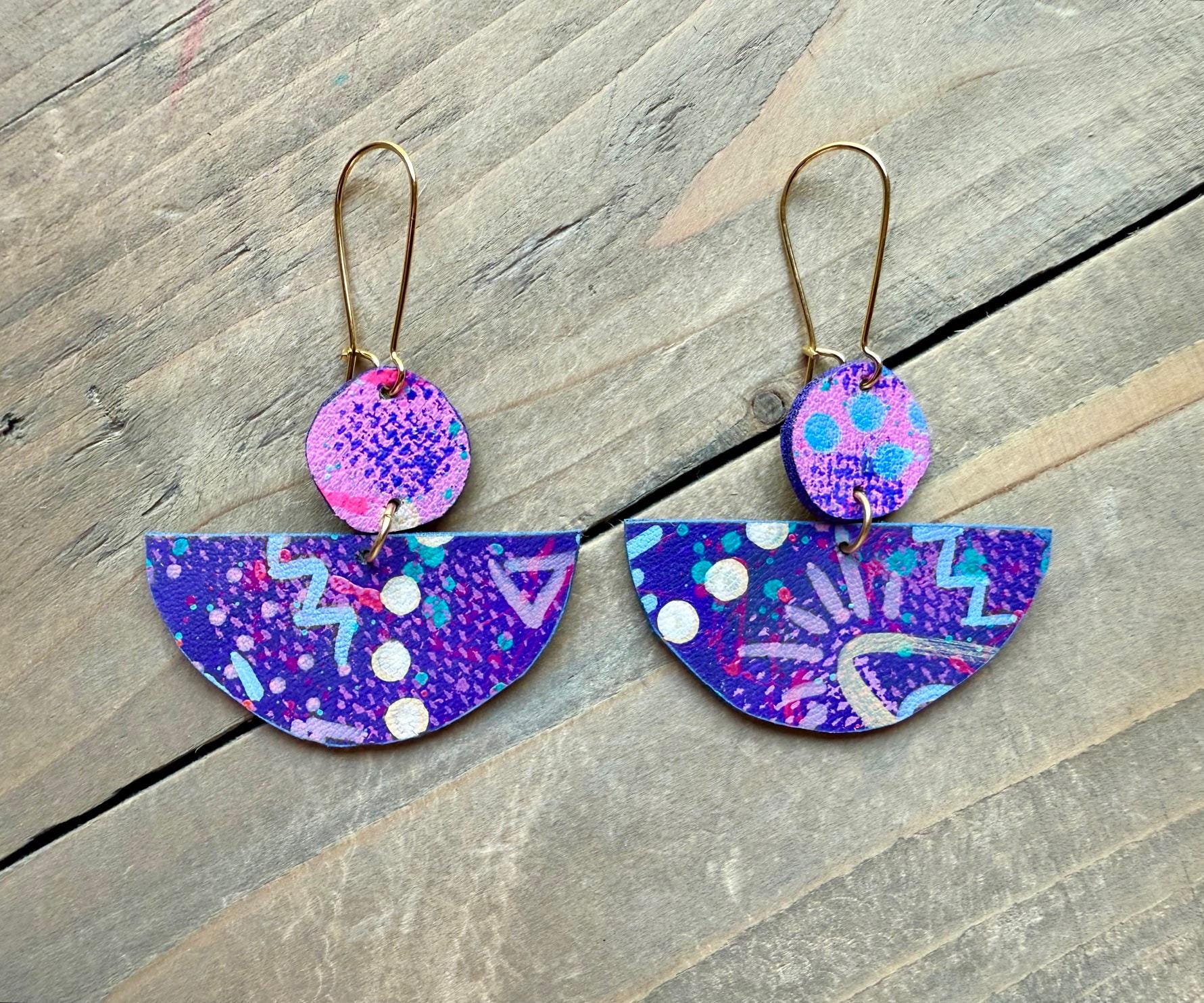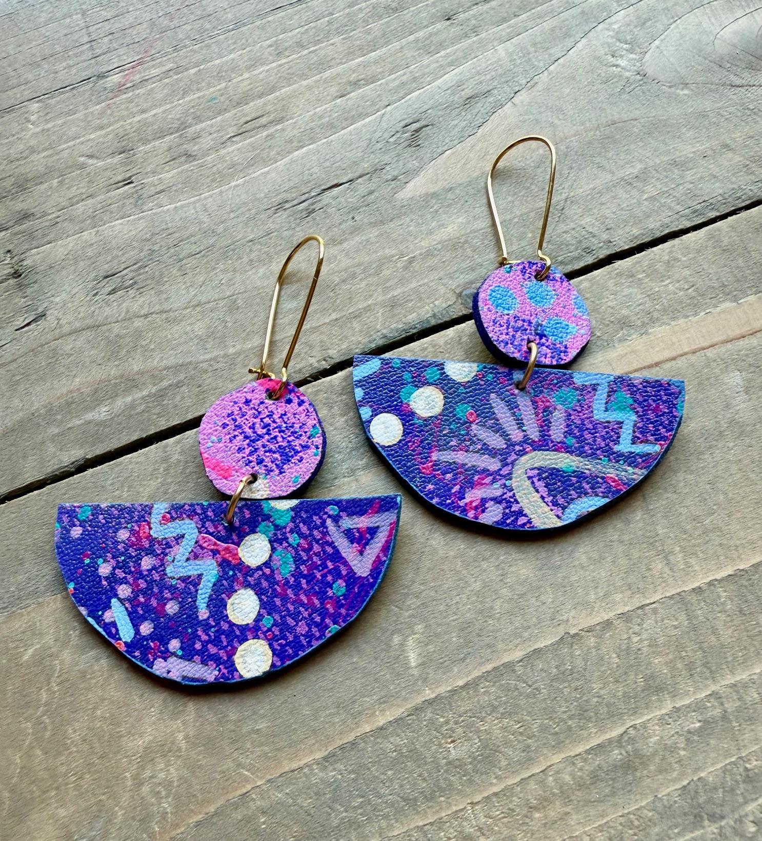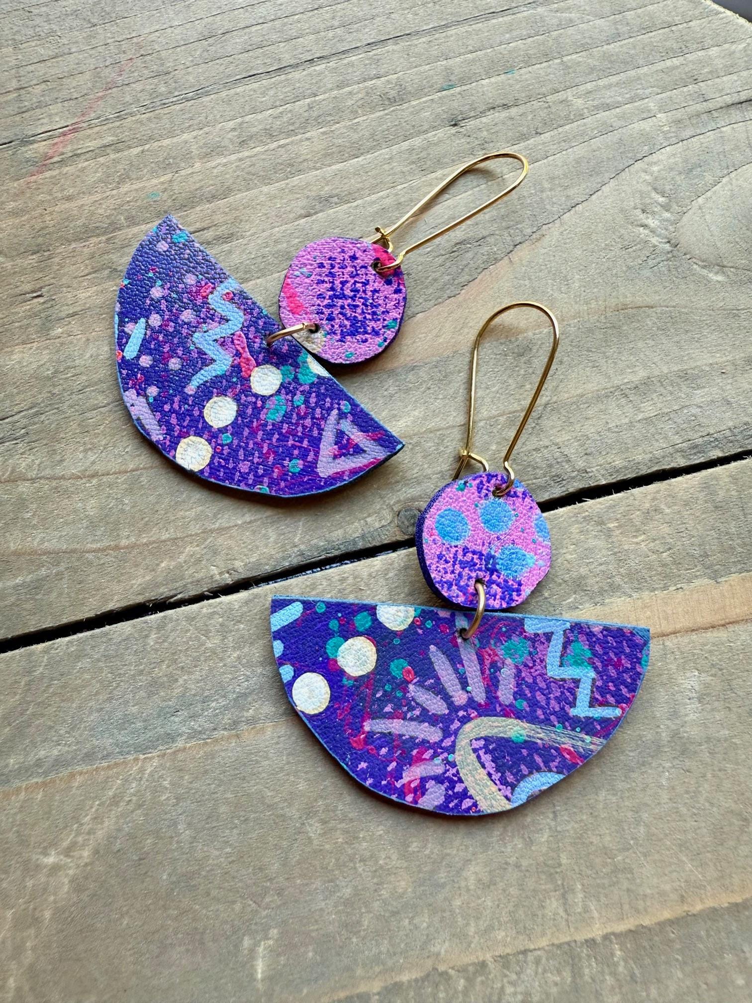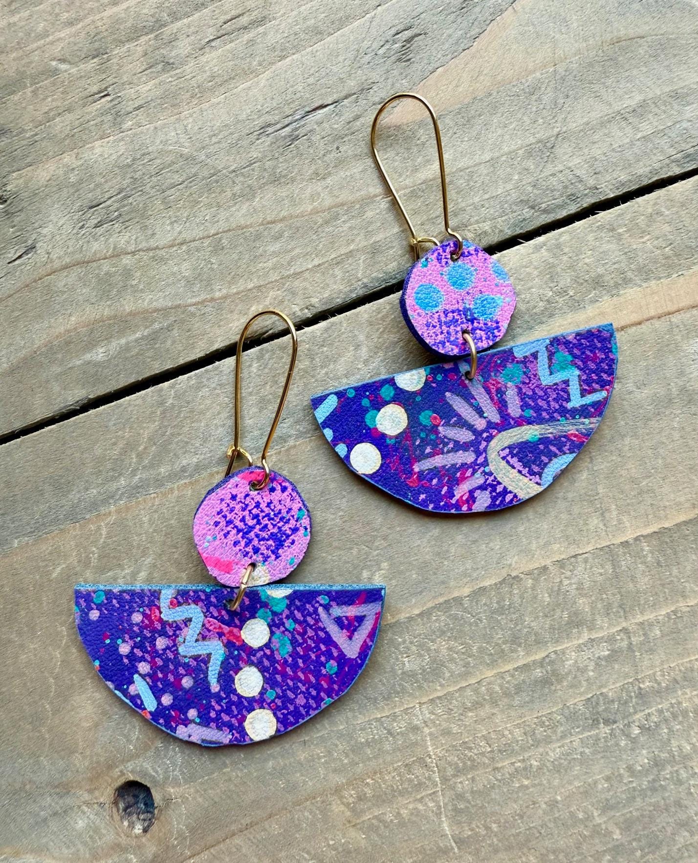 Earrings are hand painted - Vegan leather shapes are hand painted with geometric designs and small details. Each pair of earrings are one of a kind, please allow some slight variances in design and color.