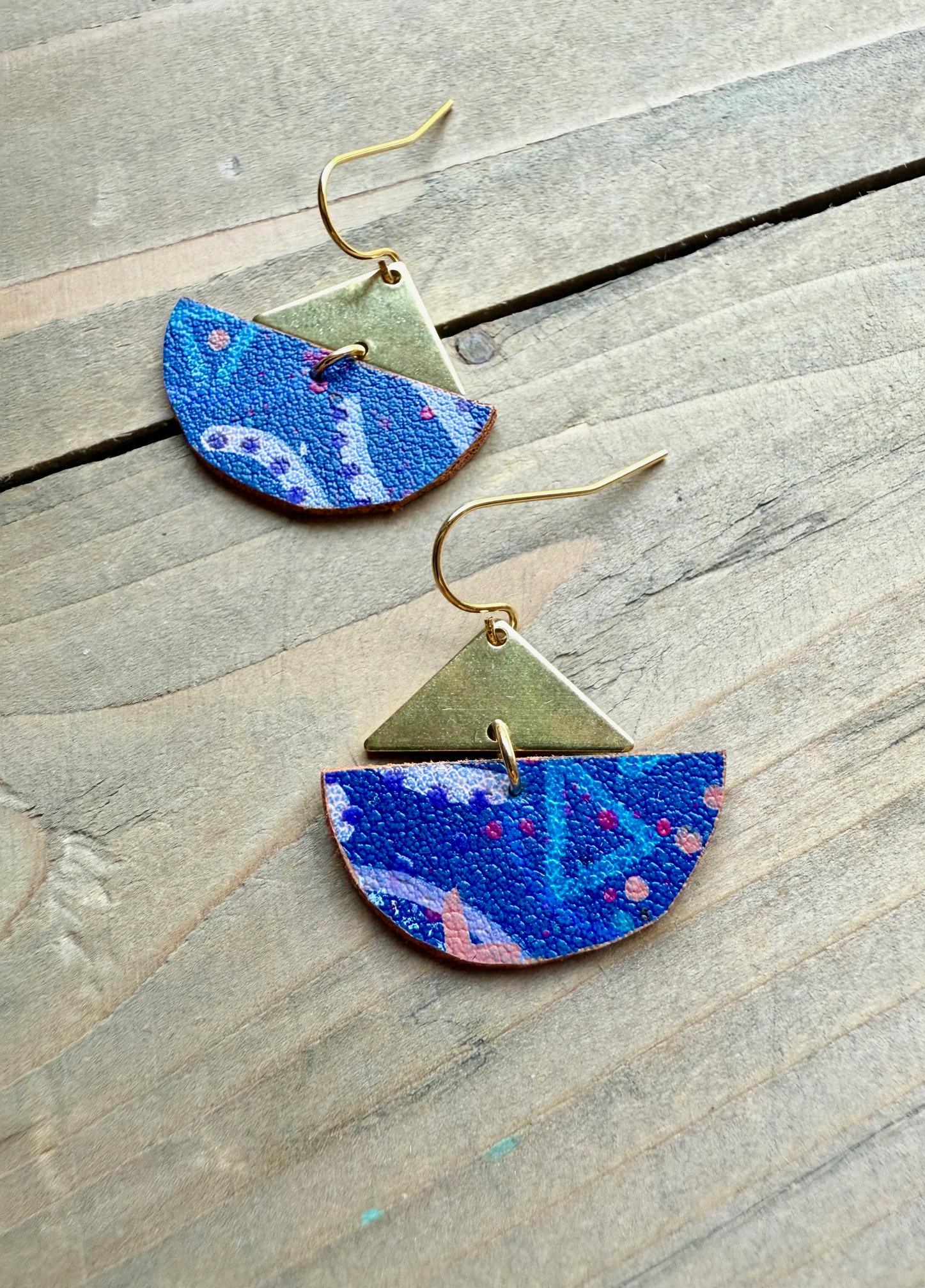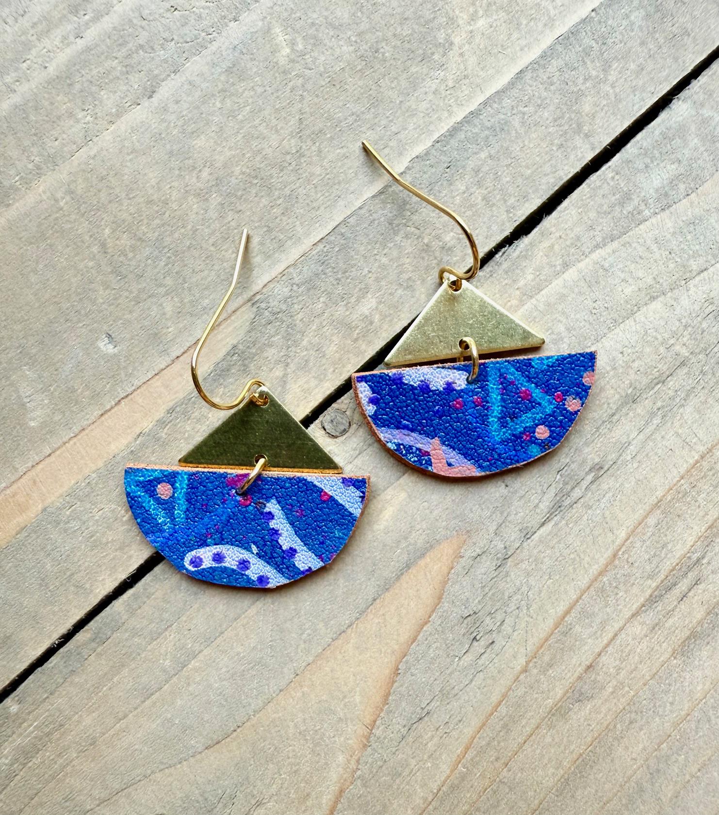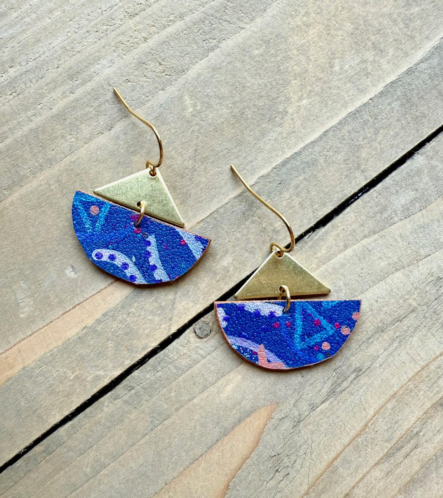 Mix Media Dangle Earrings are formed from solid brass and hand painted vegan leather. Finished with a matte protective sealant. Each pair of earrings are one of a kind, please allow some slight variances in design and color.