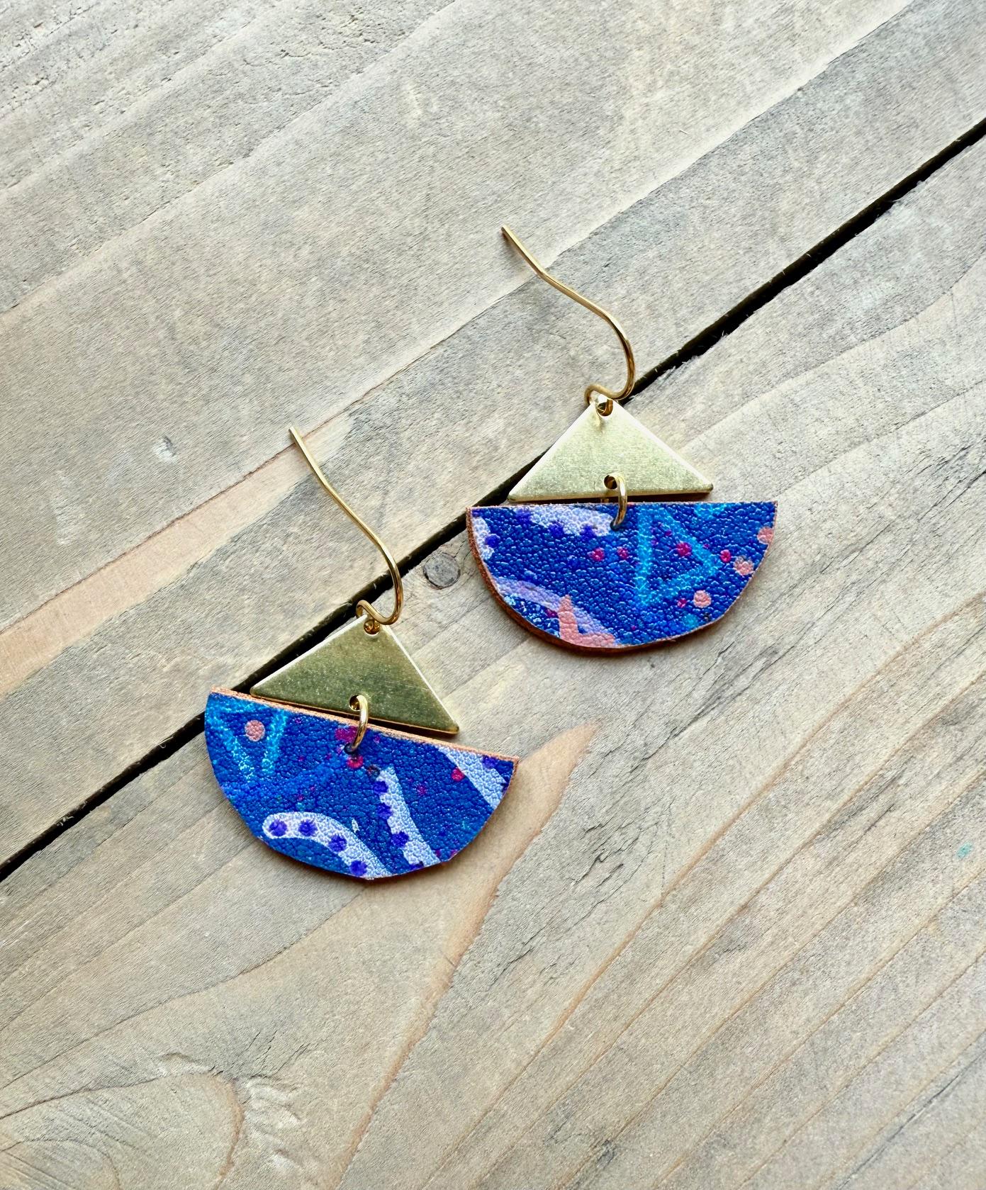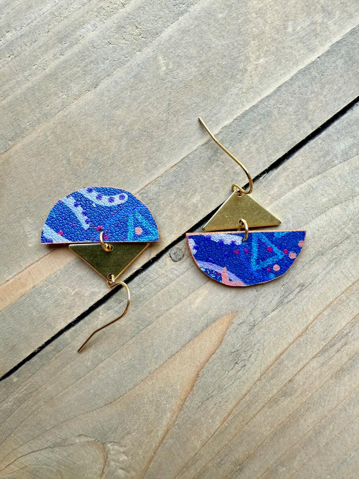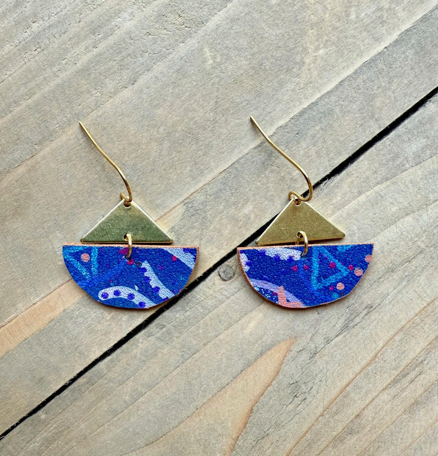 Mix Media Dangle Earrings are formed from solid brass and hand painted vegan leather. Finished with a matte protective sealant. Each pair of earrings are one of a kind, please allow some slight variances in design and color.