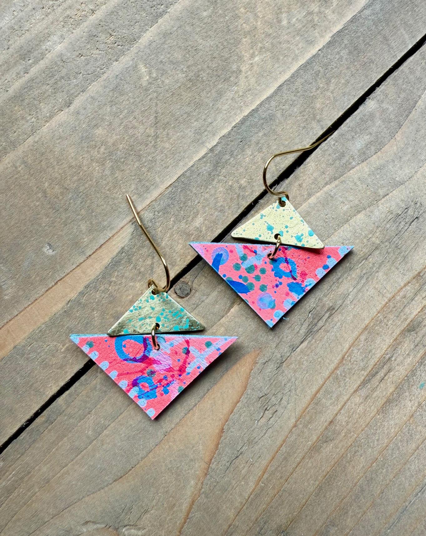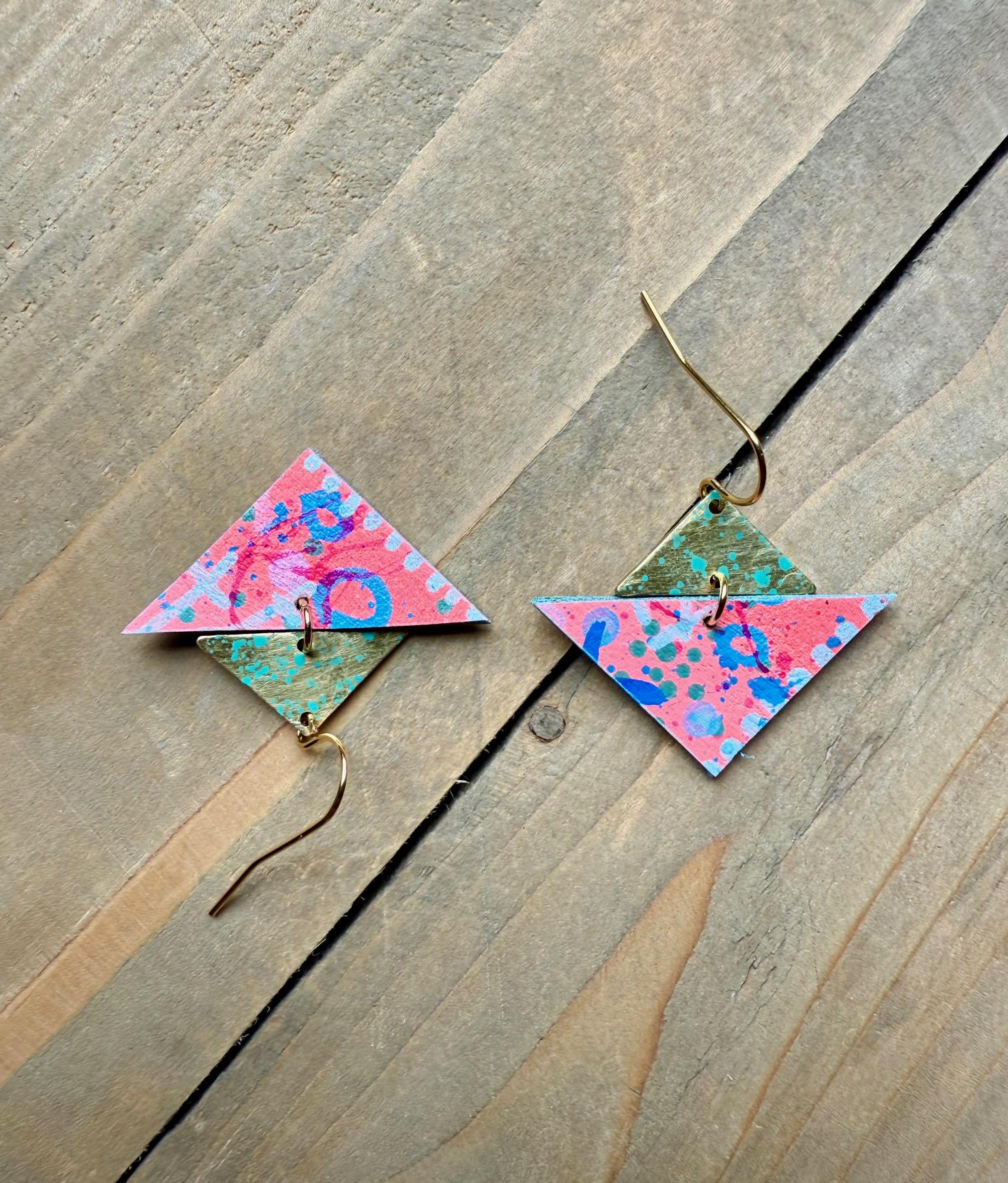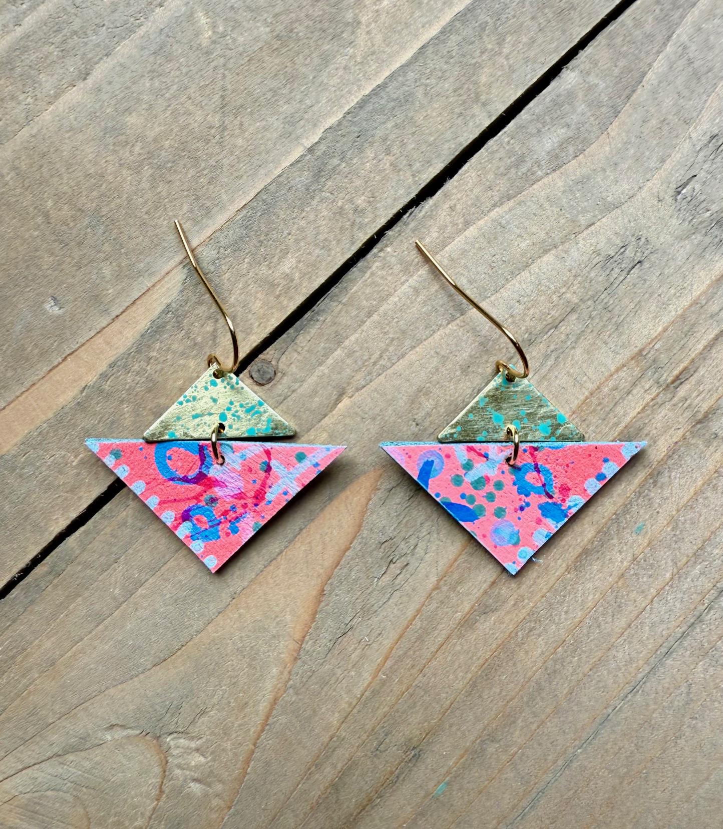 Mix Media Dangle Earrings are formed from solid brass and hand painted vegan leather. Finished with a matte protective sealant. Each pair of earrings are one of a kind, please allow some slight variances in design and color.