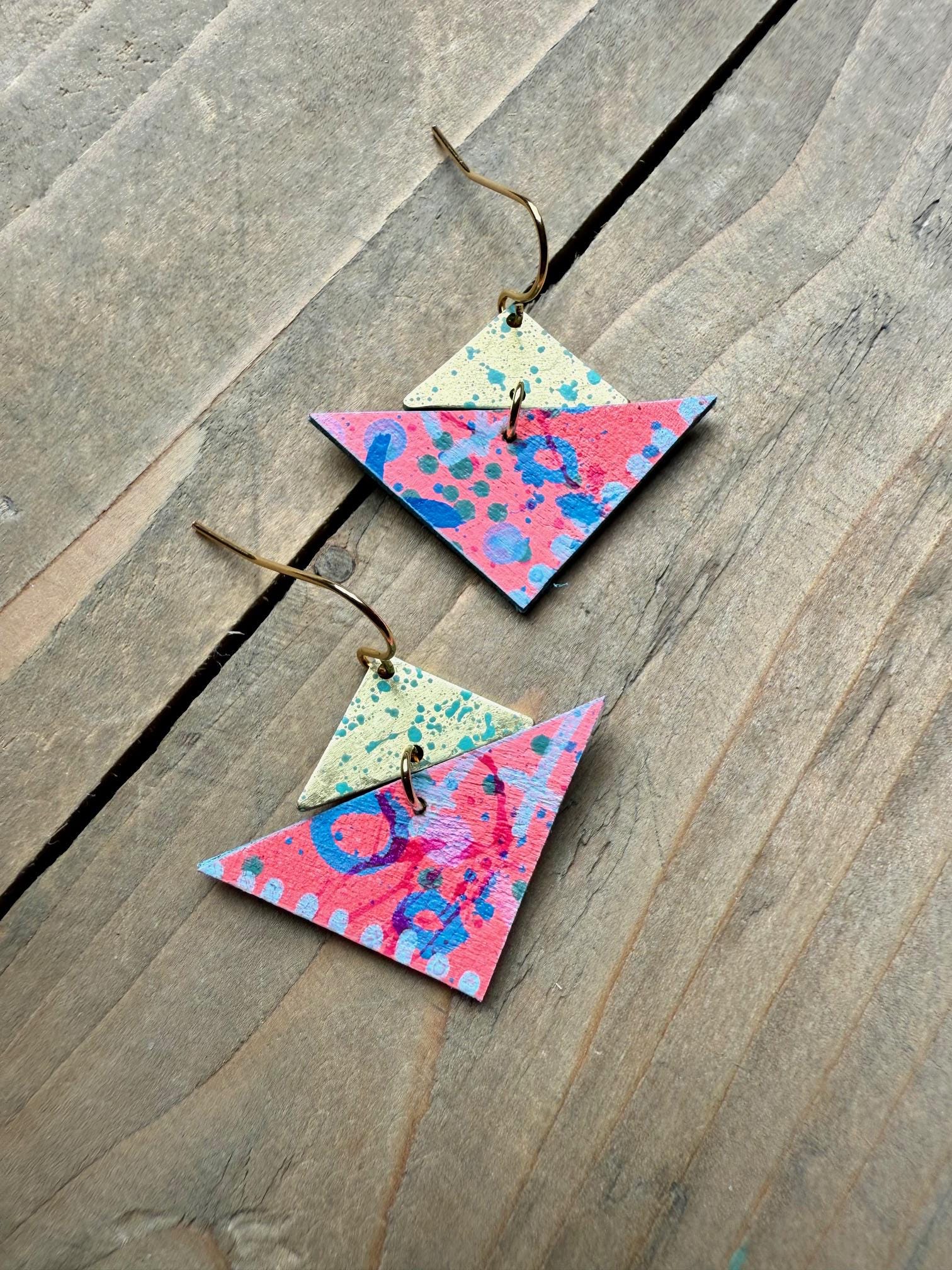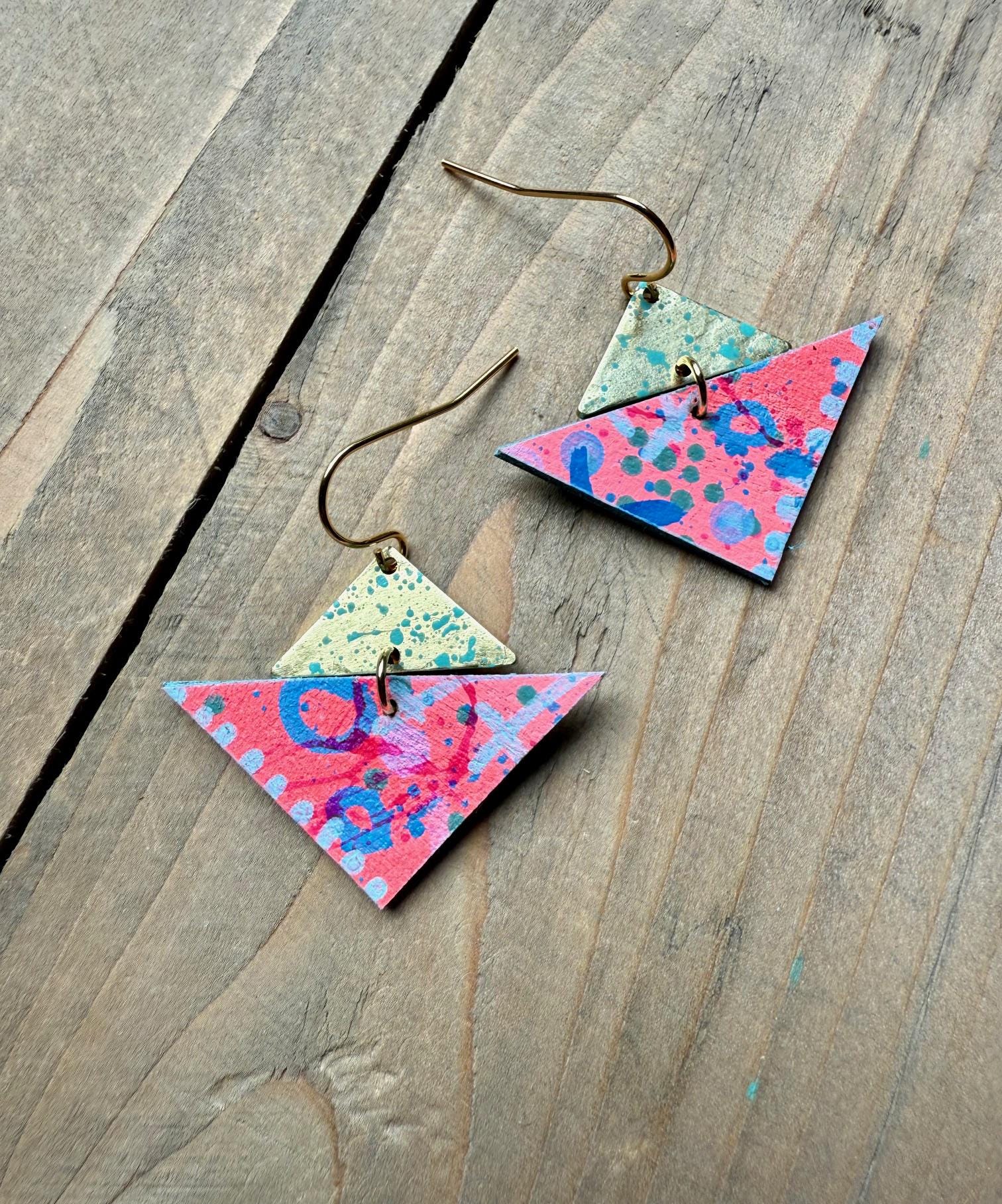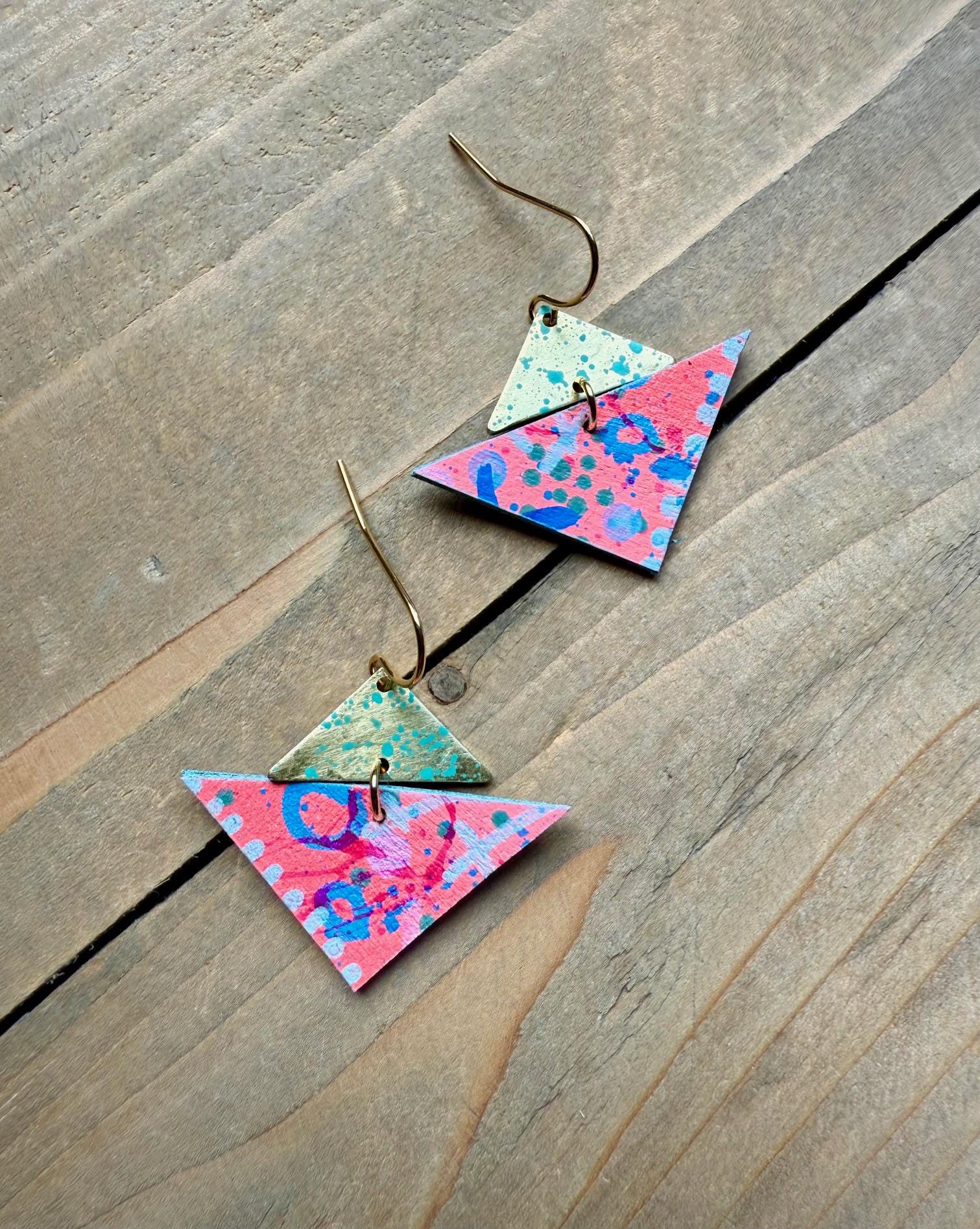 Mix Media Dangle Earrings are formed from solid brass and hand painted vegan leather. Finished with a matte protective sealant. Each pair of earrings are one of a kind, please allow some slight variances in design and color.