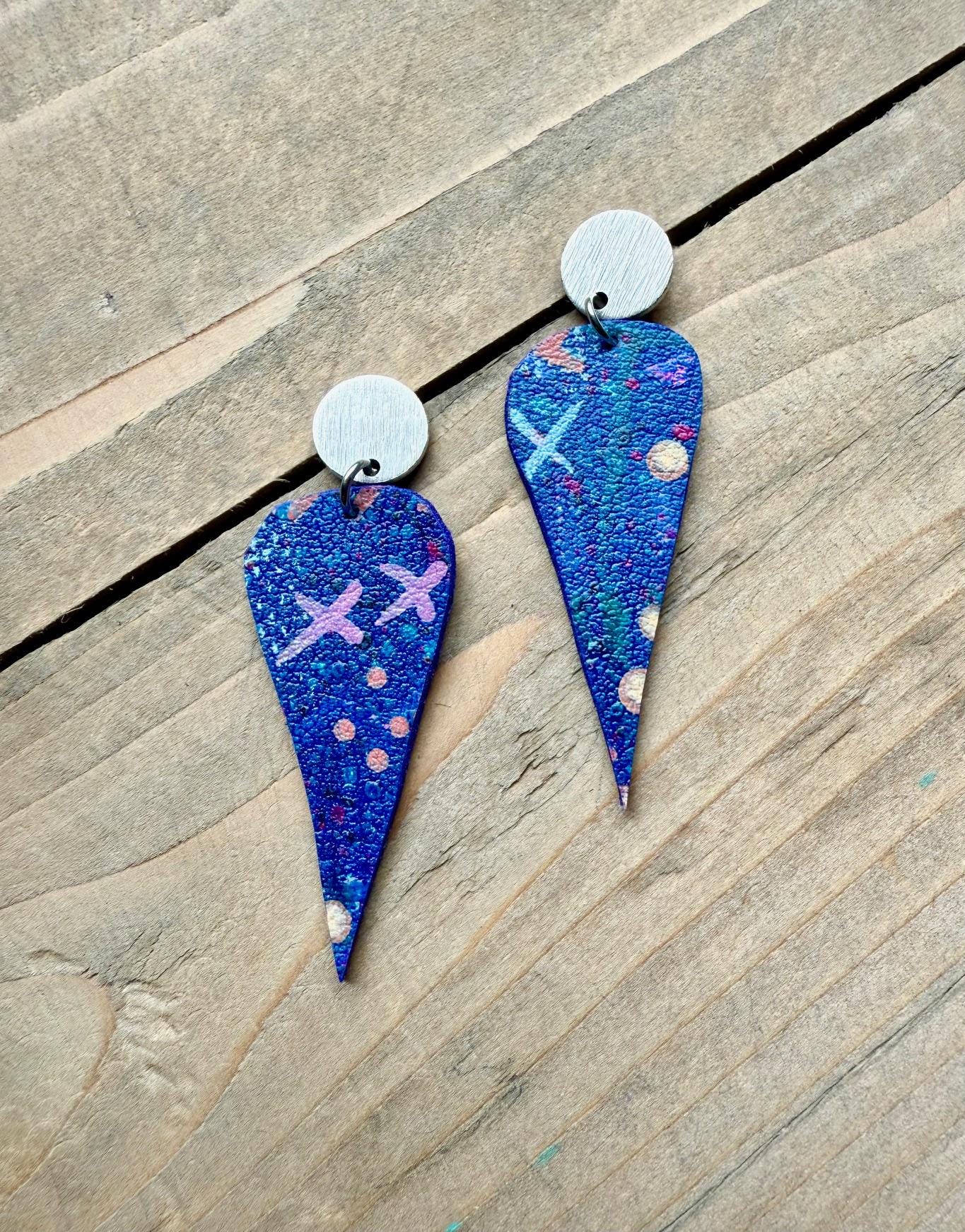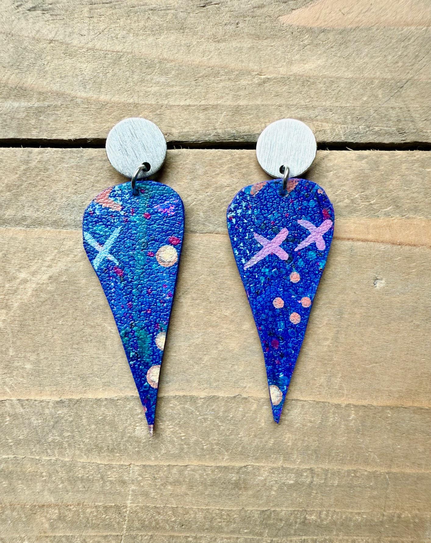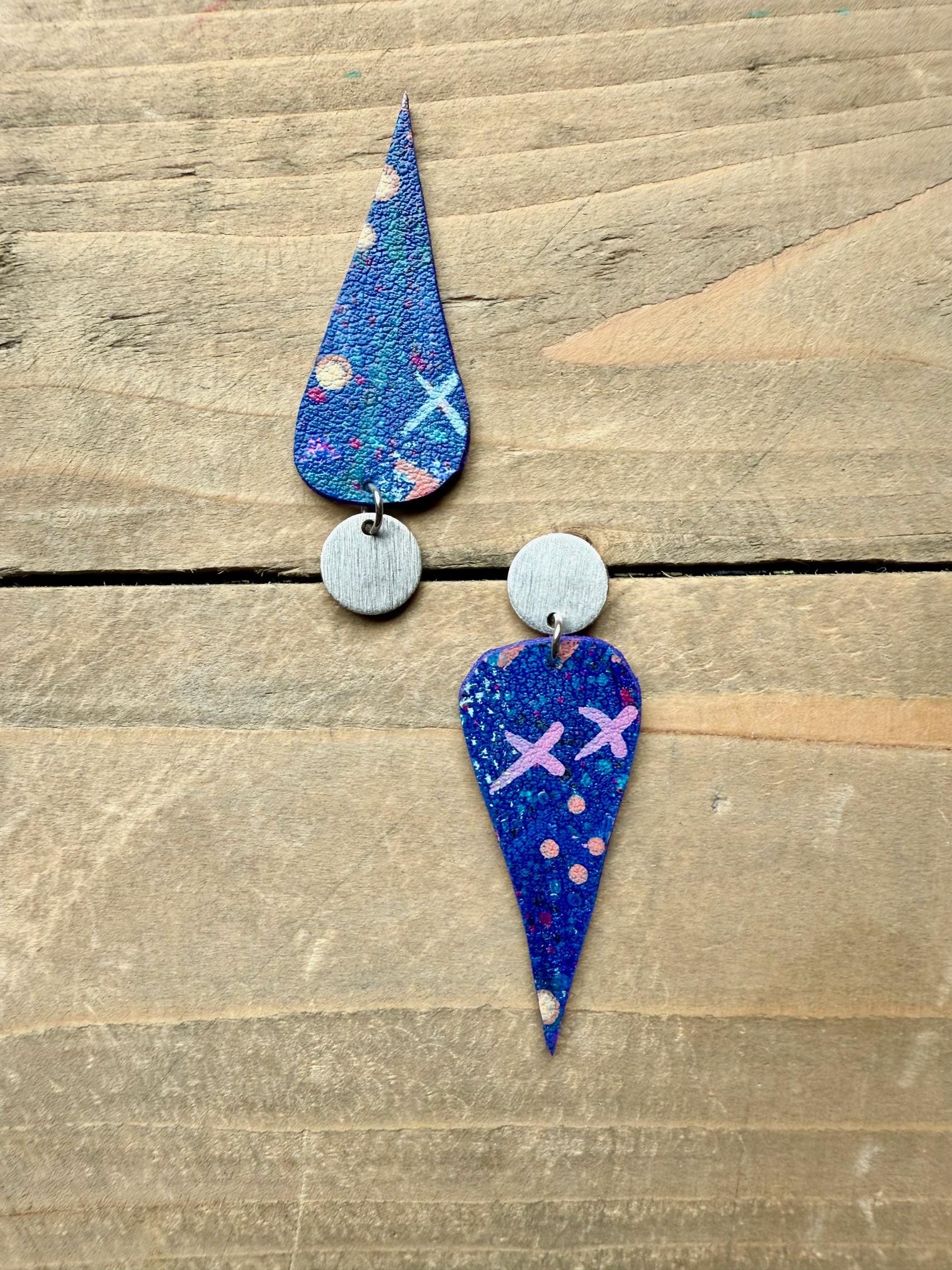 Mix Media Dangle Earrings are formed from silver-filled brass and hand painted vegan leather. Finished with a matte protective sealant. Each pair of earrings are one of a kind, please allow some slight variances in design and color.