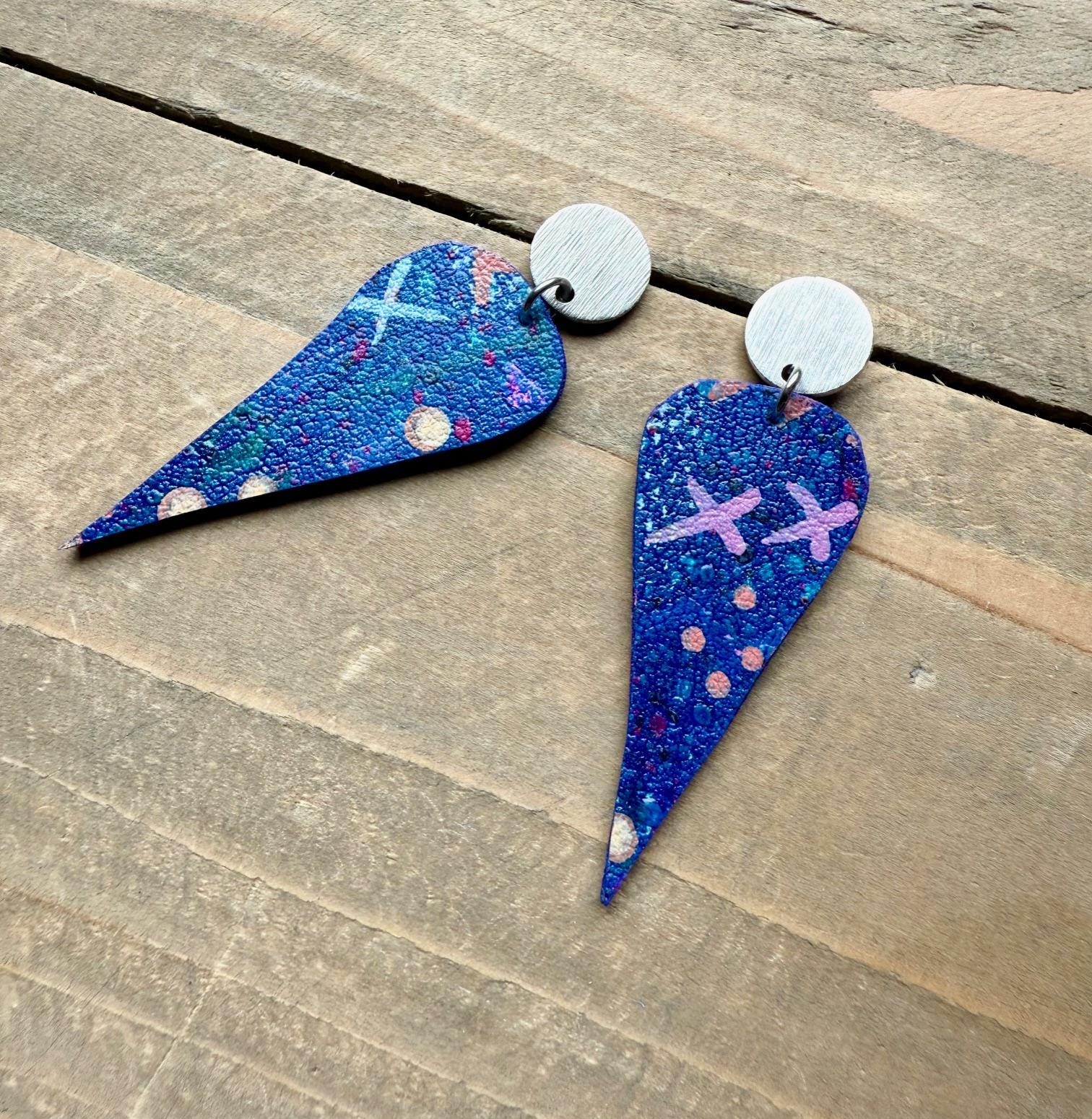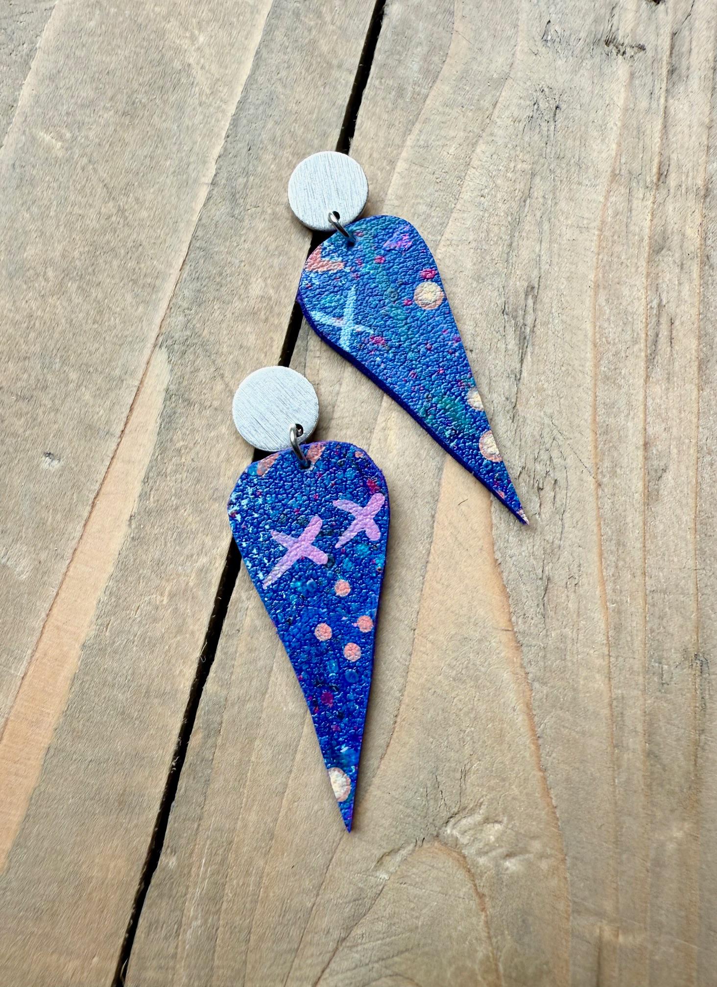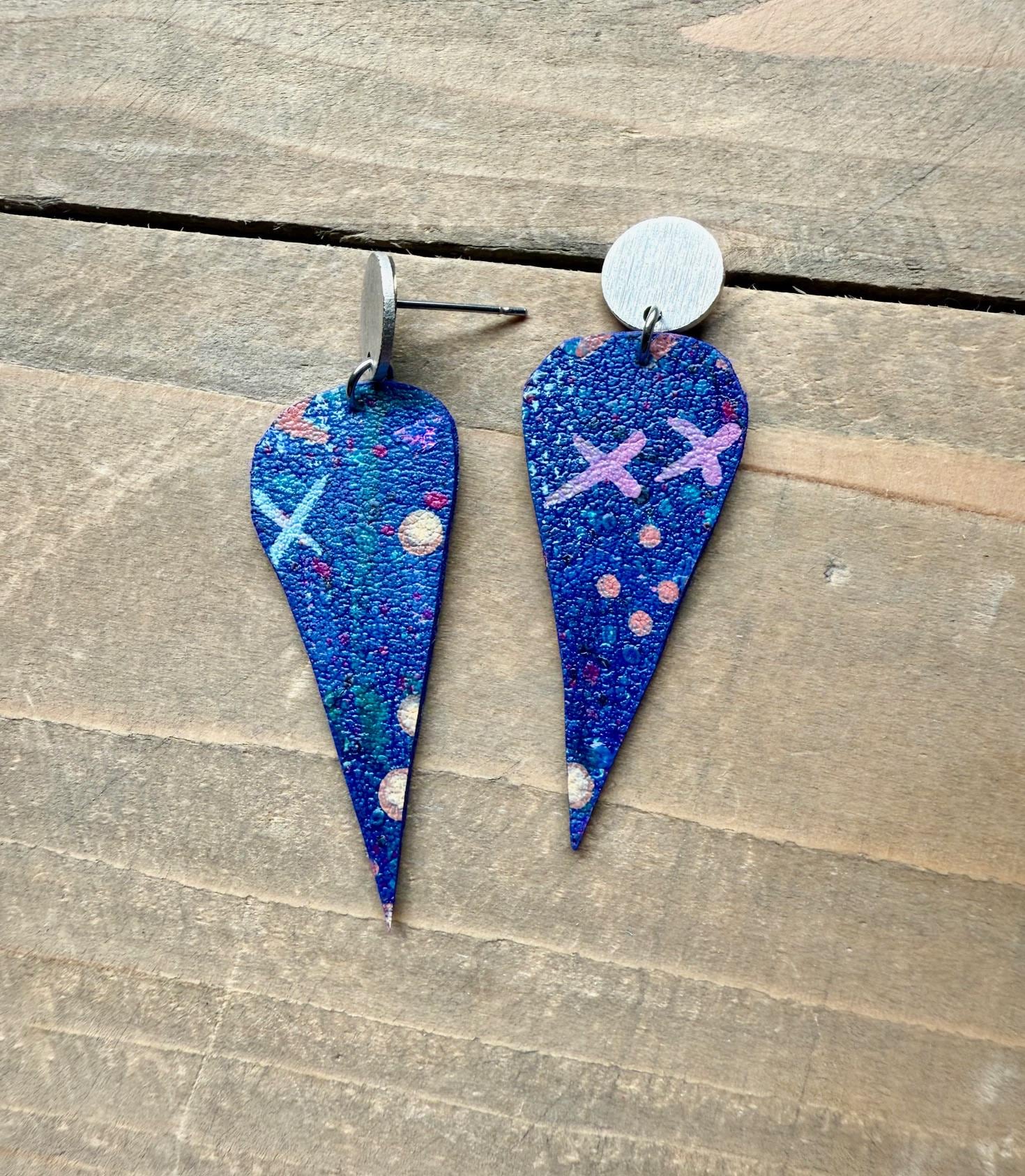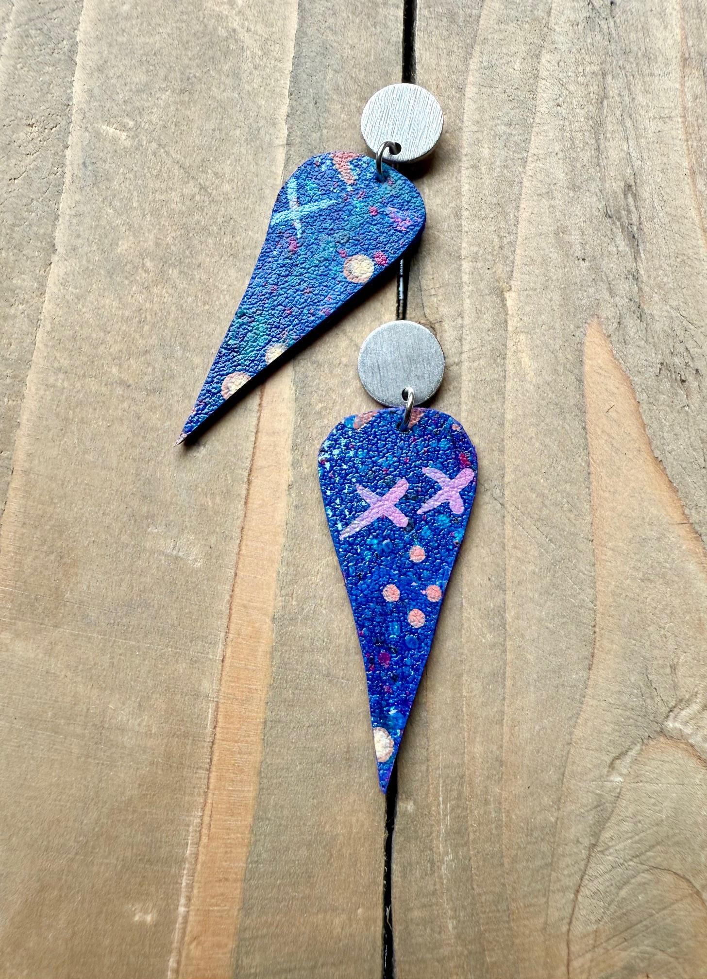 Mix Media Dangle Earrings are formed from silver-filled brass and hand painted vegan leather. Finished with a matte protective sealant. Each pair of earrings are one of a kind, please allow some slight variances in design and color.