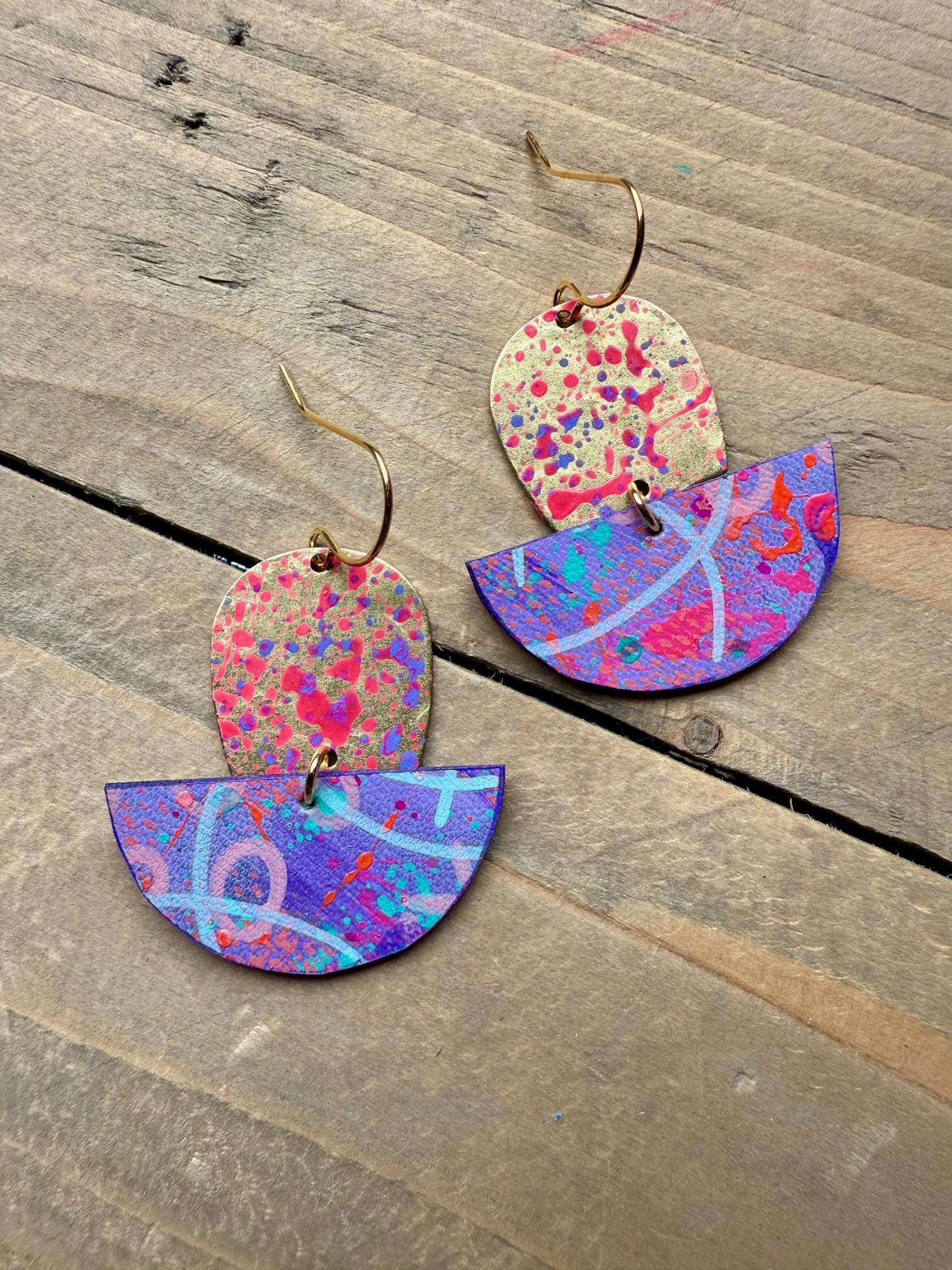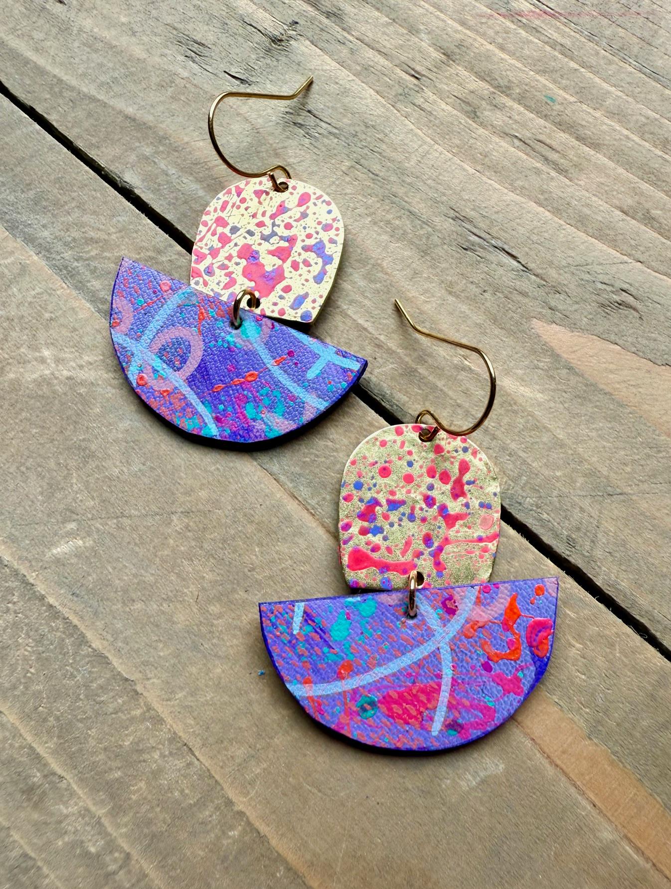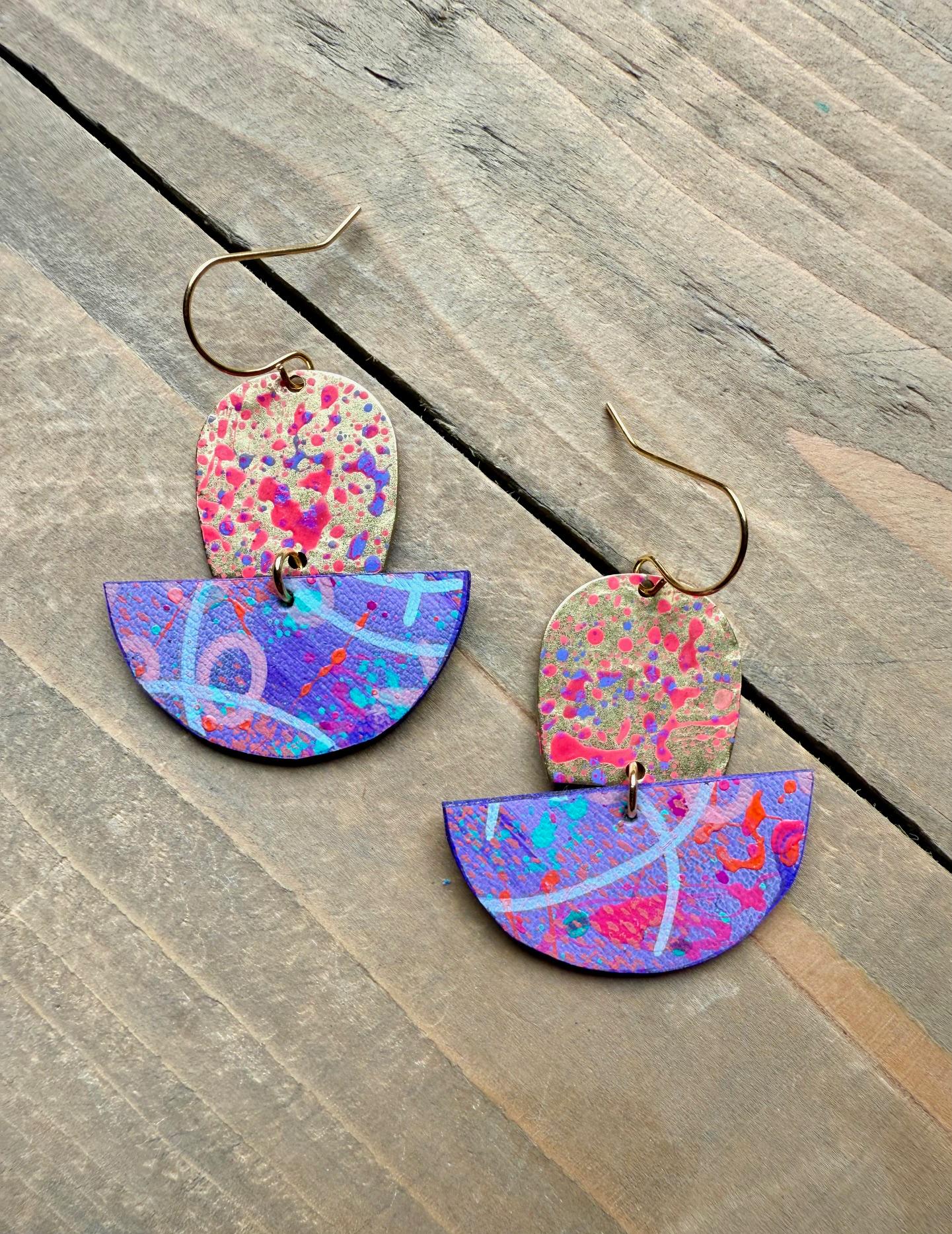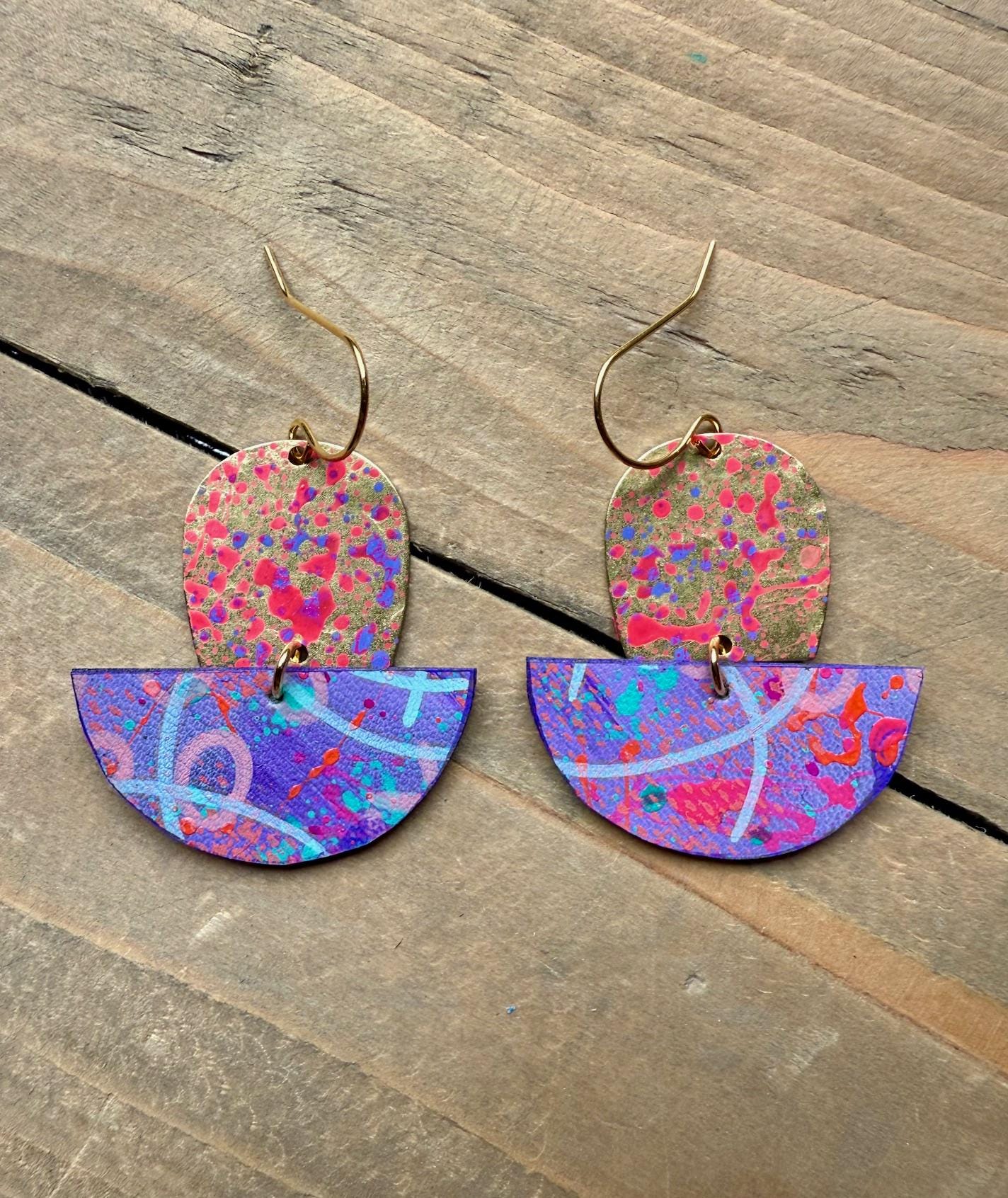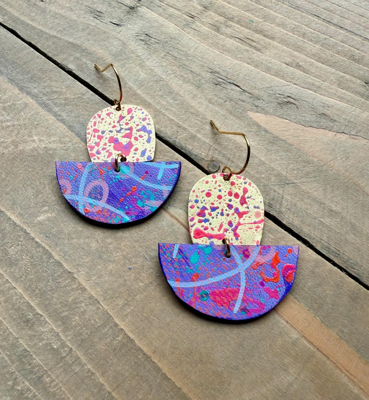 Earrings are hand painted - Solid brass has a magenta splatter pattern and vegan leather half circles are hand painted with geometric designs and small details. Each pair of earrings are one of a kind, please allow some slight variances in design and color.