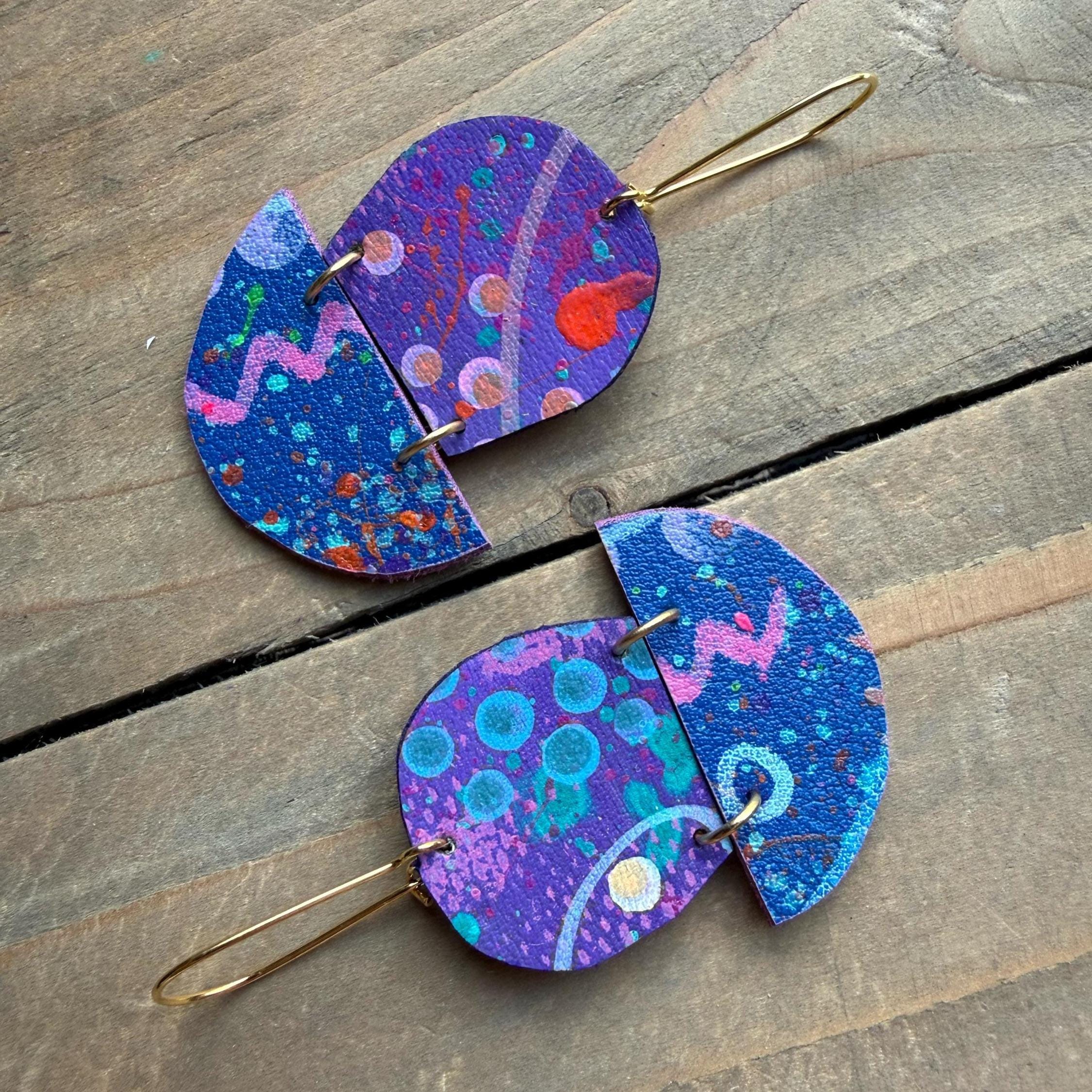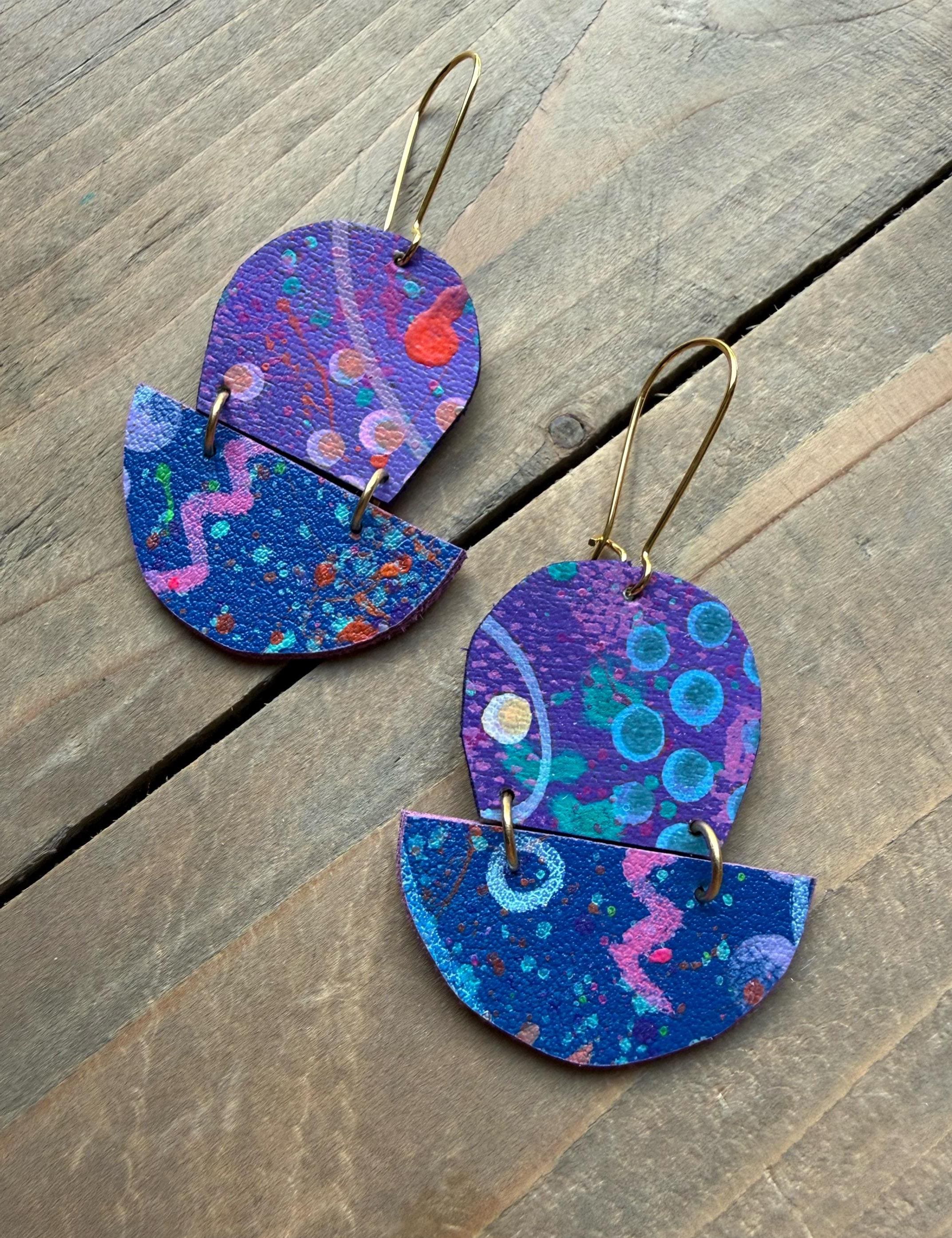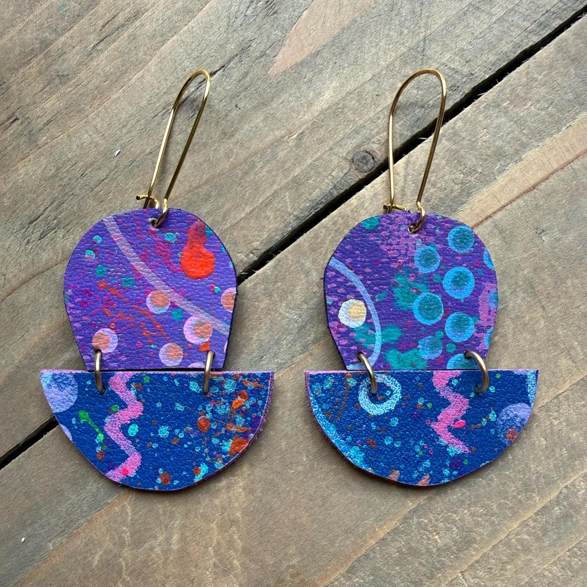 Vegan Leather Chandelier Earrings. Made from vegan leather and finished with layers of hand painted detail. Each pair of earrings are one of a kind, please allow some slight variances in design and color.