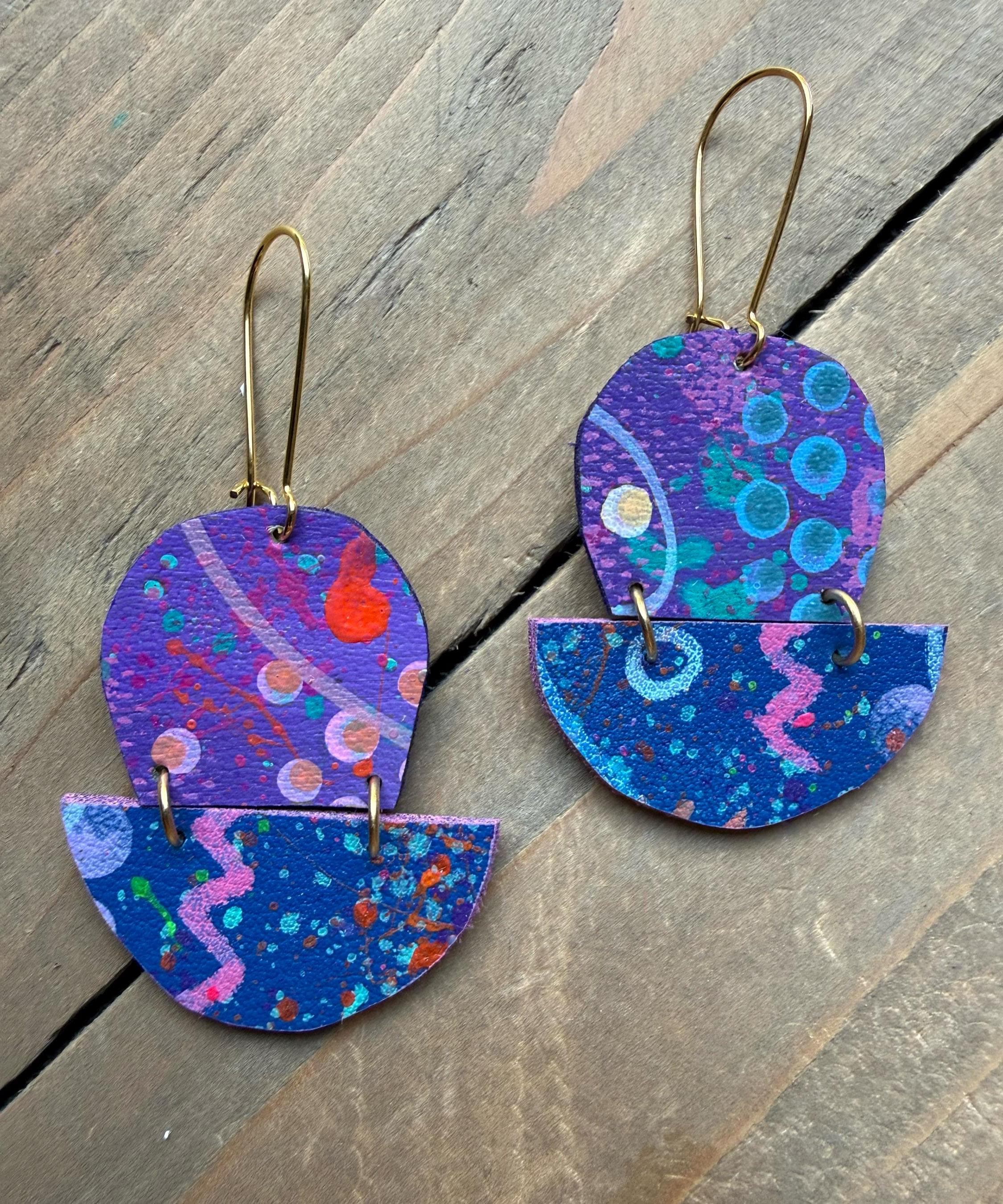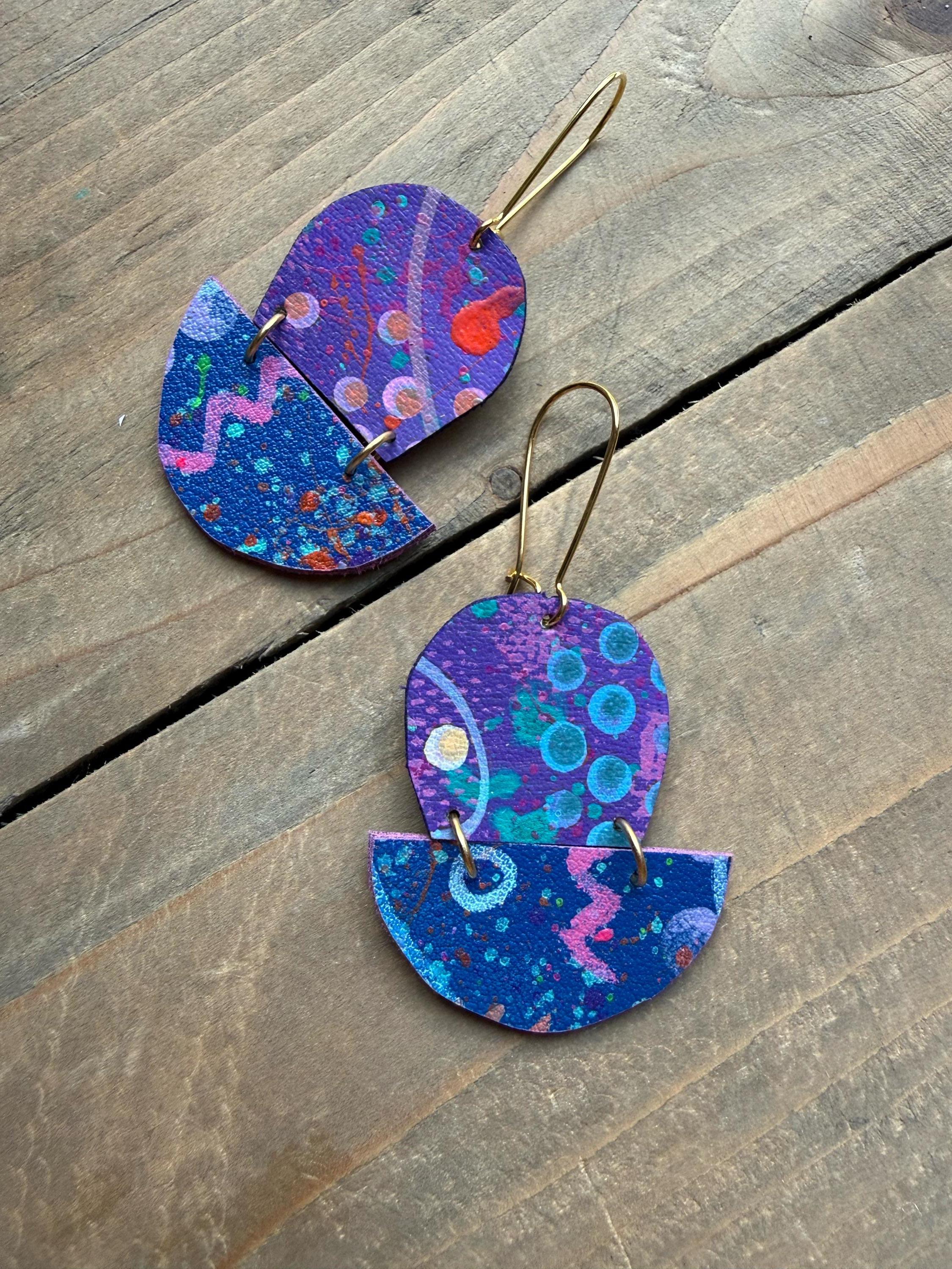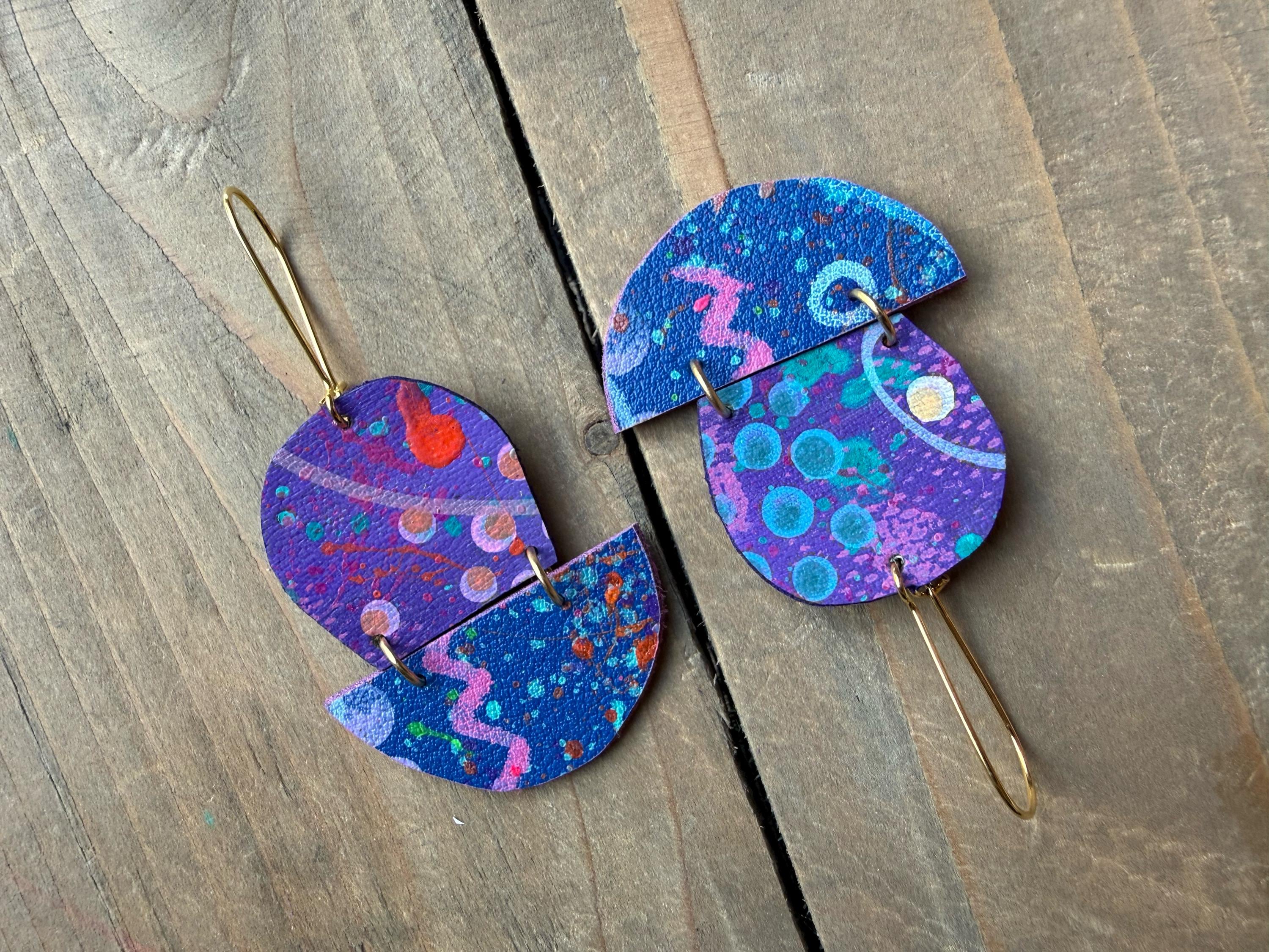 Vegan Leather Chandelier Earrings. Made from vegan leather and finished with layers of hand painted detail. Each pair of earrings are one of a kind, please allow some slight variances in design and color.